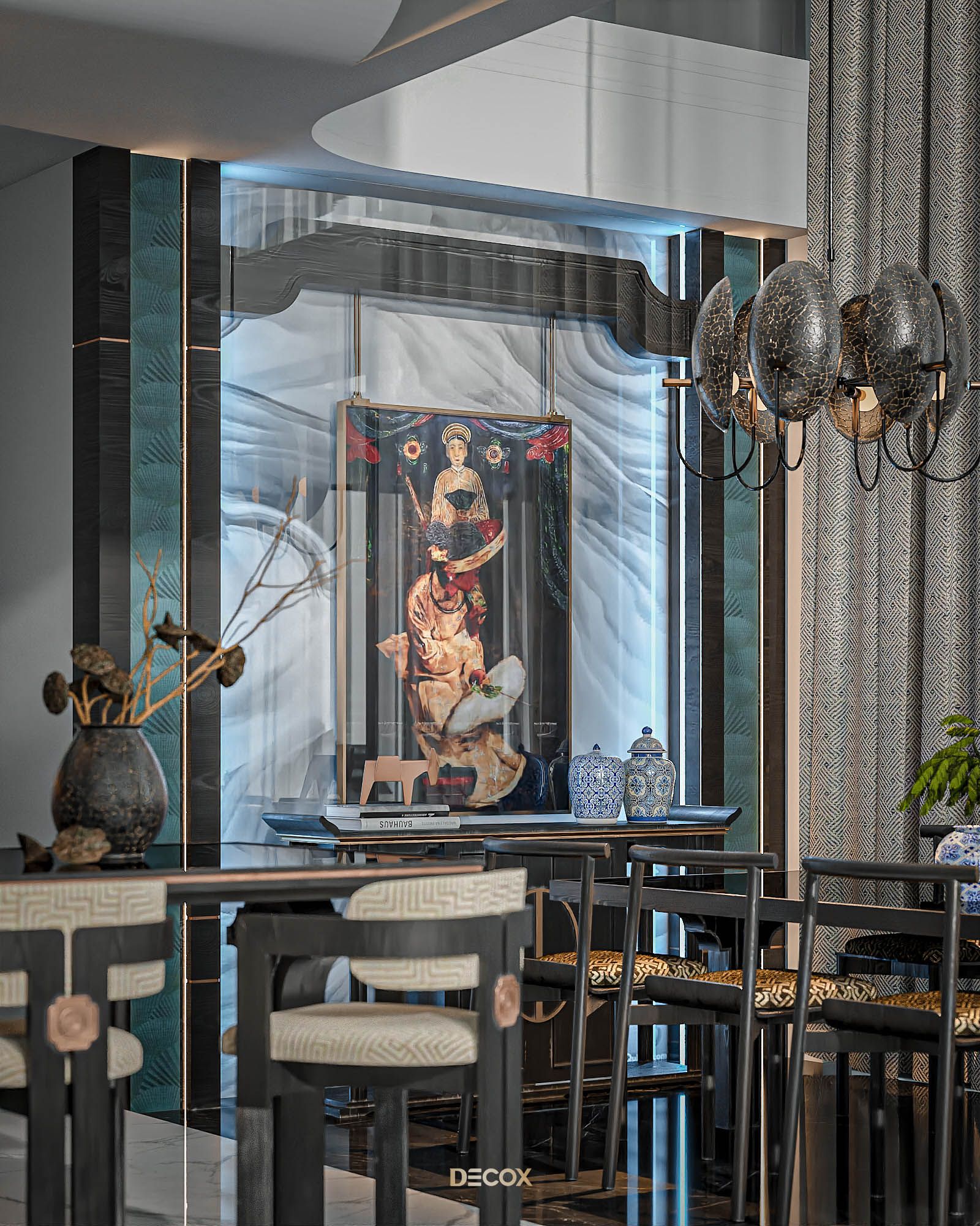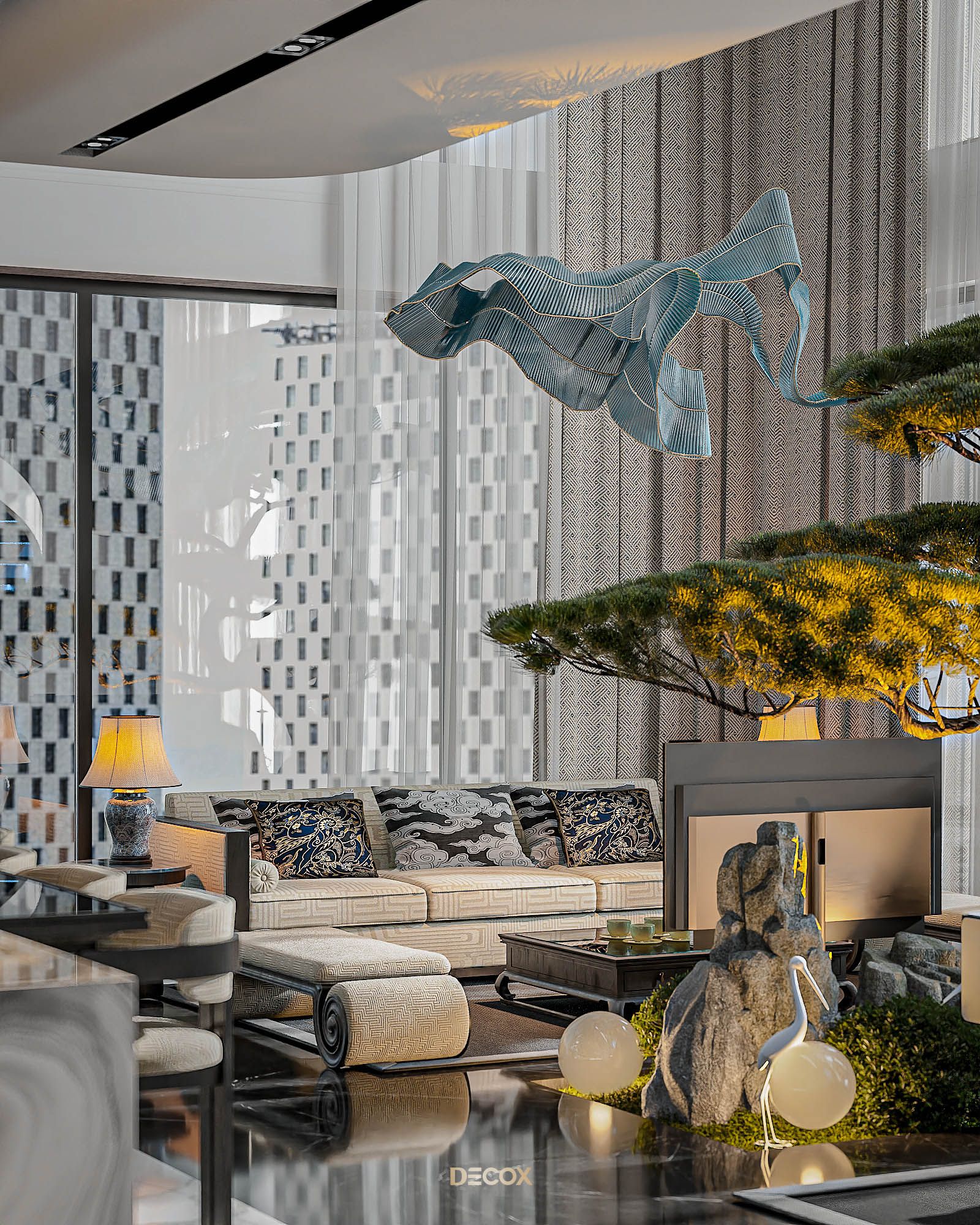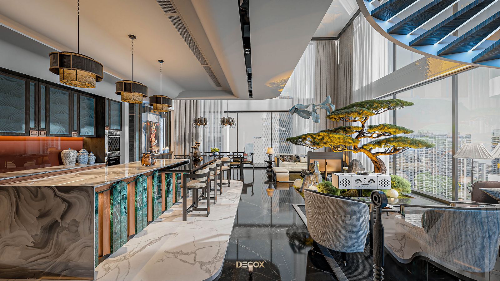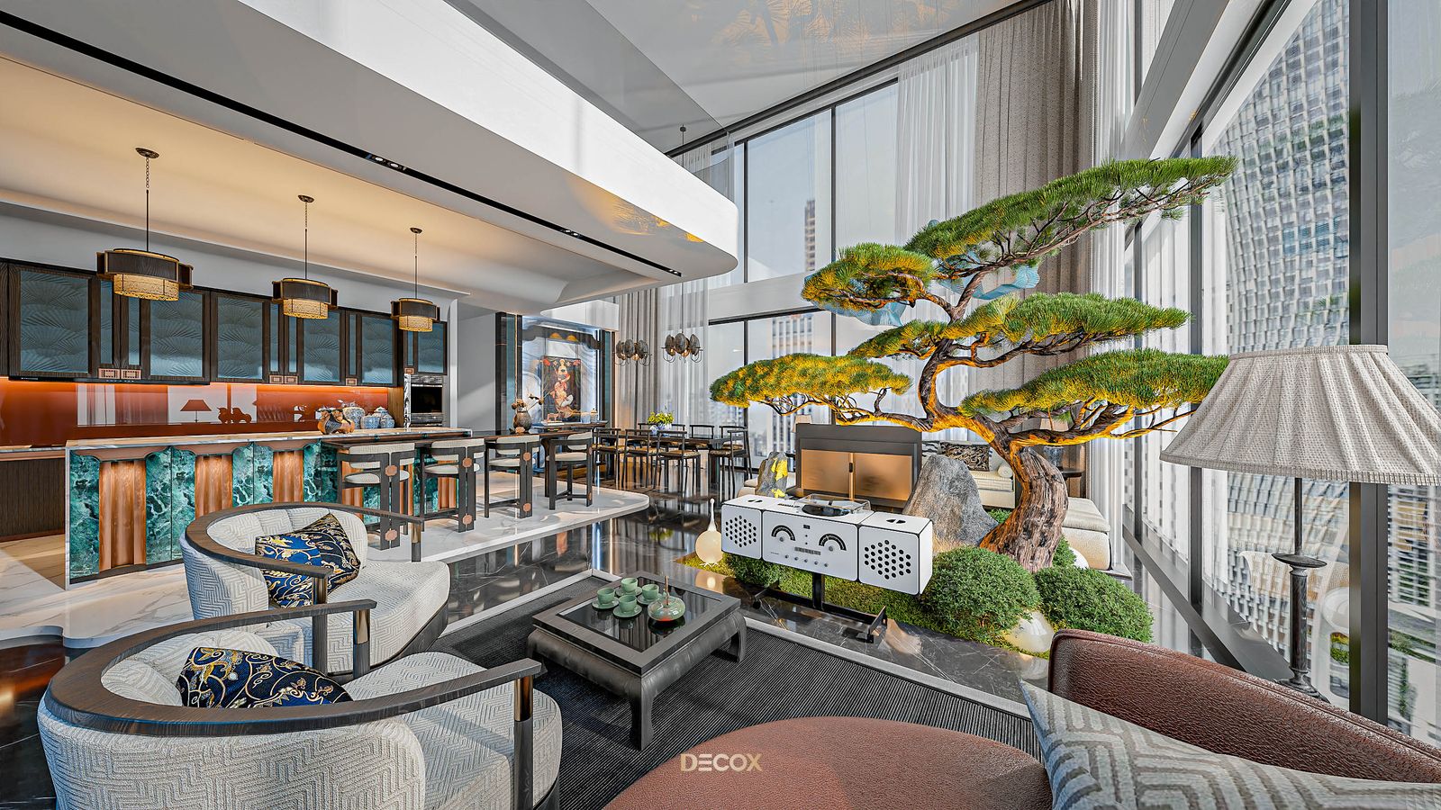 Xuyên suốt thiết kế nội thất là sự xuất hiện đan xen của hệ đồ nội thất sử dụng các texture hoa văn truyền thống kết hợp với những vật liệu mang tính hiện đại như đá xuyên sáng, kim loại,... Và "vườn" cây Bonsai, một biểu tượng mang tính chất cổ điển chính là mảnh ghép cuối cùng giúp không gian thêm trọn vẹn. Những hồi ức về một nét văn hóa truyền thống "vang bóng 1 thời” nay đã được sống lại dưới một hình thức mới: hiện đại, cao cấp, hi-end và tương lai hơn.