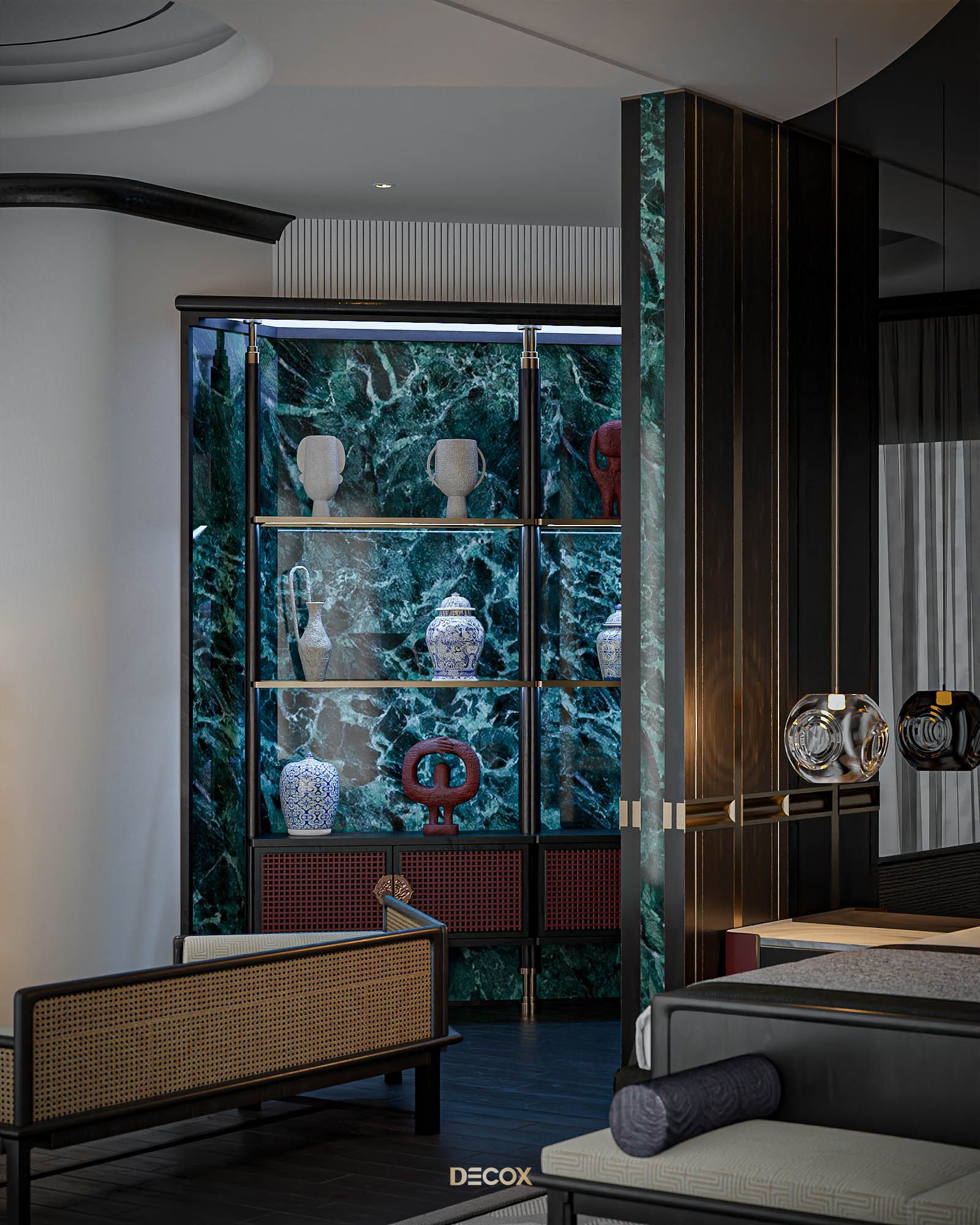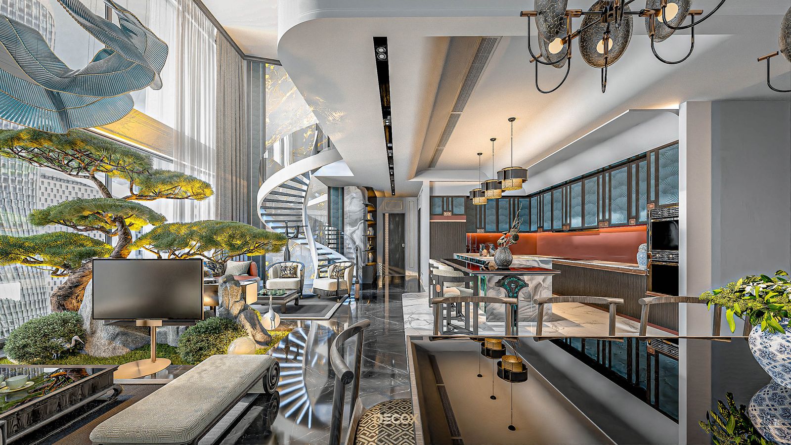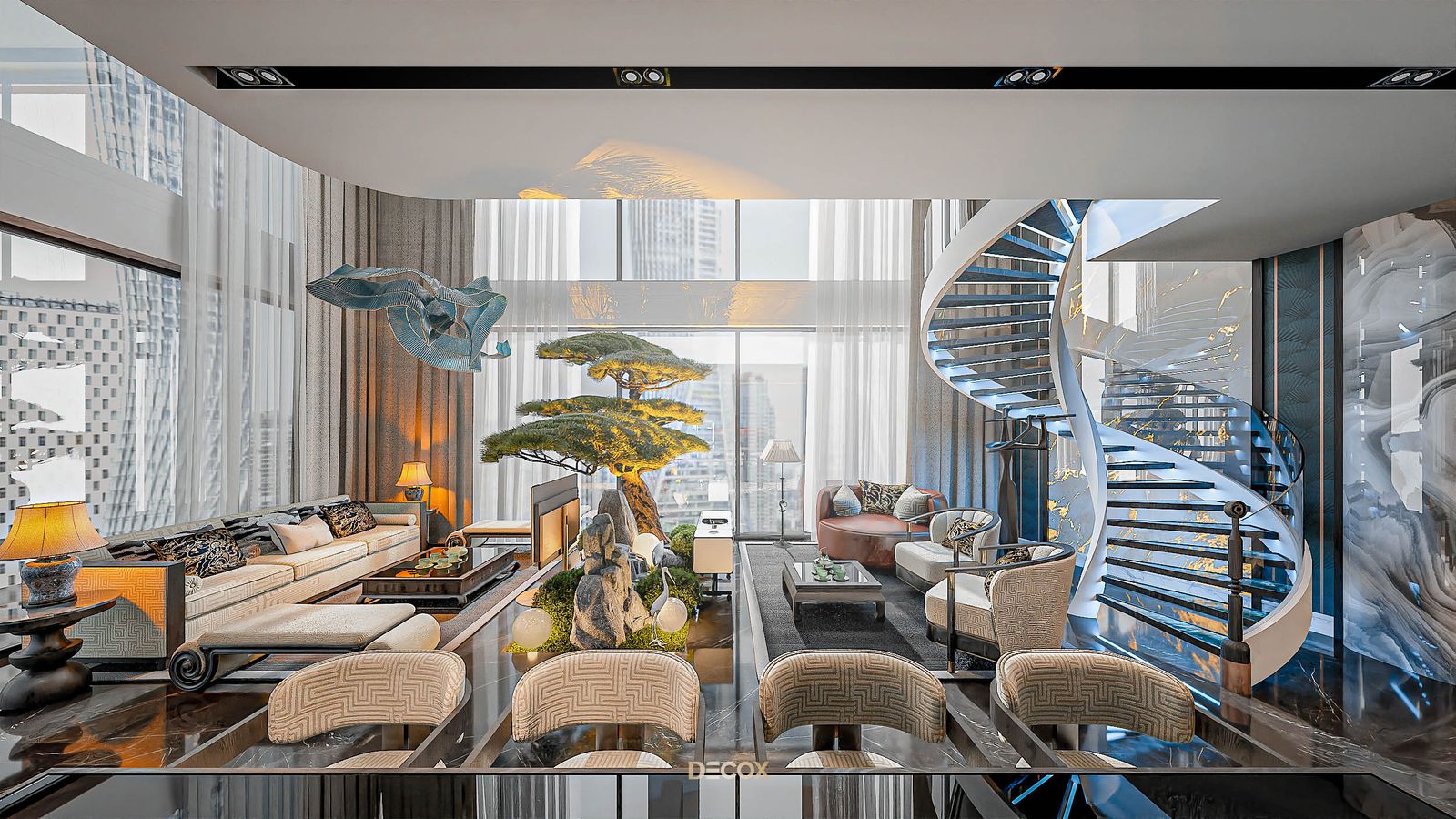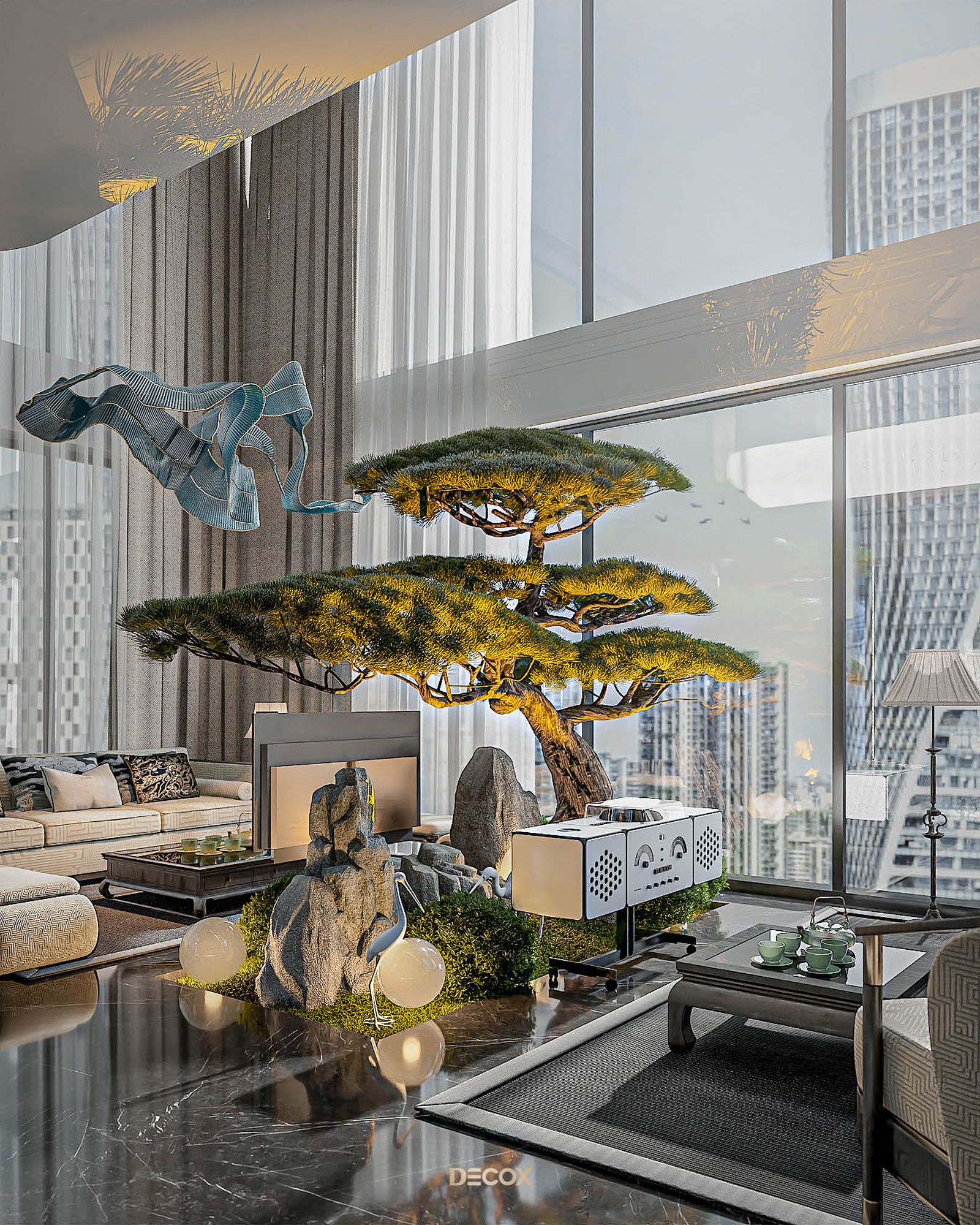 Xuyên suốt thiết kế nội thất là sự xuất hiện đan xen của hệ đồ nội thất sử dụng các texture hoa văn truyền thống kết hợp với những vật liệu mang tính hiện đại như đá xuyên sáng, kim loại,... Và "vườn" cây Bonsai, một biểu tượng mang tính chất cổ điển chính là mảnh ghép cuối cùng giúp không gian thêm trọn vẹn. Những hồi ức về một nét văn hóa truyền thống "vang bóng 1 thời” nay đã được sống lại dưới một hình thức mới: hiện đại, cao cấp, hi-end và tương lai hơn.
