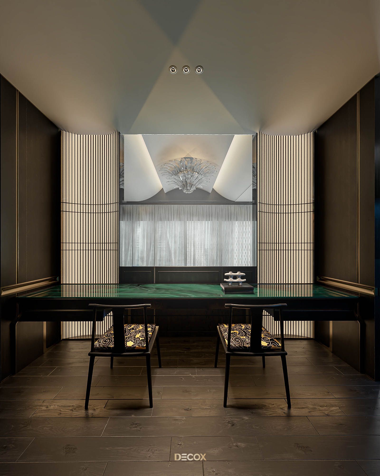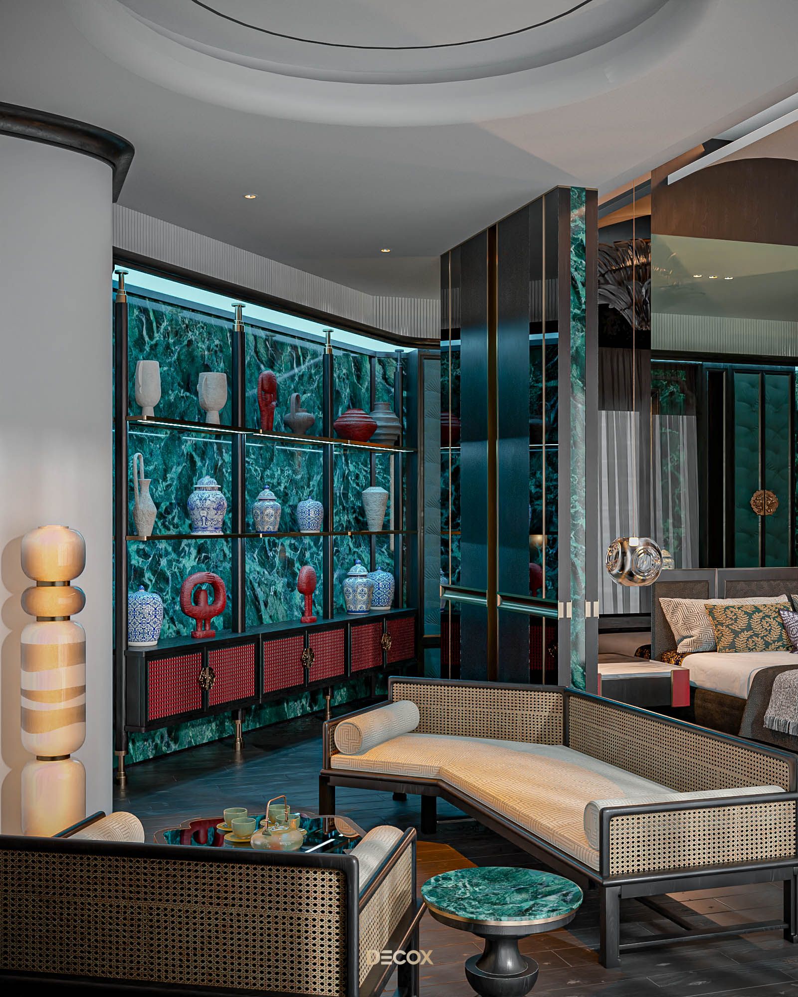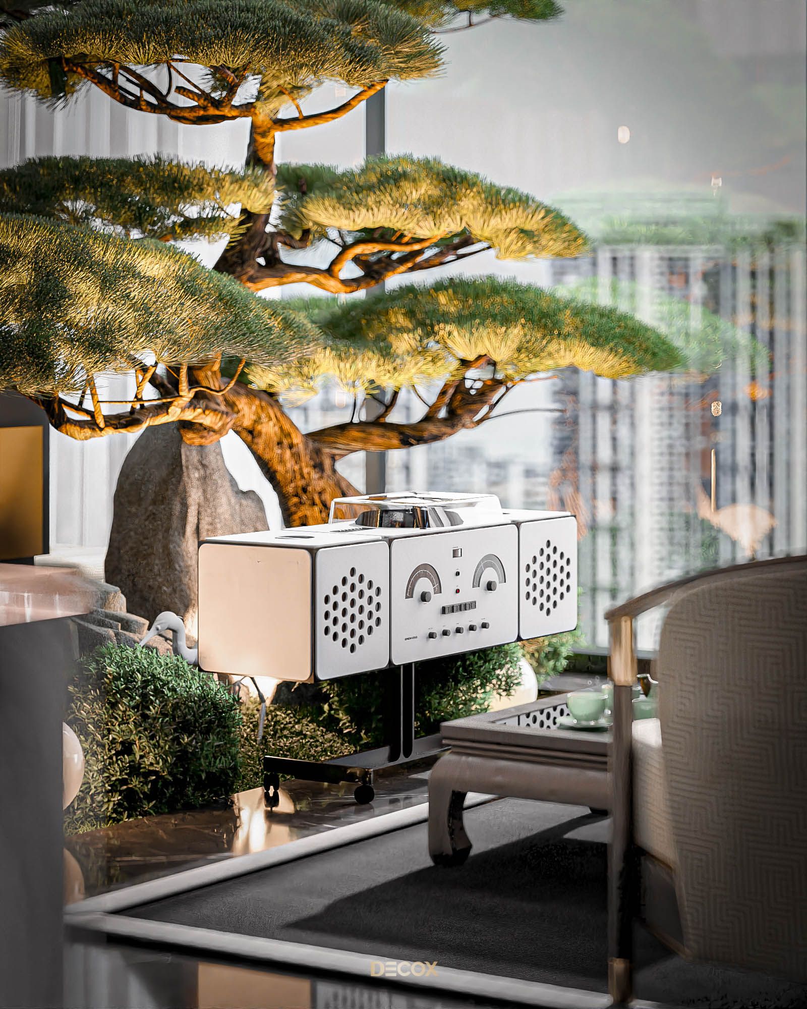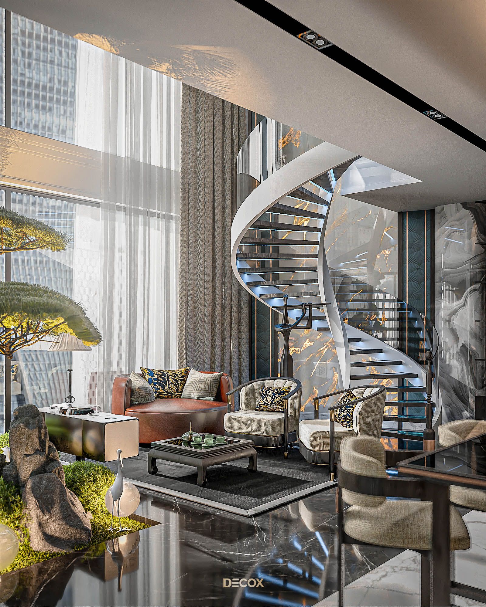 Xuyên suốt thiết kế nội thất là sự xuất hiện đan xen của hệ đồ nội thất sử dụng các texture hoa văn truyền thống kết hợp với những vật liệu mang tính hiện đại như đá xuyên sáng, kim loại,... Và "vườn" cây Bonsai, một biểu tượng mang tính chất cổ điển chính là mảnh ghép cuối cùng giúp không gian thêm trọn vẹn. Những hồi ức về một nét văn hóa truyền thống "vang bóng 1 thời” nay đã được sống lại dưới một hình thức mới: hiện đại, cao cấp, hi-end và tương lai hơn.