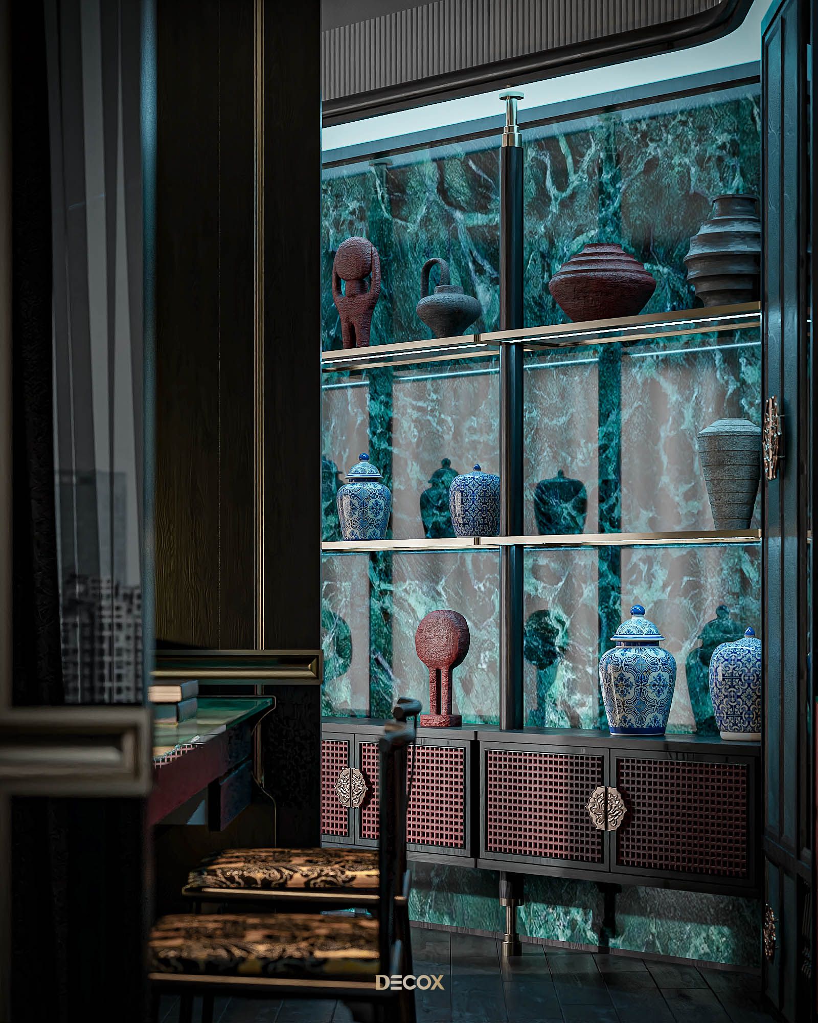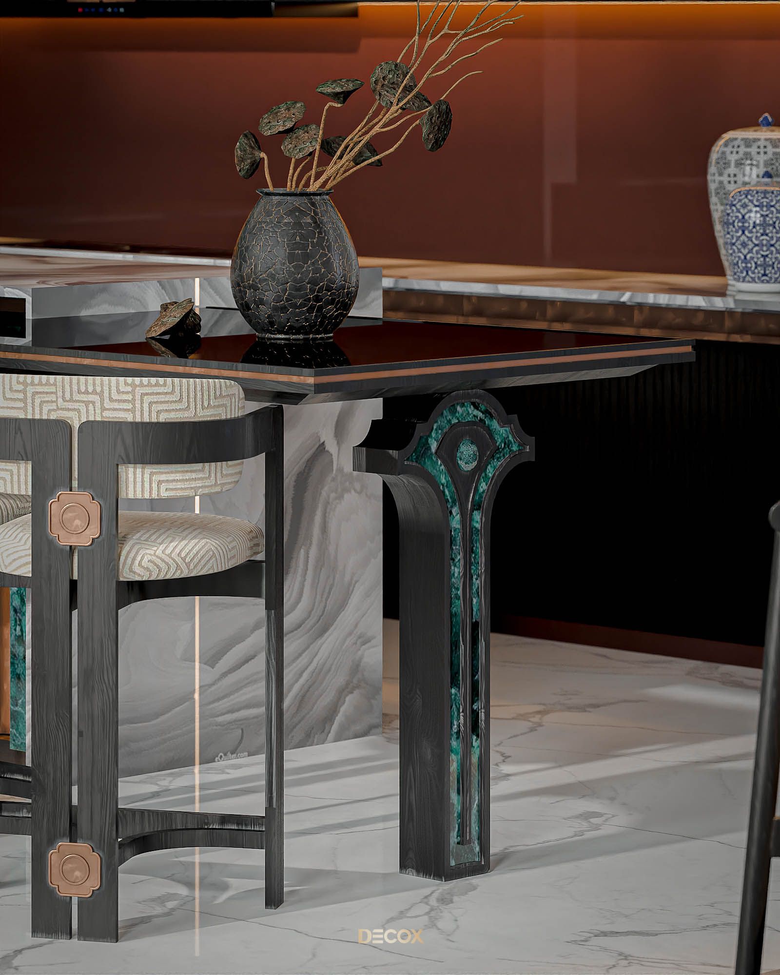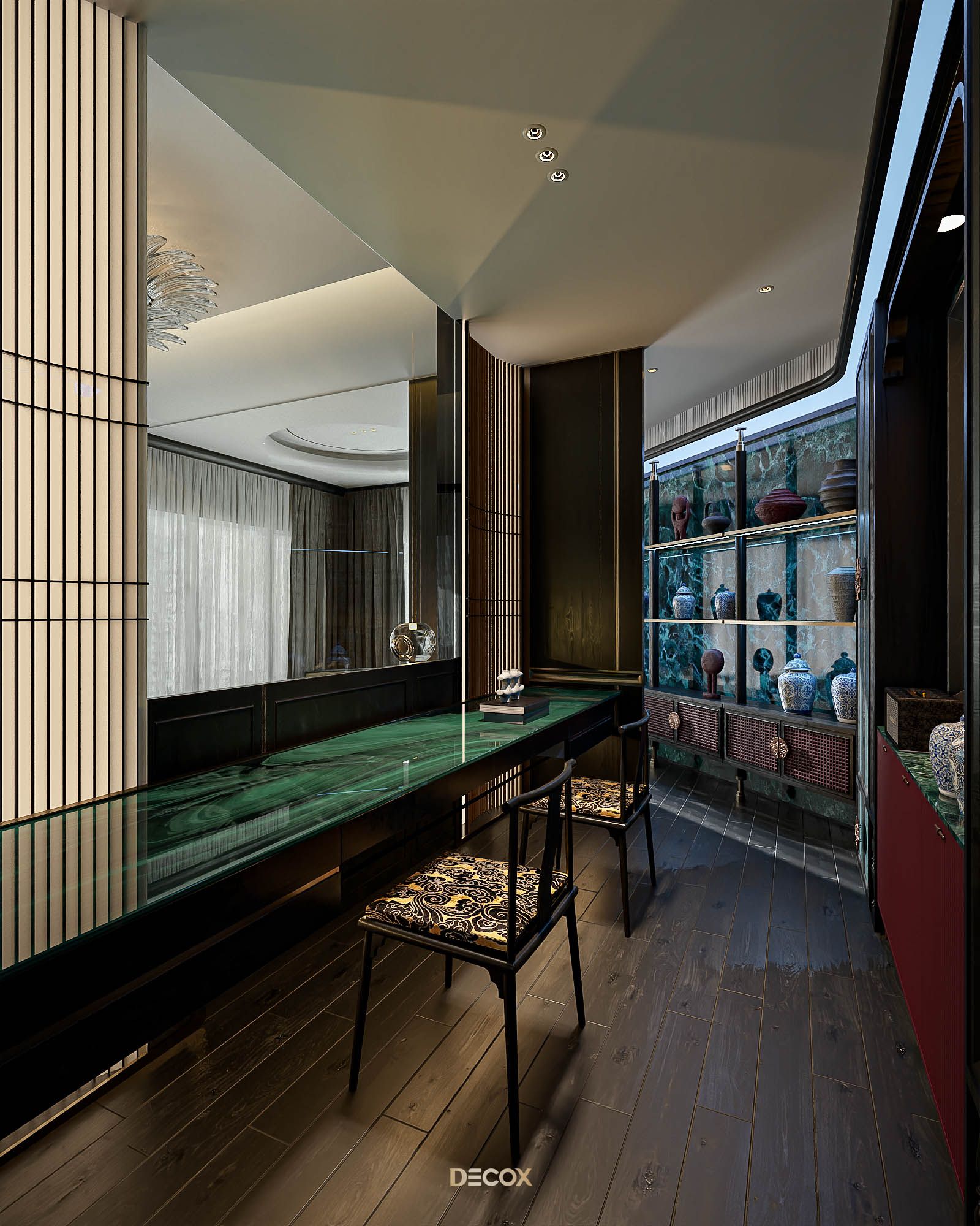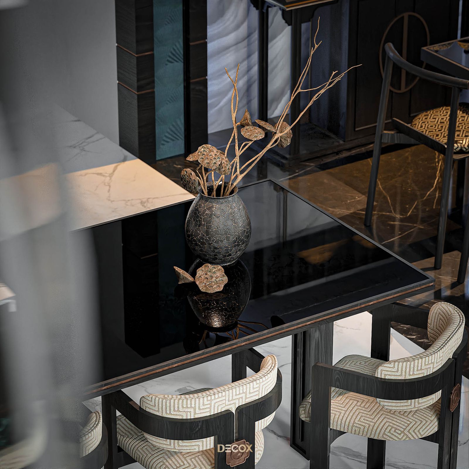 Xuyên suốt thiết kế nội thất là sự xuất hiện đan xen của hệ đồ nội thất sử dụng các texture hoa văn truyền thống kết hợp với những vật liệu mang tính hiện đại như đá xuyên sáng, kim loại,... Và "vườn" cây Bonsai, một biểu tượng mang tính chất cổ điển chính là mảnh ghép cuối cùng giúp không gian thêm trọn vẹn. Những hồi ức về một nét văn hóa truyền thống "vang bóng 1 thời” nay đã được sống lại dưới một hình thức mới: hiện đại, cao cấp, hi-end và tương lai hơn.