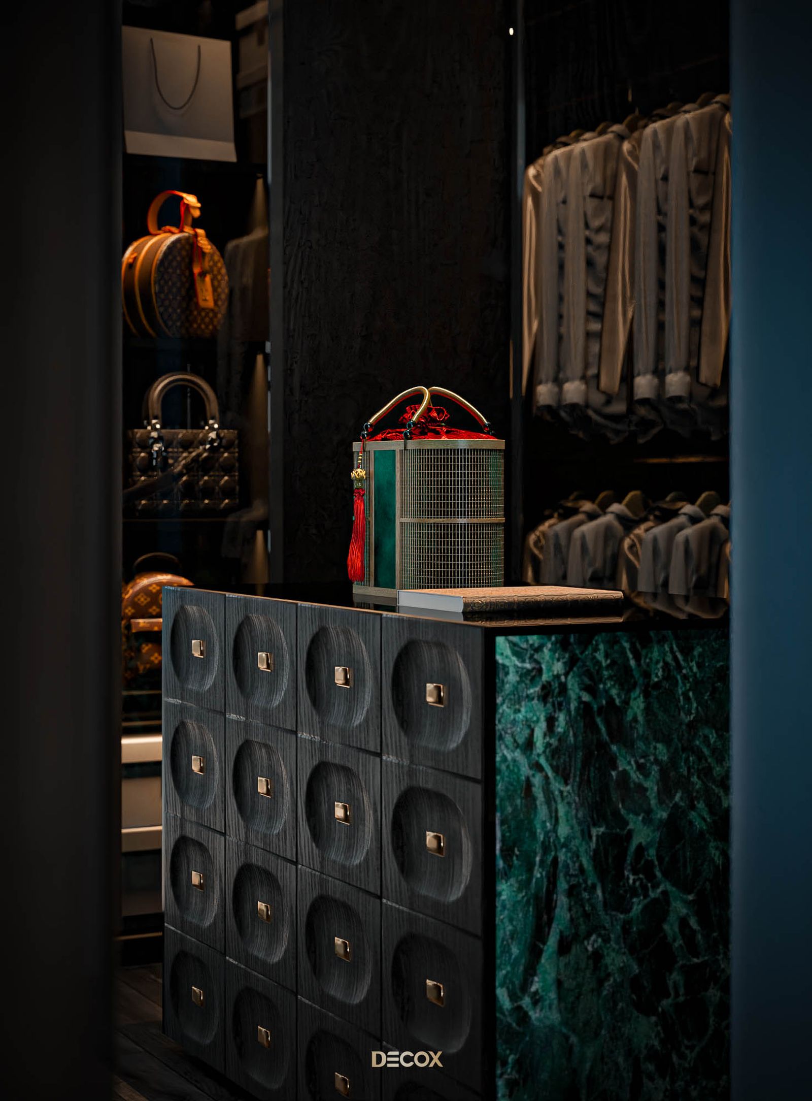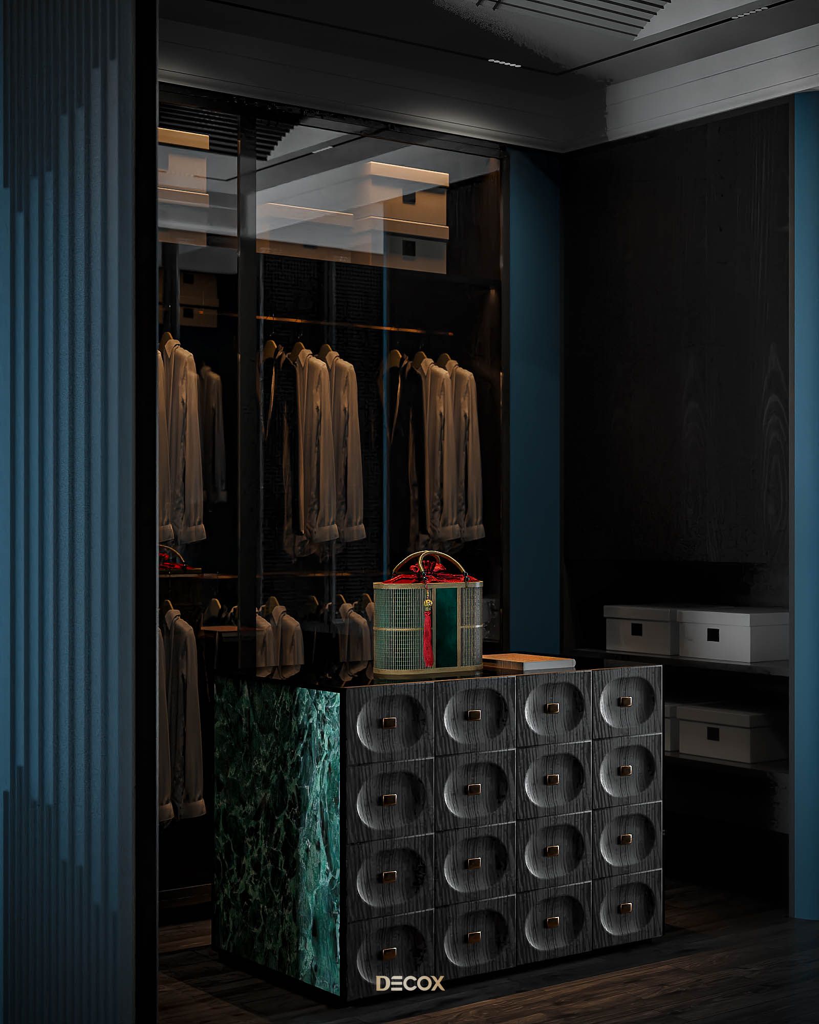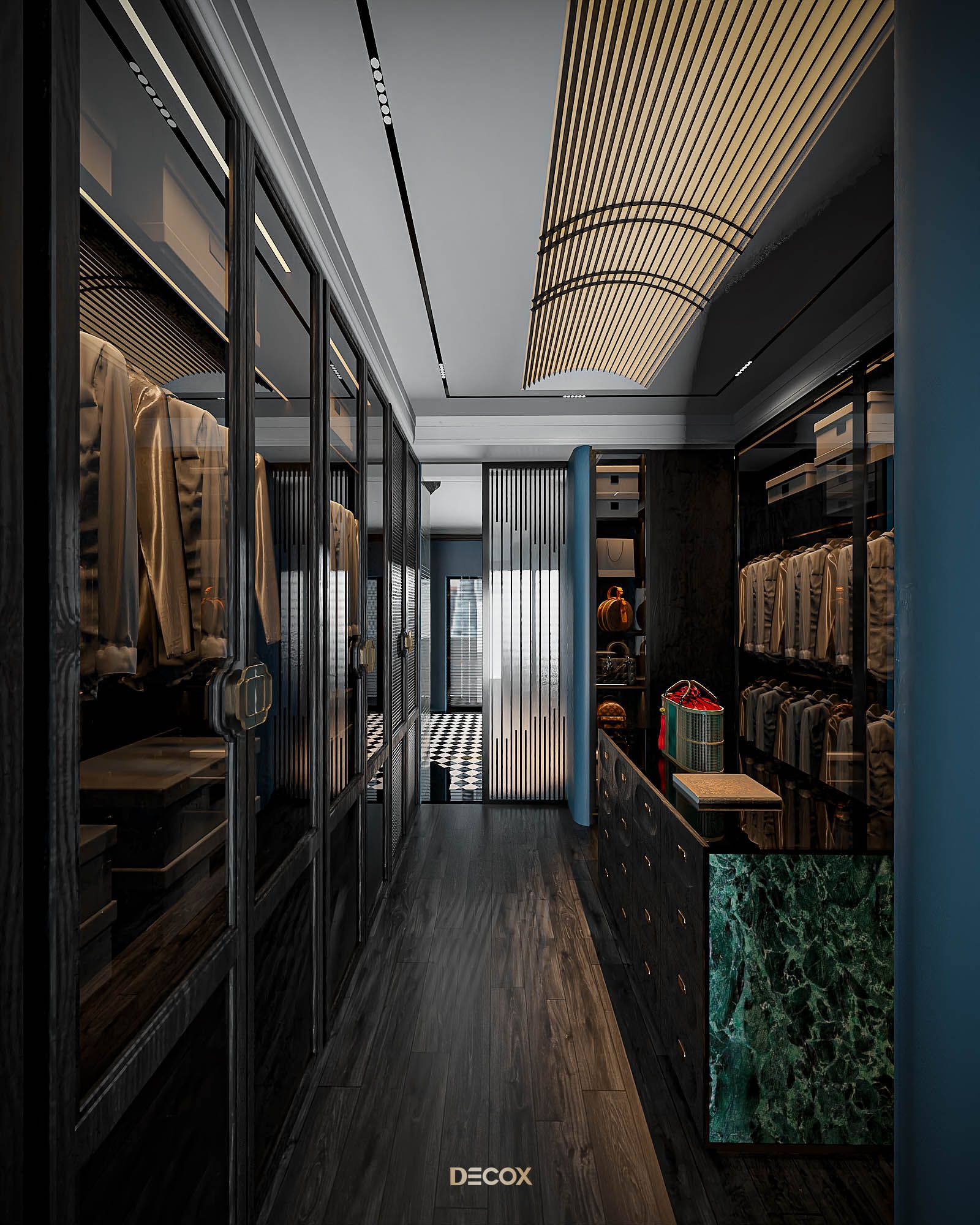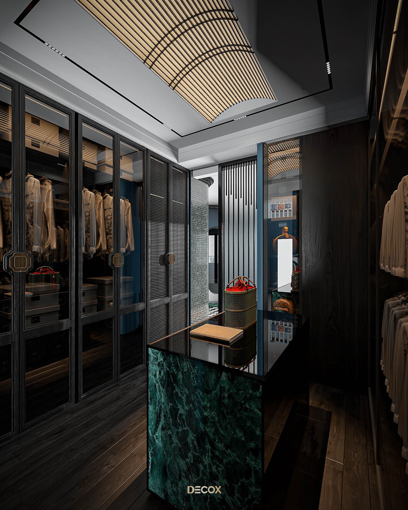 Phòng thay đồ được “giấu kín” bên trong không gian phòng ngủ, mang đến sự tiện ích và riêng tư cho gia chủ. Vẫn với lối thiết kế dung hòa giữa truyền thống và hiện đại quen thuộc xuyên suốt dự án, tổng thể phòng thay đồ là sự kết hợp của những chất liệu hiện đại: kính, đá, gỗ với họa tiết indochine ở phần tay nắm tủ. Điểm nhấn trong thiết kế phải kể đến bàn đảo trang sức đặt ở trung tâm căn phòng. Lấy cảm hứng từ quầy thuốc trong những hiệu thuốc Đông y, kết hợp cùng chất liệu india green marble ở mặt bên, thiết kế mang đến một cảm nhận tuy quen mà lạ, vừa cổ điển vừa độc đáo, hàm chứa tính cá nhân và đồng nhất giữa các không gian.