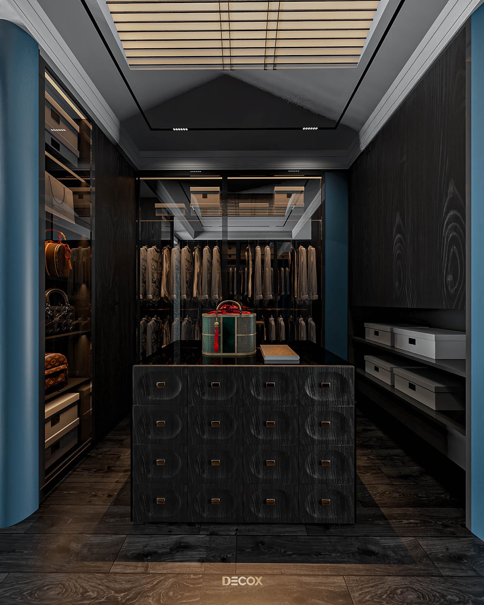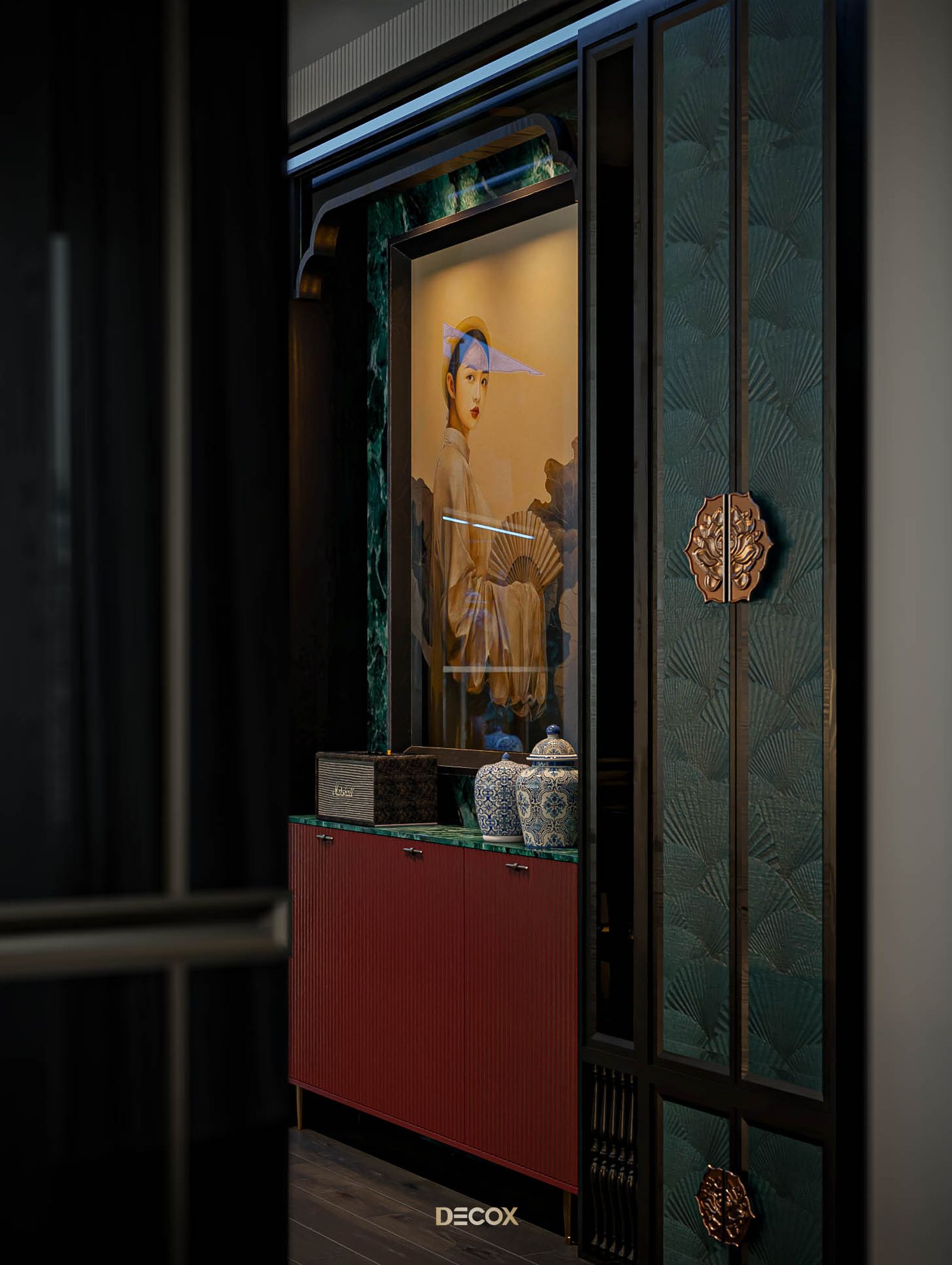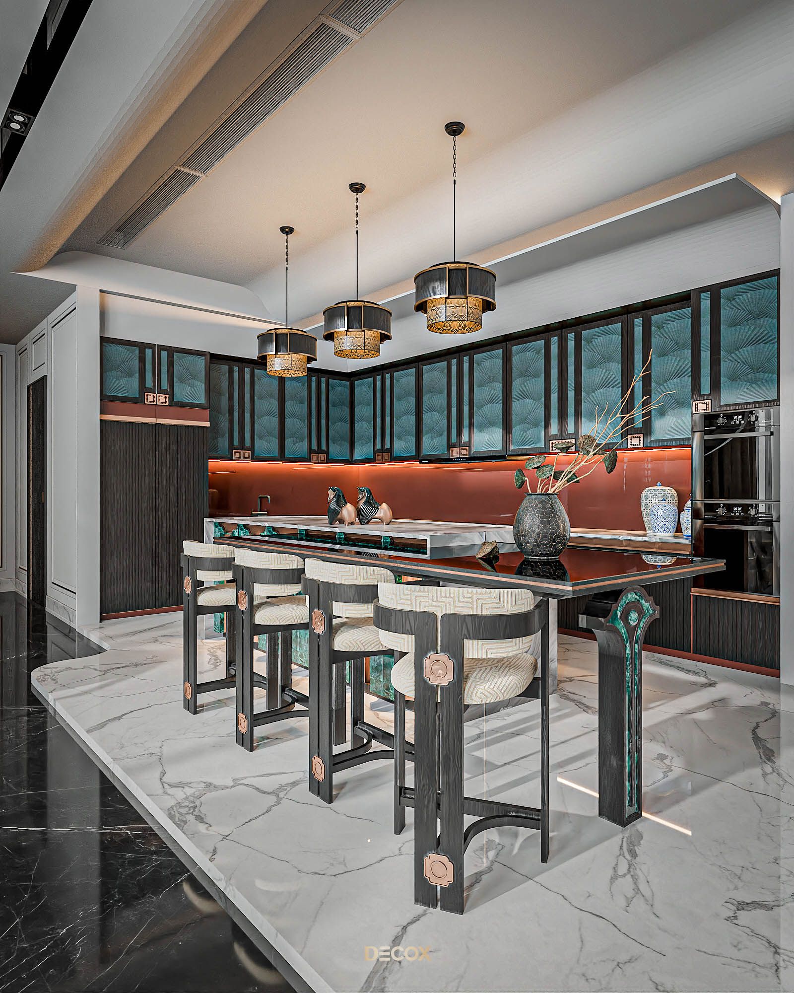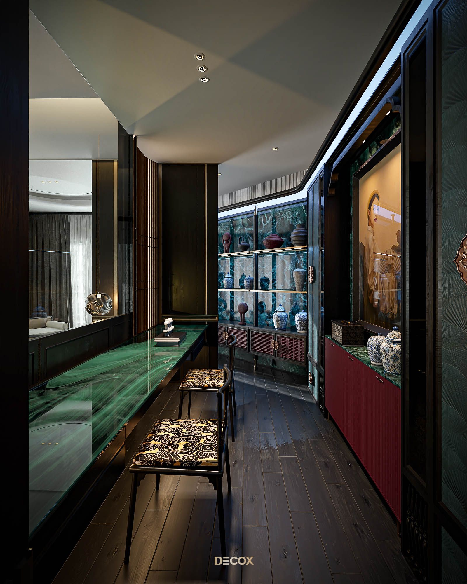 Phòng thay đồ được “giấu kín” bên trong không gian phòng ngủ, mang đến sự tiện ích và riêng tư cho gia chủ. Vẫn với lối thiết kế dung hòa giữa truyền thống và hiện đại quen thuộc xuyên suốt dự án, tổng thể phòng thay đồ là sự kết hợp của những chất liệu hiện đại: kính, đá, gỗ với họa tiết indochine ở phần tay nắm tủ. Điểm nhấn trong thiết kế phải kể đến bàn đảo trang sức đặt ở trung tâm căn phòng. Lấy cảm hứng từ quầy thuốc trong những hiệu thuốc Đông y, kết hợp cùng chất liệu india green marble ở mặt bên, thiết kế mang đến một cảm nhận tuy quen mà lạ, vừa cổ điển vừa độc đáo, hàm chứa tính cá nhân và đồng nhất giữa các không gian.