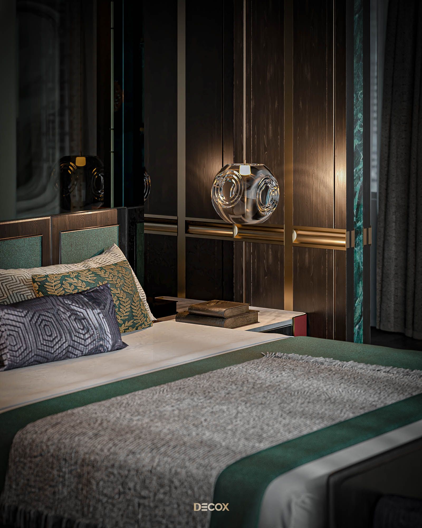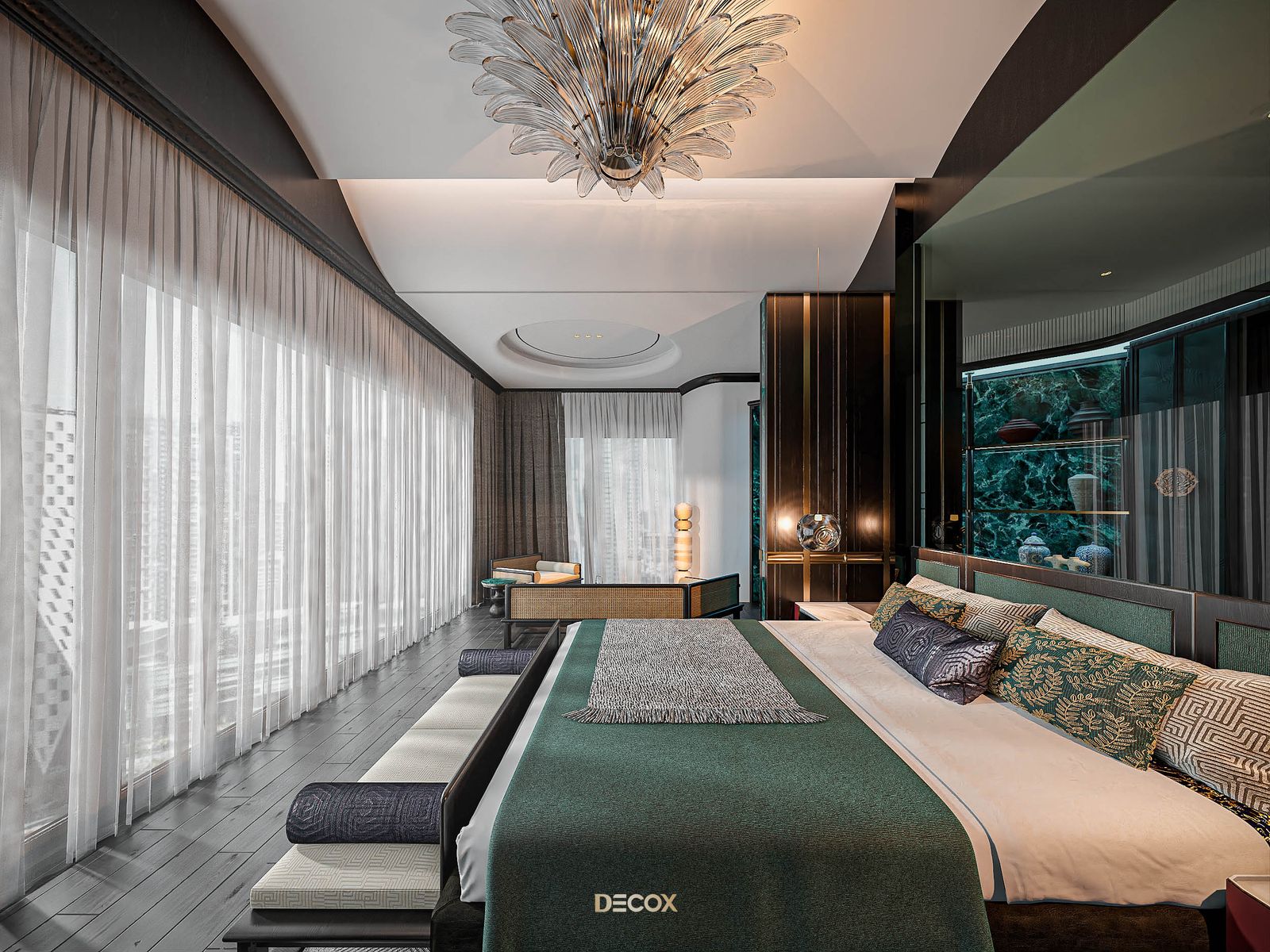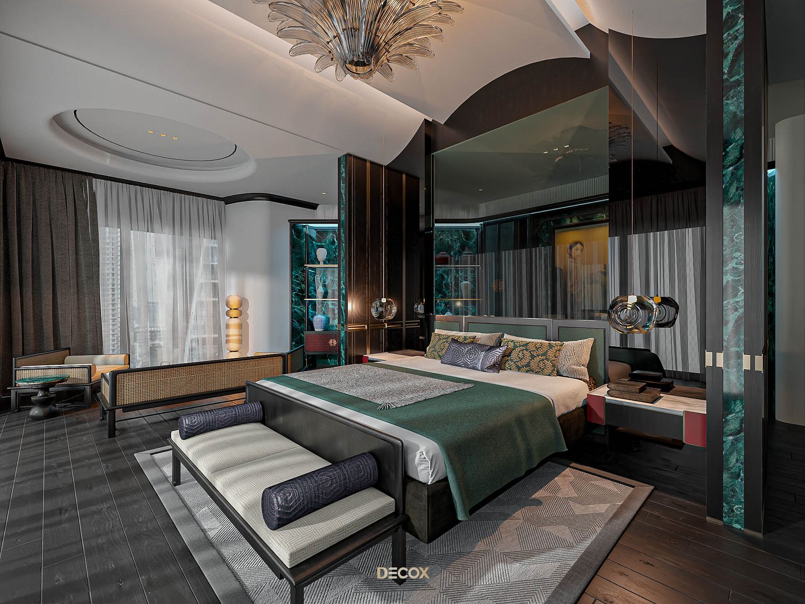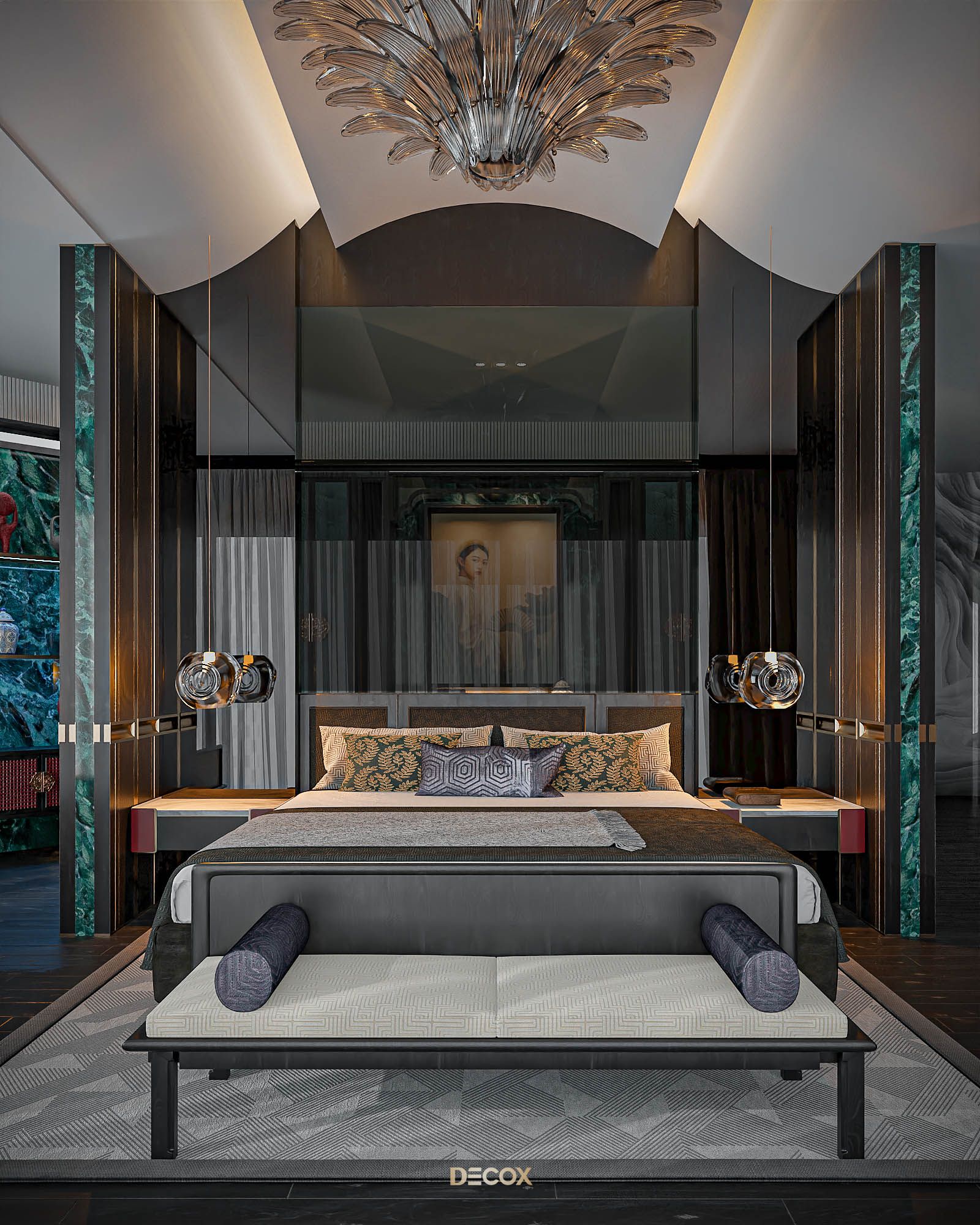 Không cầu kỳ trong đường nét, họa tiết, sức hút của không gian phòng ngủ master phụ thuộc phần lớn vào màu sắc và chất liệu sử dụng. Trong đó, phải kể đến chất liệu emerald green marble như một viên “ngọc lục bảo” - sang trọng và kiêu kỳ, nhấn điểm hệ tủ trưng bày, vách ngăn, bàn trà…Hay vách đầu giường được “tạc dũa” từ chất liệu kính xám khói, vừa sang trọng vừa bắt nhịp xu hướng thời đại.