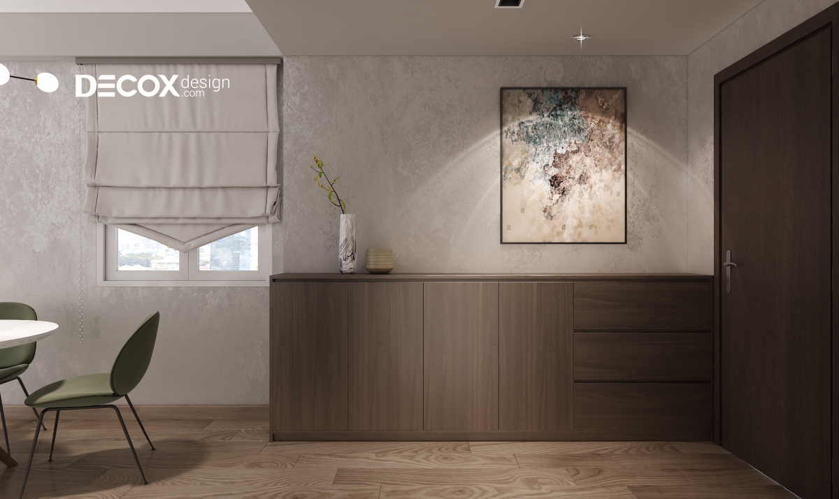 Chọn phong cách nội thất tối giản, NTK tạo nhiều khoảng không gian trống bằng cách lược bỏ các đồ trang trí hay chi tiết không cần thiết, đồng thời sử dụng kiểu dáng đồ nội thất không cầu kì, tối giản hình dáng của tủ, biến nó thành thức tường có thể chứa nhiều đồ đạc bằng cách dùng tủ âm tường hay tủ có cánh cửa, không nên để hộc tủ hở hay trưng bày bên ngoài quá nhiều. Gam màu chủ đạo được sử dụng là beige-nâu gỗ cùng điểm nhấn là sắc xanh ngọc mát mắt.