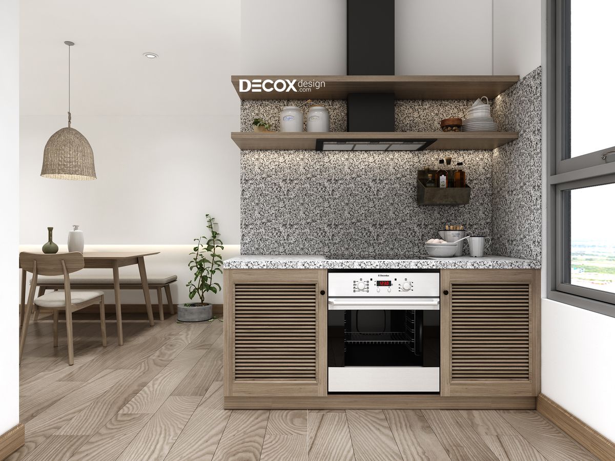 Khu vực phòng bếp cũng ấn tượng không kém với phòng khách. Sử dụng nền đá hoa cương bao phủ, bạn sẽ cảm nhận được độ sạch sẽ, sáng bóng và không còn sợ các vết dầu mỡ cứng đầu.