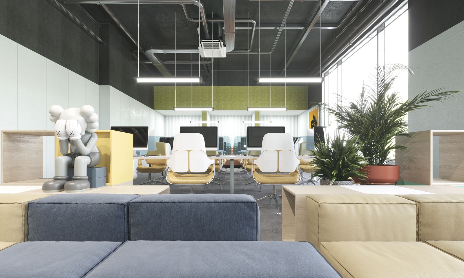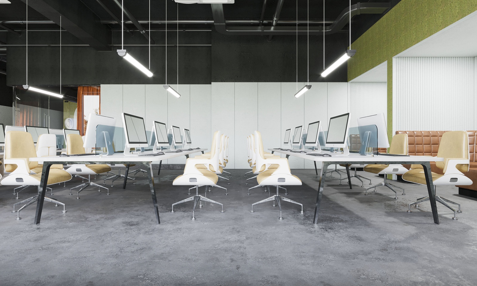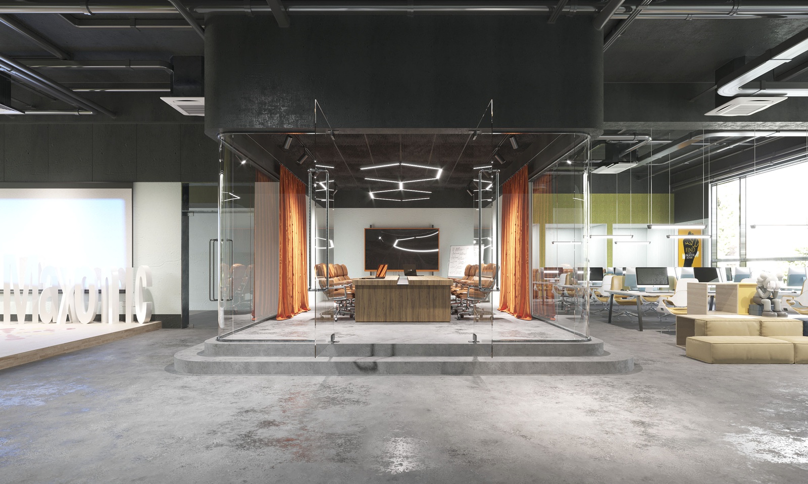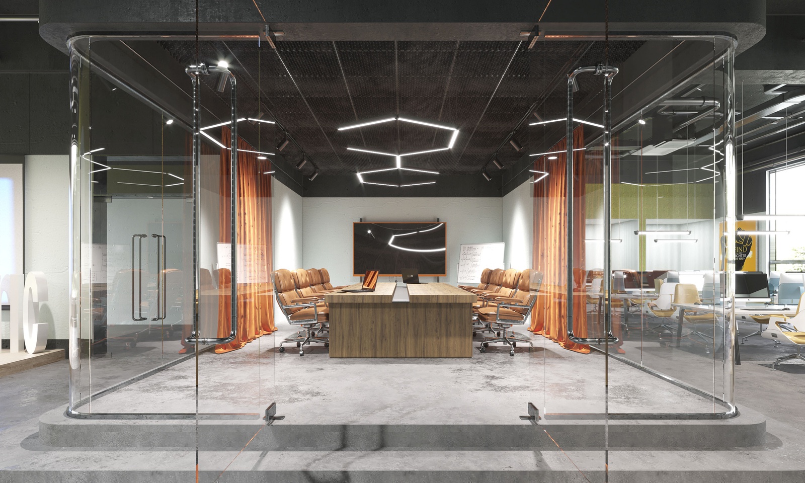 Khu vực làm việc được thiết kế theo dạng không gian mở đảm bảo sự thông thoáng, thoải mái và tính kết nối giúp việc trao đổi công việc giữa nhân viên và giữa các phòng ban diễn ra nhịp nhàng, thuận tiện hơn. Vì sử dụng phong cách industrial nên tổng thể sẽ gợi cảm giác trầm lắng, do đó việc thiết kế hệ cửa sổ kính rộng lớn sẽ giúp gia tăng ánh sáng và thăng hạng vẻ đẹp văn phòng.