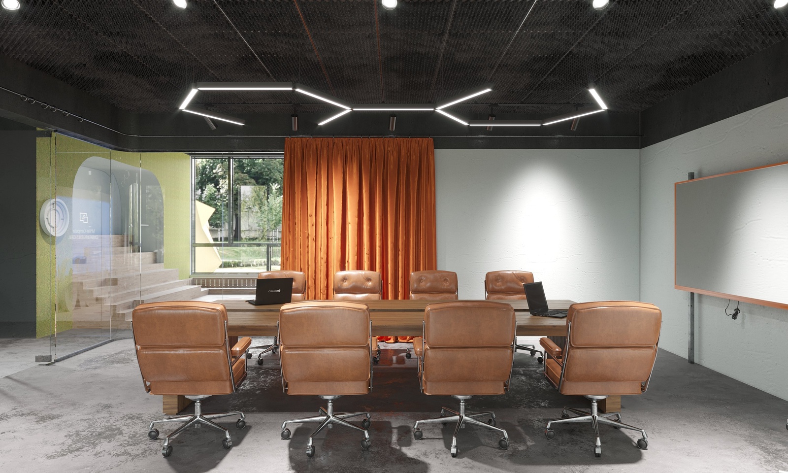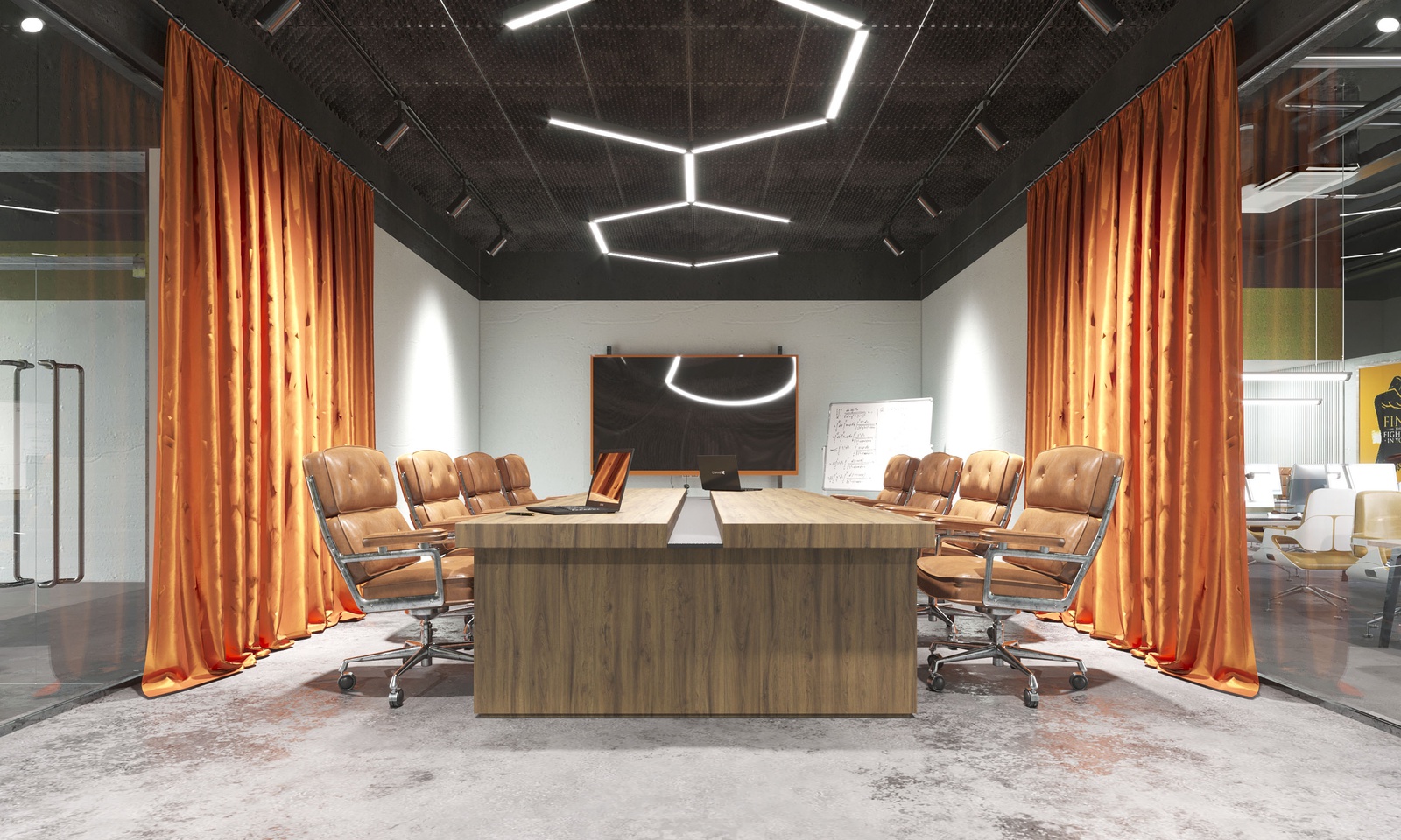 Với không gian phòng họp, thay vì sử dụng những bức tường thô ráp truyền thống, KTS đã chọn lựa phương án bố trí 3 mặt kính với thiết kế bo cong mềm mại vừa đảm bảo tính thẩm mỹ vừa giúp tầm nhìn giữa các khu vực trong văn phòng được xuyên suốt. Tuy nhiên, để đảm bảo tính riêng tư cũng như độ bảo mật trong các cuộc họp, KTS đã bố trí lắp đặt thêm rèm kéo với tone màu đồng bộ cùng nội thất trong phòng.