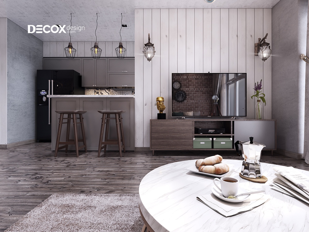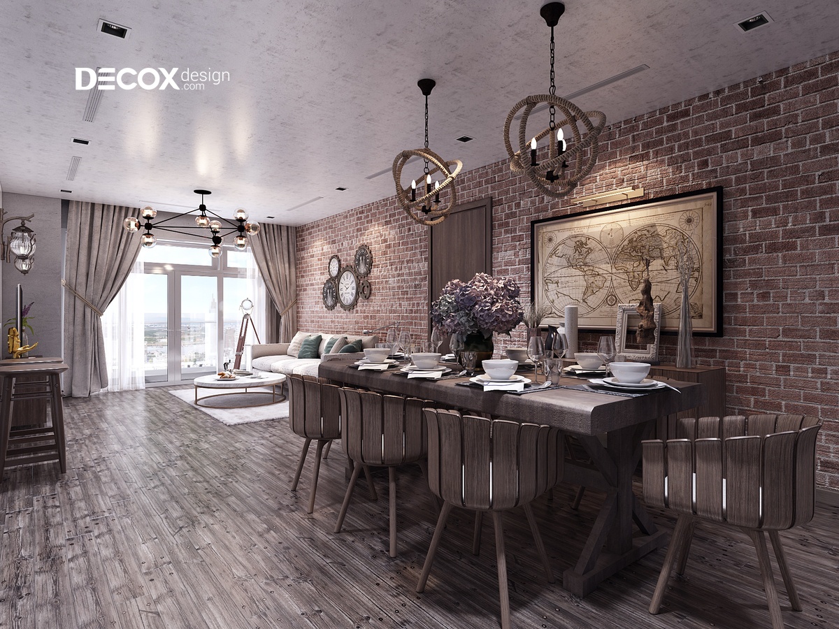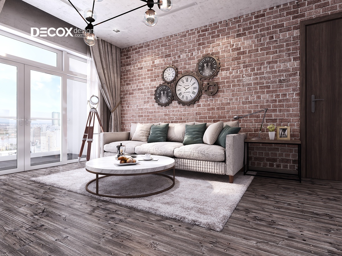 Phong cách nội thất Industrial chính là thiết kế chủ đạo trong thiết kế nội thất chung cư Vinhomes Central Park 140m2, với bức tường màu giả gạch kiểu cũ cùng với việc trang trí mô hình của một số chiếc đồng hồ cổ đã làm nổi bật lên nét cổ xưa cho toàn bộ không gian nội thất căn hộ. Cộng với việc chọn sàn gỗ màu xám – đen đã giúp tô điểm thêm cho không gian ấm cúng của cả căn hộ.
