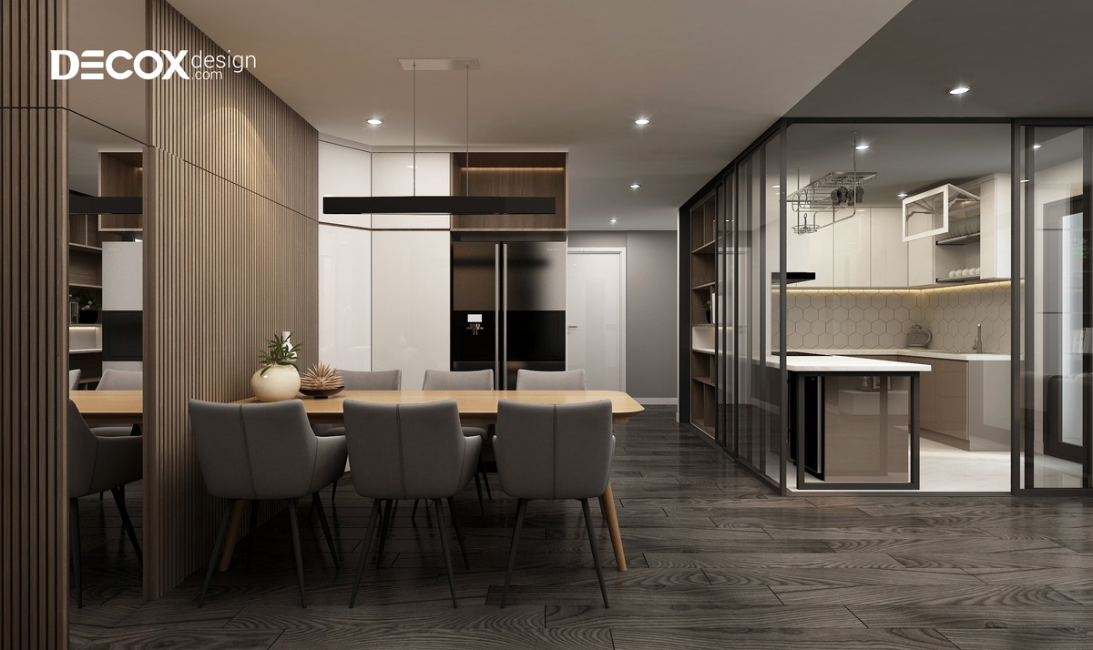 Thiết kế nội thất căn hộ Vinhomes Landmark 188m2 sang trọng và thoáng đãng. Các chất liệu được sử dụng chuẩn mực, vì thế mỗi một khu vực đều mang đến cho chủ nhân cảm giác nhẹ nhàng, dễ chịu. Nghệ thuật phối trộn màu sắc điệu nghệ đã giúp cho các tông màu trắng-xám-nâu phát huy tối ưu giá trị thẩm mỹ. Các điểm nhấn được thể hiện sáng tạo đã làm tăng sức hút cho căn hộ. Sự kết hợp khéo léo các tông màu trung tính cùng với các tông màu nâu-đen đã tạo nên một căn hộ mang đậm phong cách thiết kế nội thất hiện đại, đầy cá tính. Sắc sảo nhất trong thiết kế nội thất chung cư Vinhomes Landmark 188m2 đó là việc phối trộn các chất liệu vô cùng sáng tạo. Sự quý phái của gỗ hòa cùng với các chất liệu như kính, sắt đã mang đến những phá cách độc đáo giúp cho căn hộ thêm sang trọng và duyên dáng.