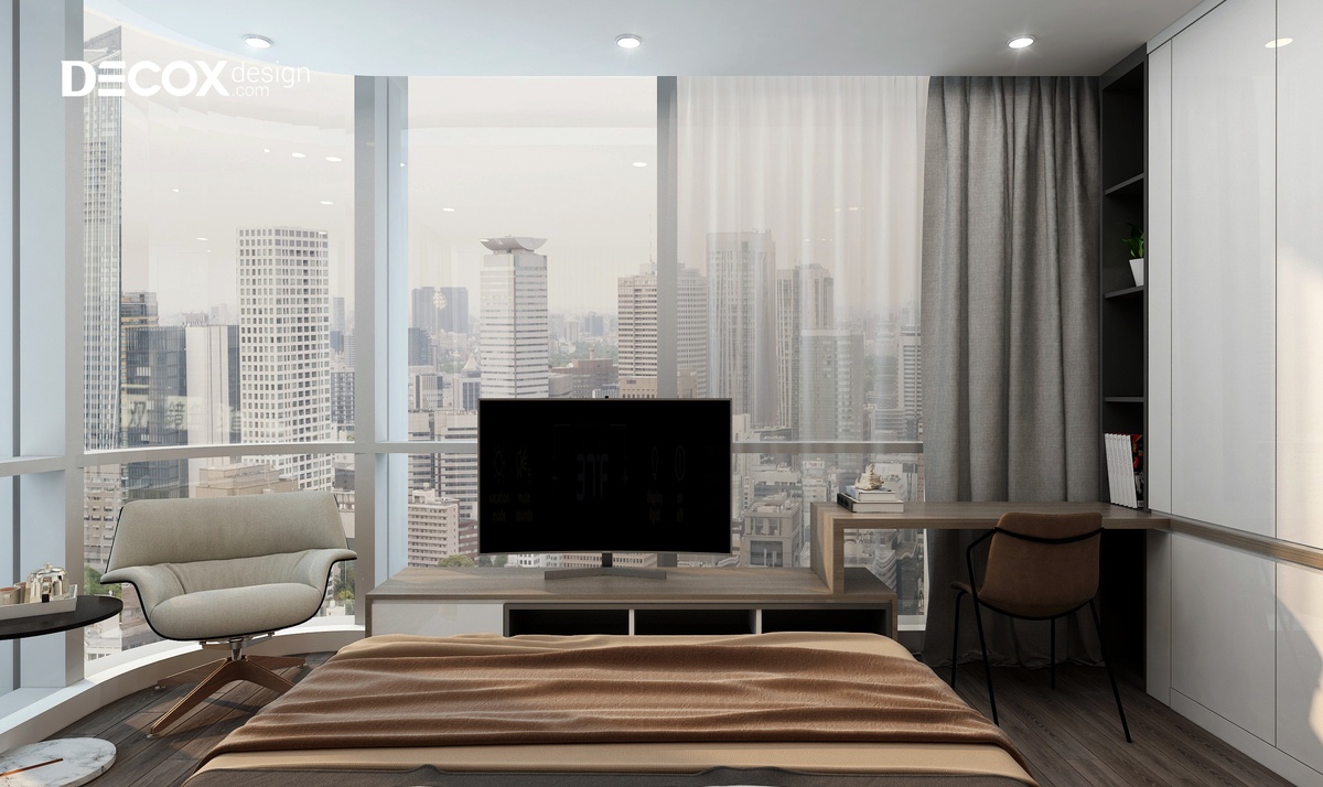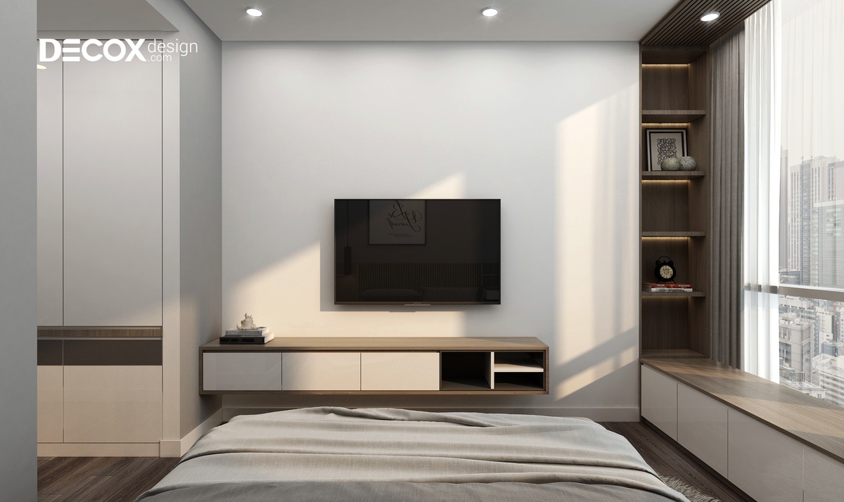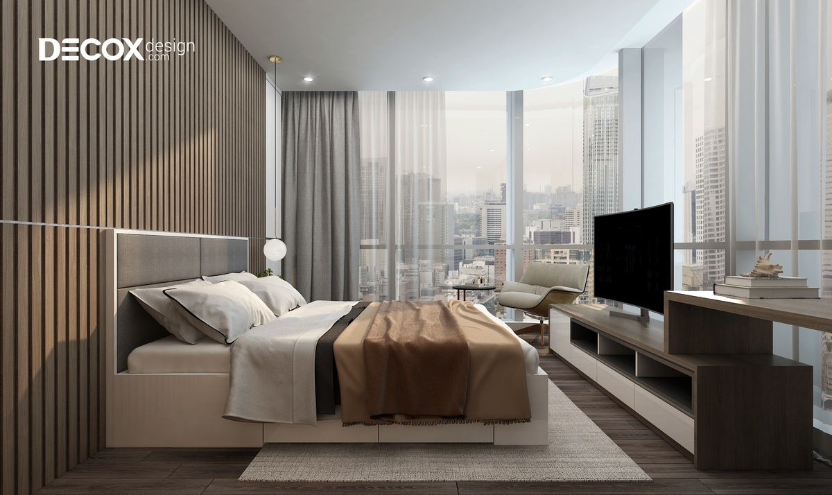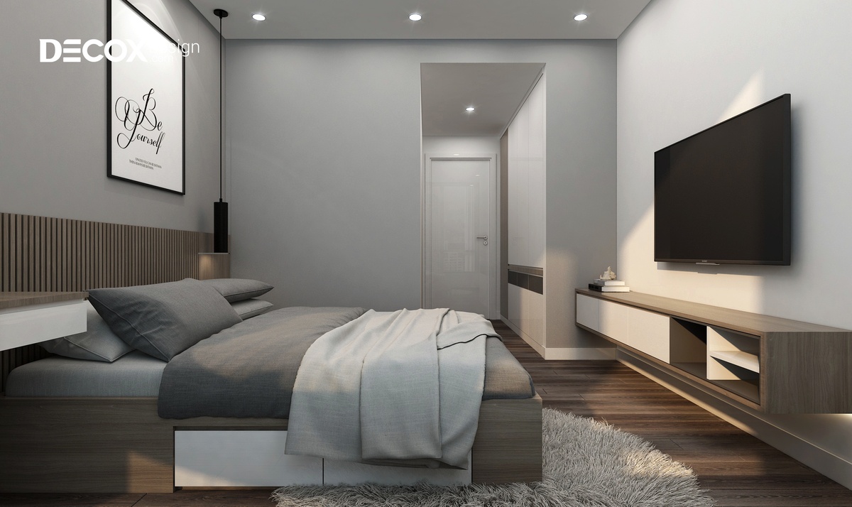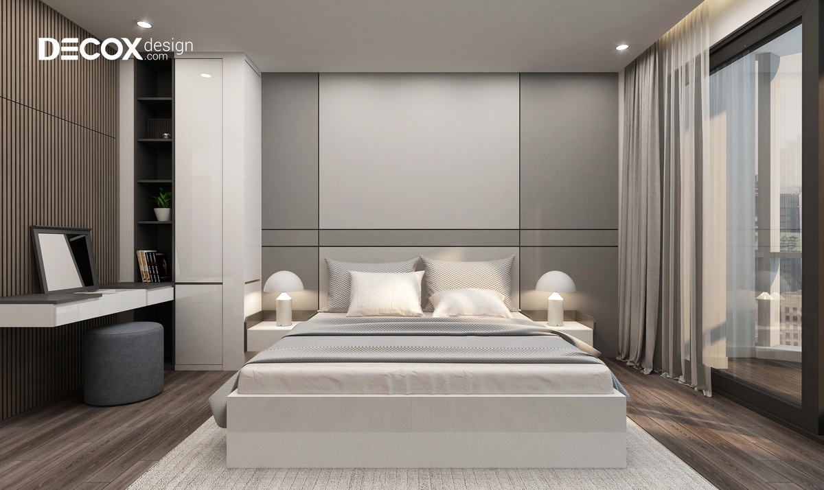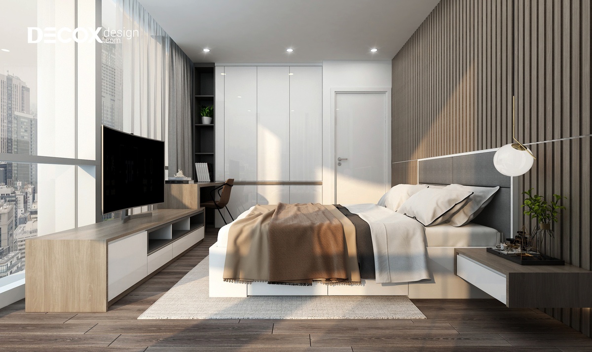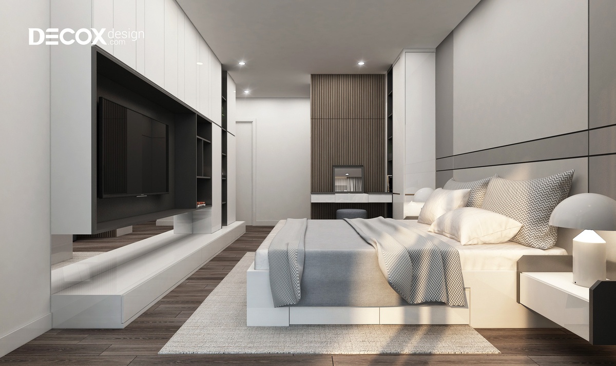Việc lựa chọn các tông màu trung tính làm chủ đạo đã làm cho thiết kế nội thất phòng ngủ trở nên rộng rãi và thoáng đãng. Giường ngủ màu trắng nằm nổi bật trên sàn gỗ tối màu. Bên cạnh đó, một chút đen hiện đại của kệ tủ giúp cho không gian phòng thêm nổi bật và cân bằng được màu sắc.