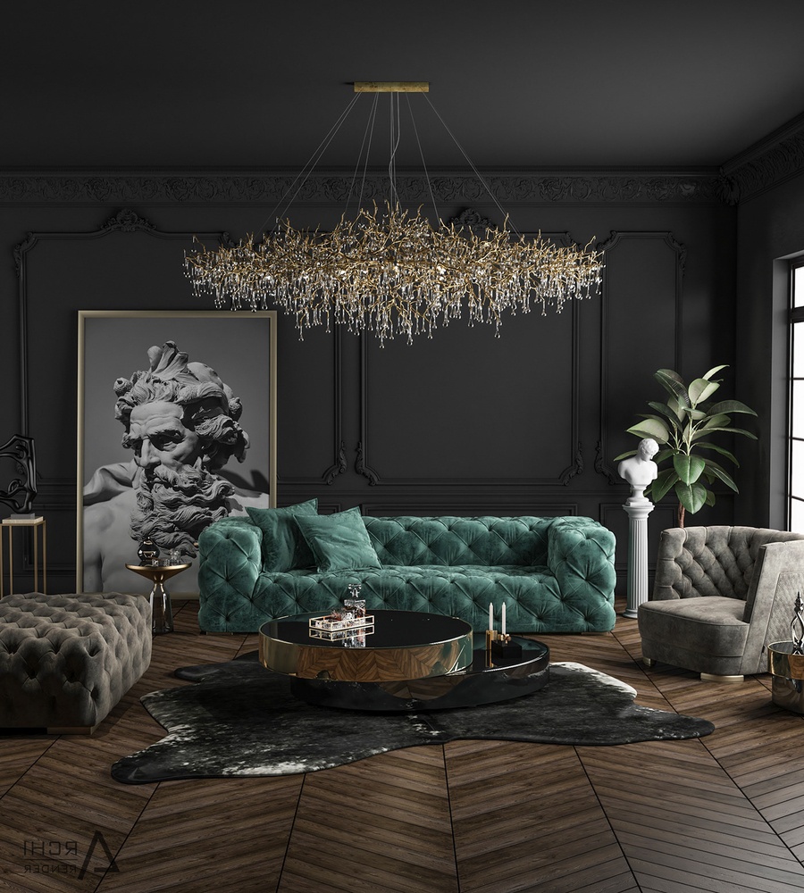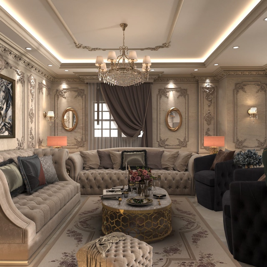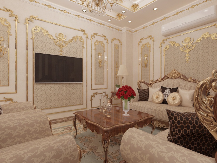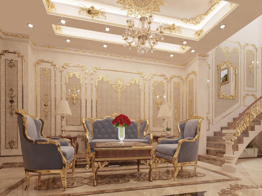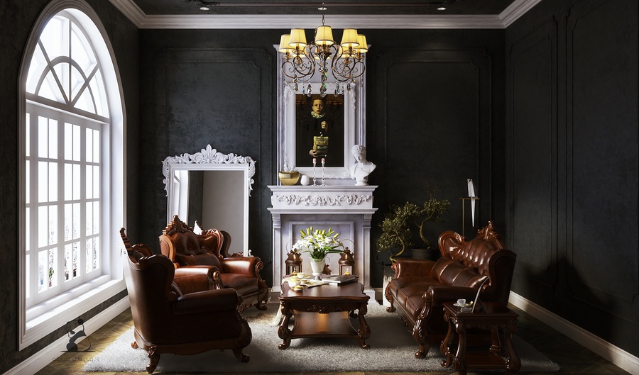 Nội thất: Nội thất phòng khách cổ điển thường có kích thước lớn để thể hiện sự uy nghi, bề thế. Đừng chọn những món nội thất hay đồ trang trí nhỏ nhắn, xinh xắn vì chúng sẽ trông rất lạc quẻ trong không gian hào nhoáng này.