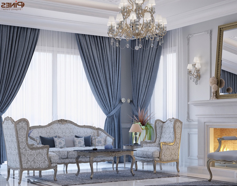 Đèn chùm: Những bộ đèn chùm khổng lồ pha lê sáng lấp lánh là lựa chọn phổ biến cho phòng khách cổ điển kiểu châu Âu. Rèm cửa: Rèm cửa của phòng khách cổ điển thường không có hoa văn, màu tông trầm và có yếm.