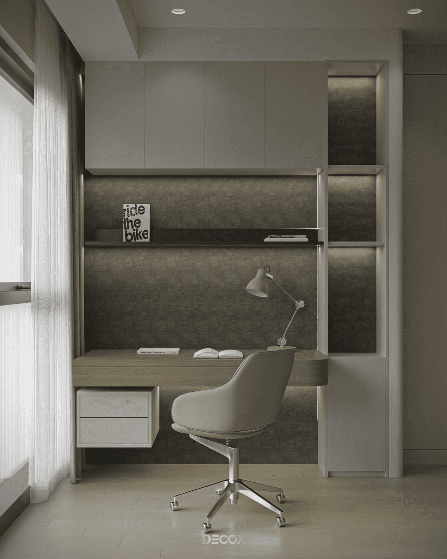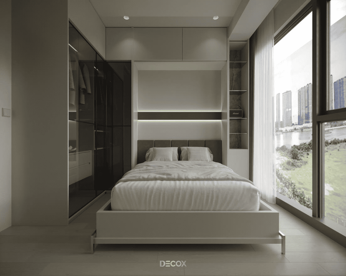 Nội thất thông minh như giường có lưu trữ với hộc kéo hoặc cơ cấu nâng hạ gầm giường giúp giải quyết đồ mùa và chăn gối mà không phát sinh thêm nội thất. Hệ tủ âm, tủ kịch trần, giường loft hoặc giường kéo phù hợp cho hai người, cho phép mở rộng không gian lưu trữ nhưng vẫn giữ mặt đứng phẳng, liền mạch, giúp tổng thể phòng ngủ gọn gàng và sang hơn. Bàn treo tường hoặc bàn gấp tích hợp với độ sâu khoảng 40-50cm đáp ứng nhu cầu làm việc cơ bản, có thể kết hợp kệ hoặc đèn hắt để giảm phụ kiện rời.