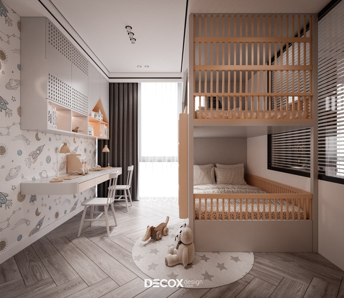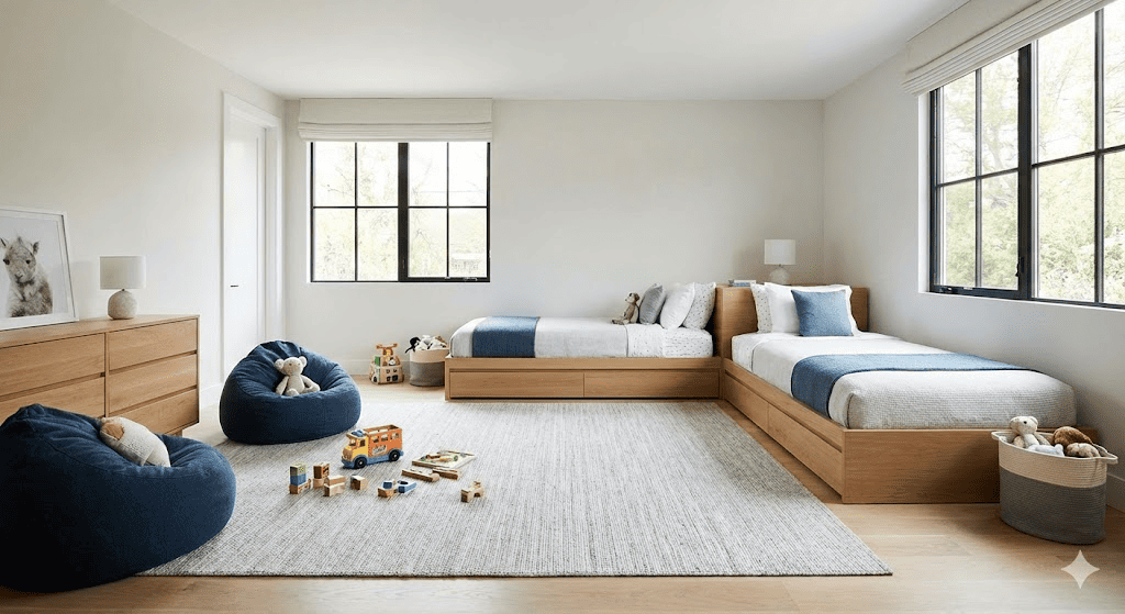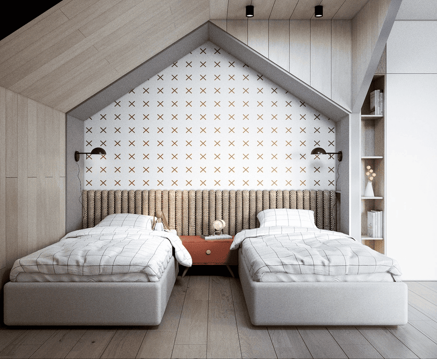 Phòng ngủ nhỏ 2 giường được thiết kế nhằm giải quyết bài toán nhiều người sử dụng trong diện tích hạn chế, thường áp dụng cho trẻ em, anh chị em hoặc người ở ghép. Trong mô hình này, yêu cầu bố cục phải được kiểm soát chặt chẽ, giường ngủ tác động trực tiếp đến cách tổ chức toàn bộ không gian. Để giảm áp lực lên mặt sàn, các giải pháp như giường tầng, giường kéo hoặc bố trí hai giường song song thường được lựa chọn, nhằm duy trì lối đi và phần không gian sinh hoạt chung ở mức tối thiểu cần thiết. Cách tổ chức này giúp đảm bảo nhu cầu ngủ riêng cho từng người trong không gian nhỏ, phù hợp với các phòng dùng chung, nơi việc tách biệt chỗ nghỉ ngơi là yêu cầu ưu tiên.