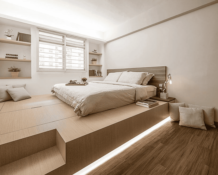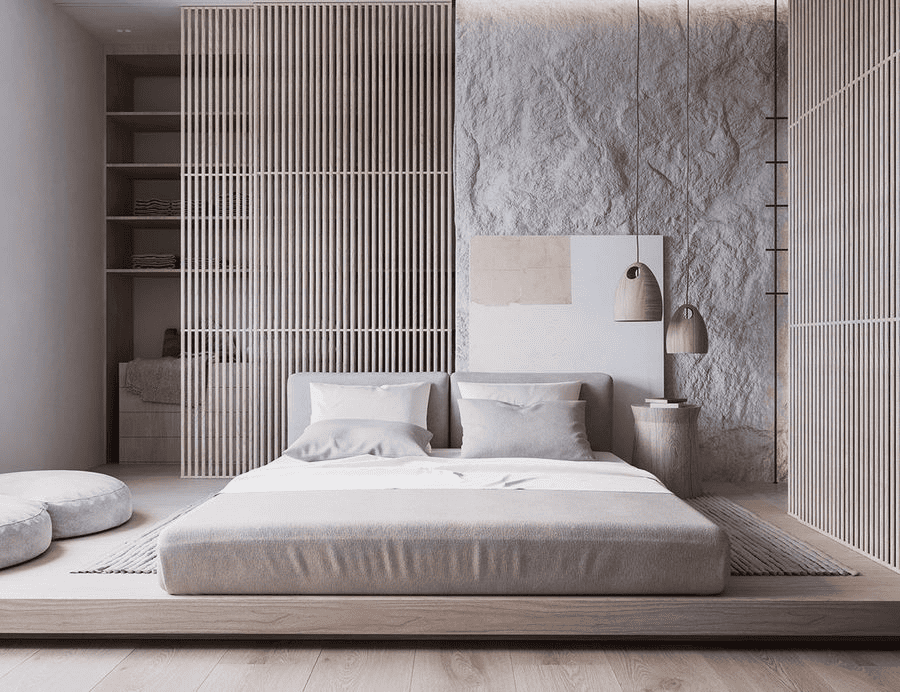 Phòng ngủ nhỏ không giường là giải pháp thiết kế hướng đến việc giải phóng diện tích sàn và tăng tính đa năng cho không gian. theo bố cục mở, hạn chế các yếu tố neo cứng để dễ dàng chuyển đổi công năng theo thời điểm sử dụng. Khu vực ngủ được xử lý linh hoạt thông qua giường gấp, đệm ẩn hoặc giải pháp ngủ tạm thời, khiến giường không còn giữ vai trò trung tâm bố cục. Nhờ đó, ban ngày không gian có thể ưu tiên sinh hoạt, làm việc hoặc thư giãn, còn ban đêm mới chuyển sang chức năng nghỉ ngơi. Cách tổ chức này giúp phòng ngủ giữ được sự thoáng đãng và linh hoạt tối đa, đặc biệt phù hợp với những không gian rất nhỏ hoặc các trường hợp cần sử dụng phòng theo nhiều mục đích khác nhau trong ngày.