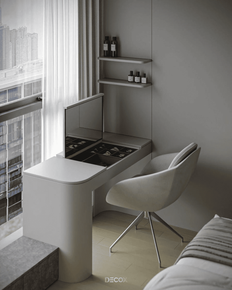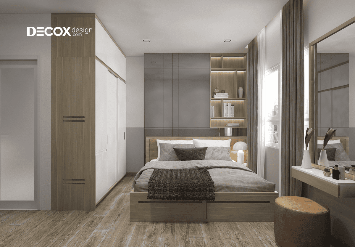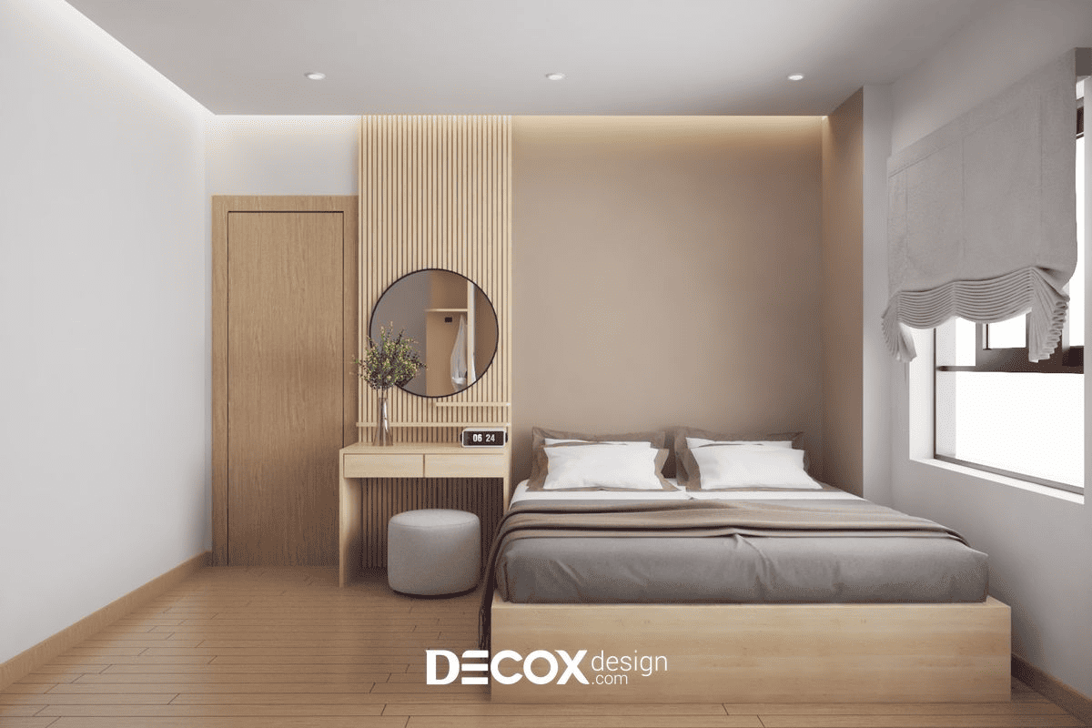 Trong cách tổ chức đó, giường ngủ không nhất thiết giữ vai trò trung tâm mà có thể được kê lệch để nhường diện tích cho bàn trang điểm hoặc một góc nghỉ ngơi riêng. Bố cục thường mềm mại, với nhiều điểm sử dụng nhỏ được phân bổ hợp lý, giúp phòng đáp ứng nhiều nhu cầu mà không cần thay đổi công năng theo từng thời điểm. Cách thiết kế này tạo cảm giác gần gũi, “ở được lâu”, phù hợp với người dùng một mình và cần một không gian riêng rõ ràng trong diện tích hạn chế.