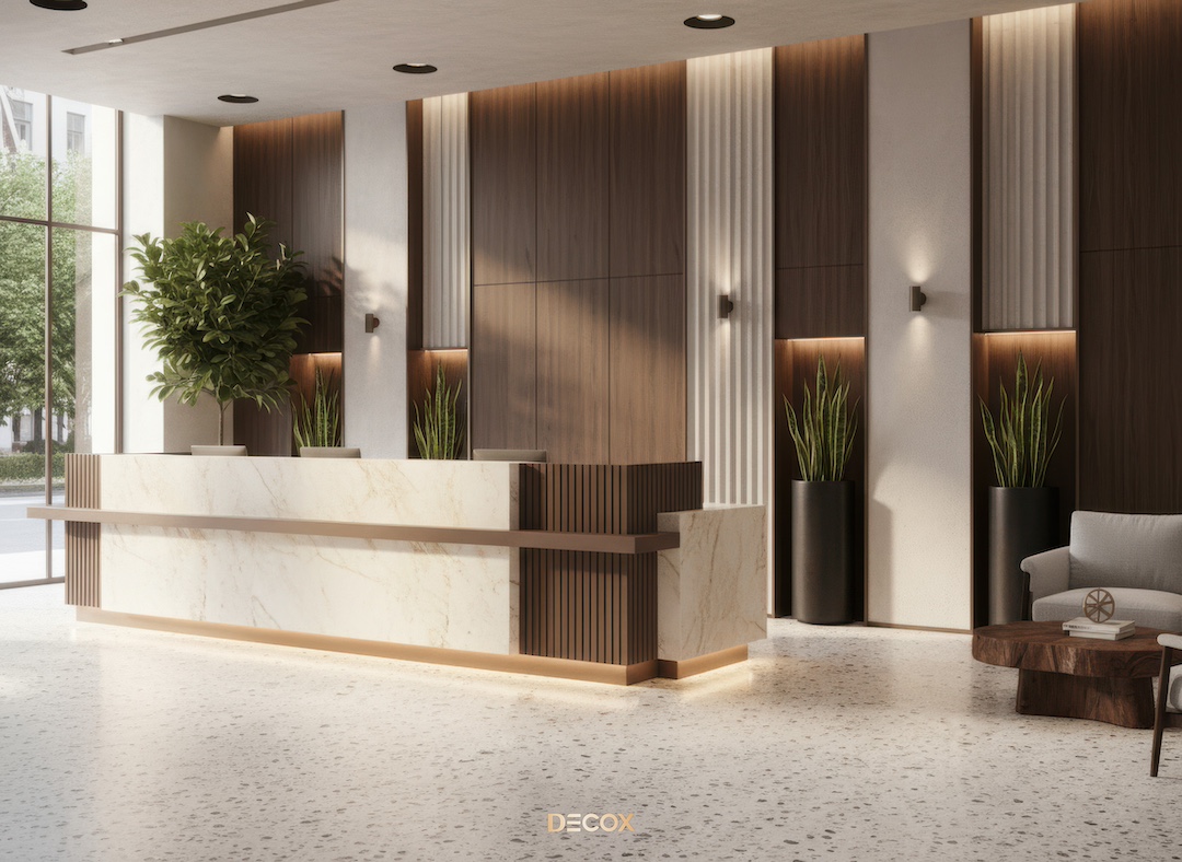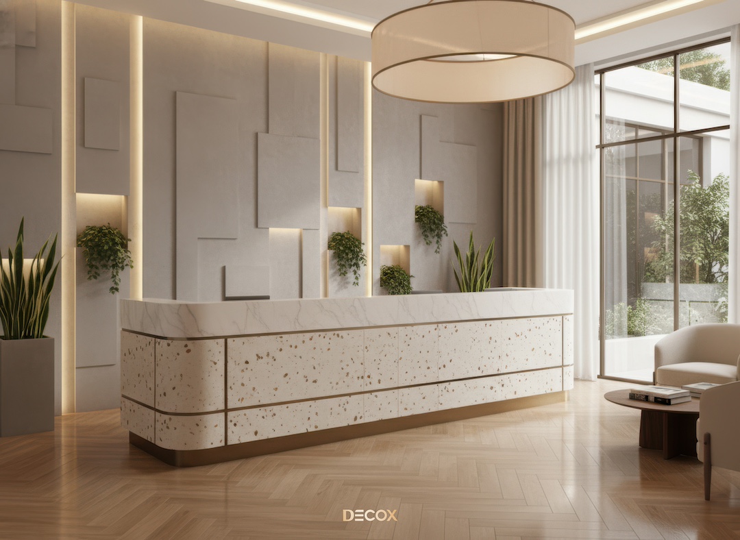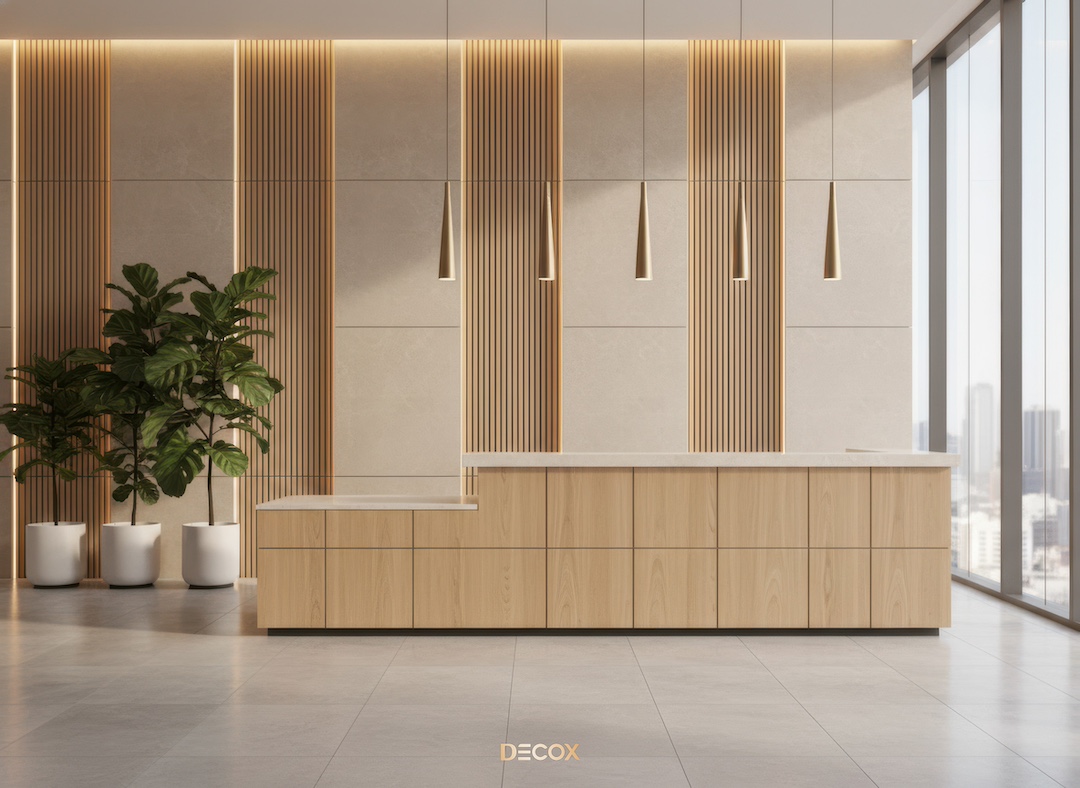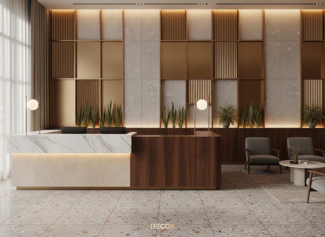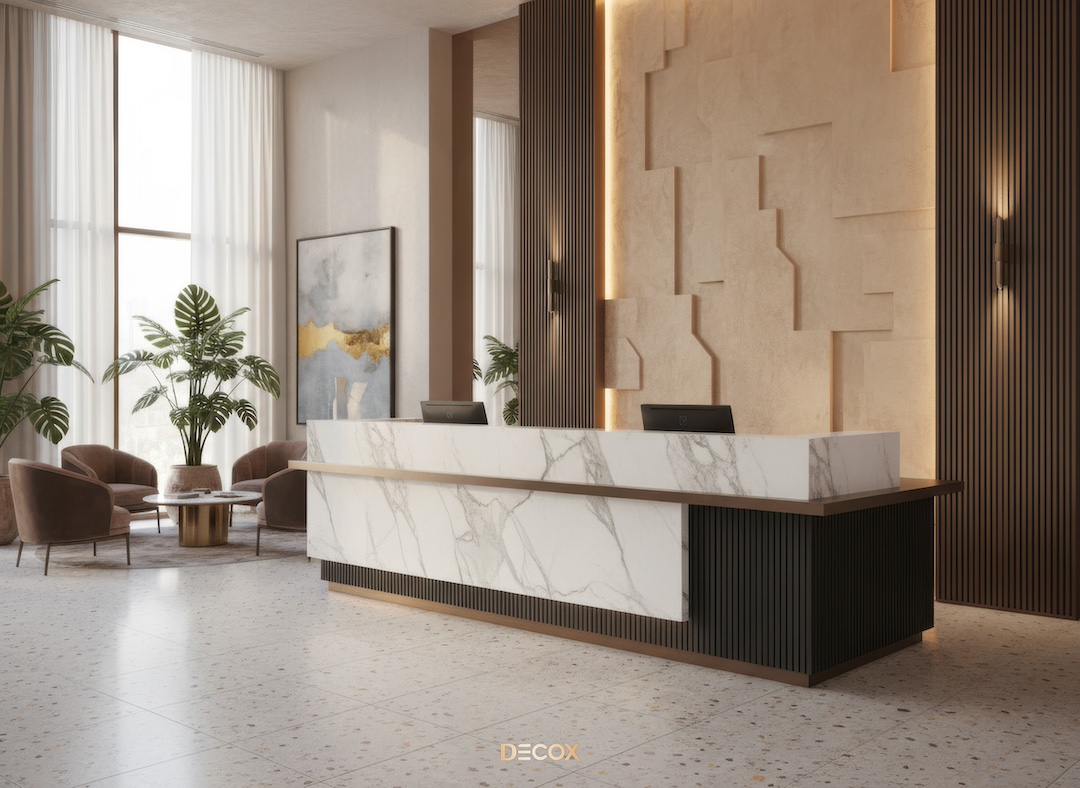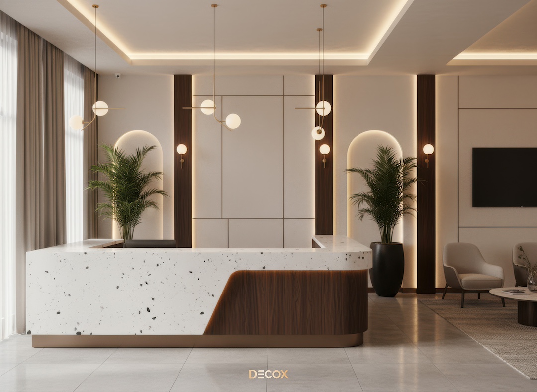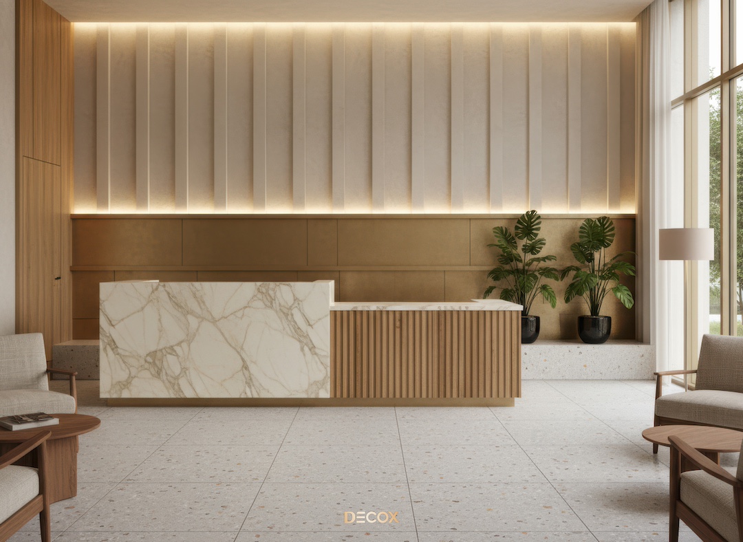 Sảnh văn phòng nhỏ hay những Boutique Hotel, chọn quầy chữ I hoặc quầy bo cong nhẹ với chiều dài khoảng 2.0 – 3.5m. Thiết kế tinh giản giúp giải phóng tầm nhìn, khiến không gian trở nên nhẹ nhàng và dễ tiếp cận.