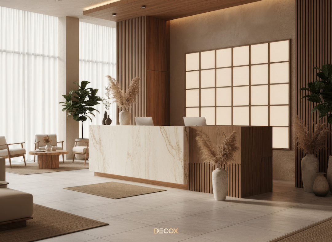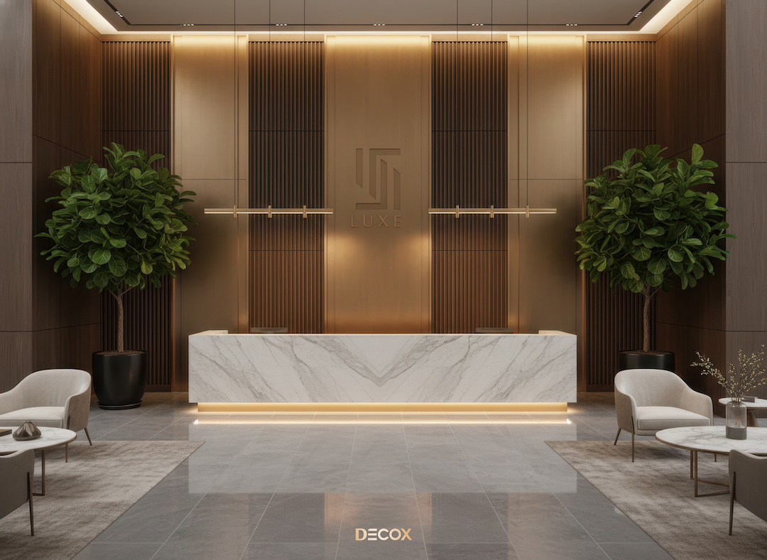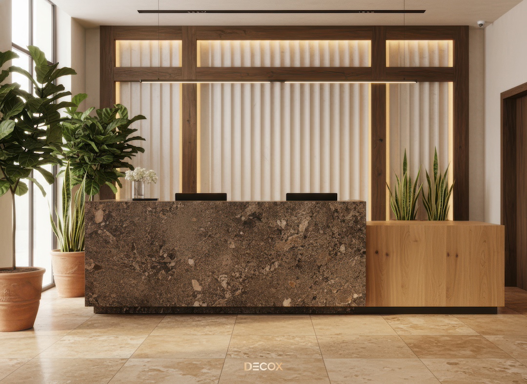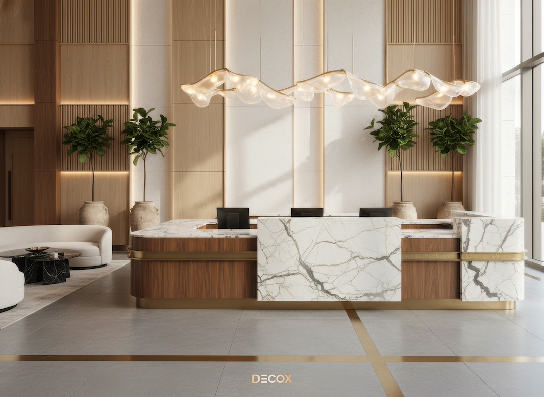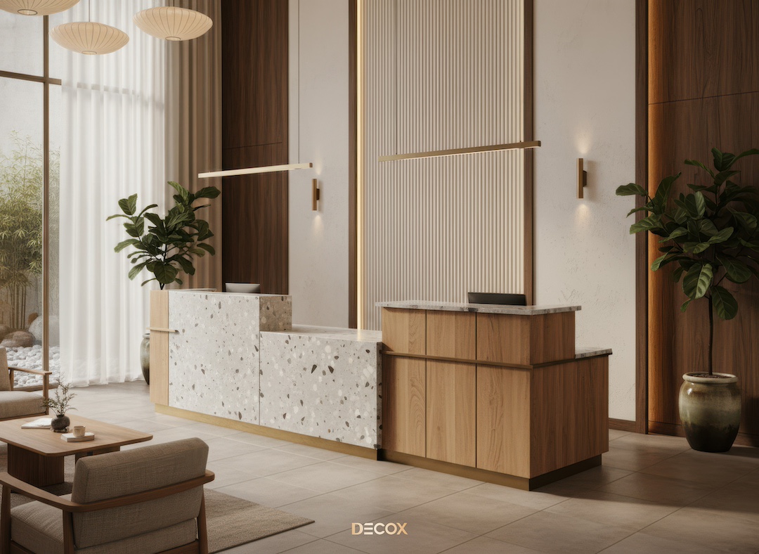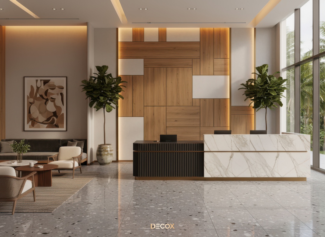Sảnh văn phòng nhỏ hay những Boutique Hotel, chọn quầy chữ I hoặc quầy bo cong nhẹ với chiều dài khoảng 2.0 – 3.5m. Thiết kế tinh giản giúp giải phóng tầm nhìn, khiến không gian trở nên nhẹ nhàng và dễ tiếp cận.