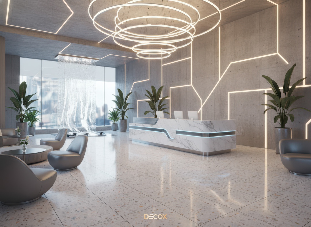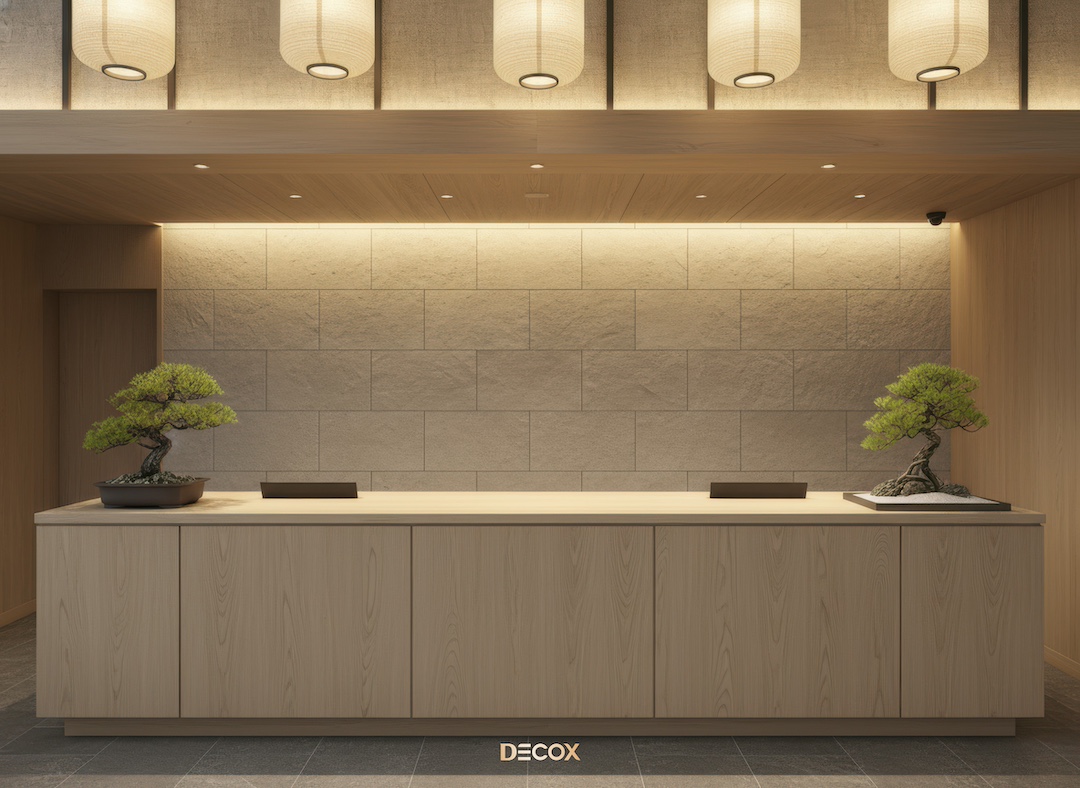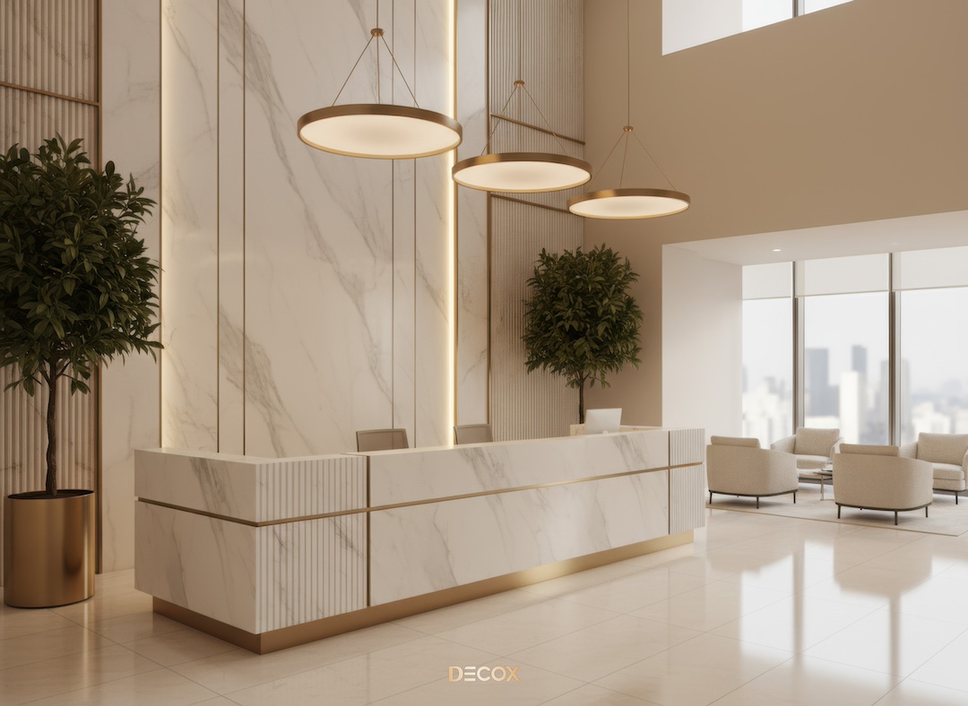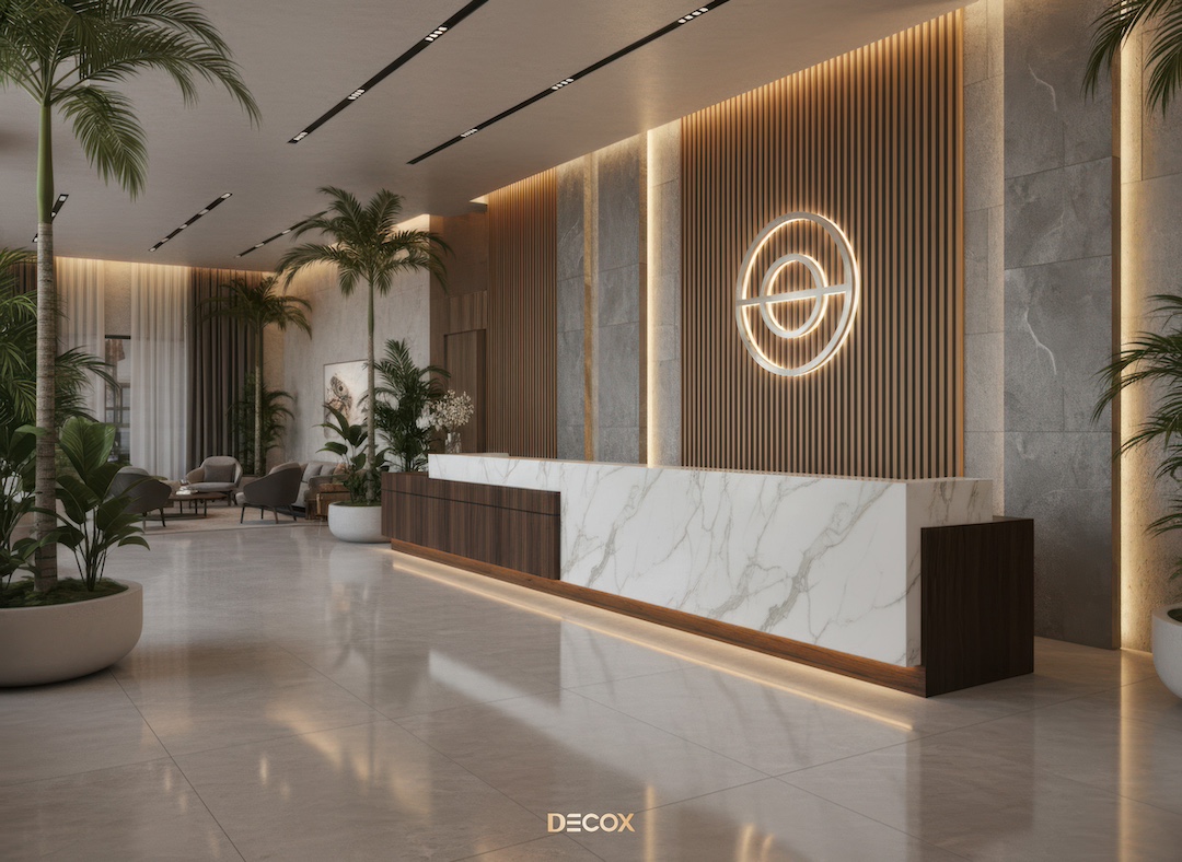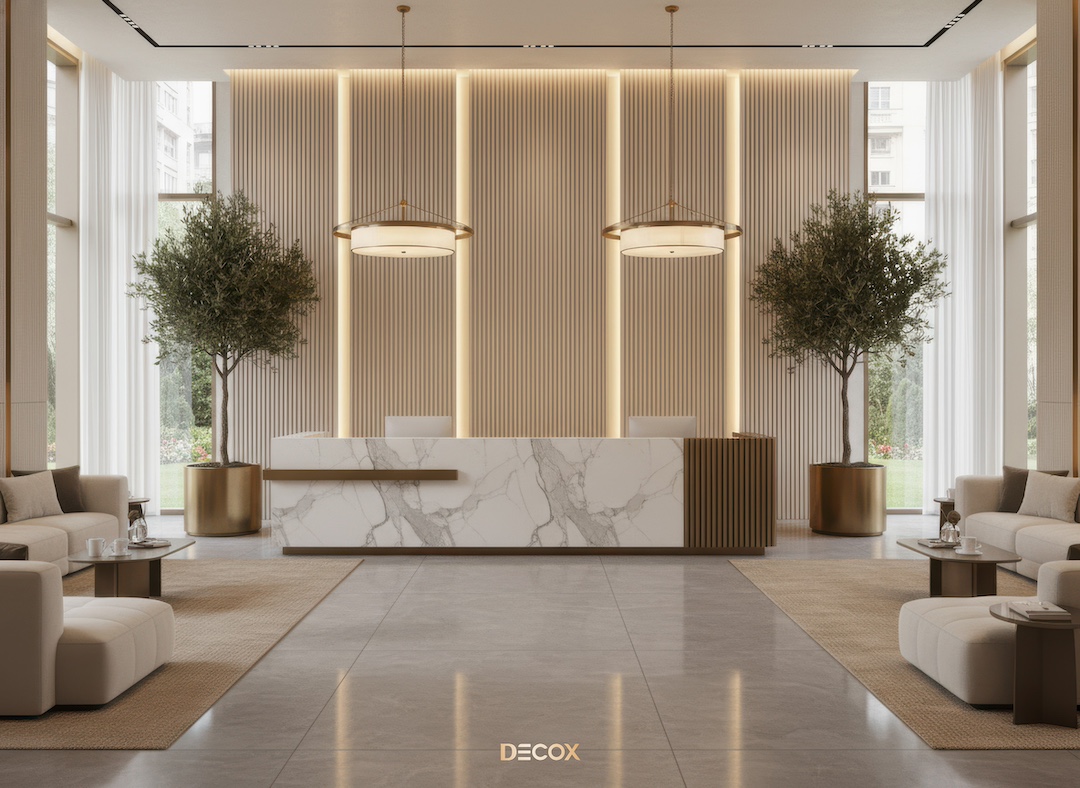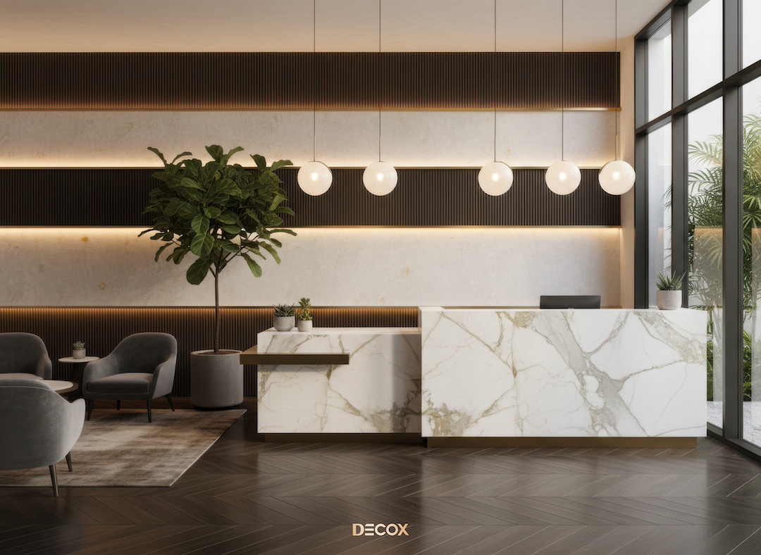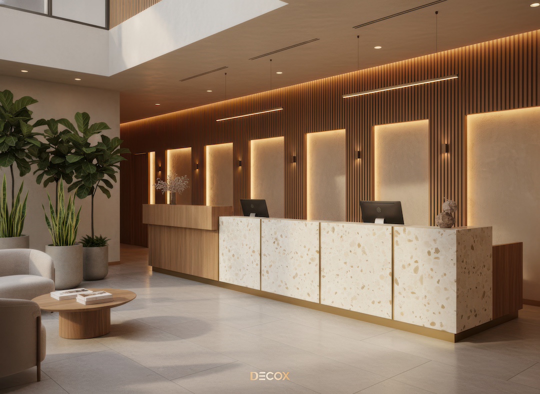 Sảnh văn phòng nhỏ hay những Boutique Hotel, chọn quầy chữ I hoặc quầy bo cong nhẹ với chiều dài khoảng 2.0 – 3.5m. Thiết kế tinh giản giúp giải phóng tầm nhìn, khiến không gian trở nên nhẹ nhàng và dễ tiếp cận.
