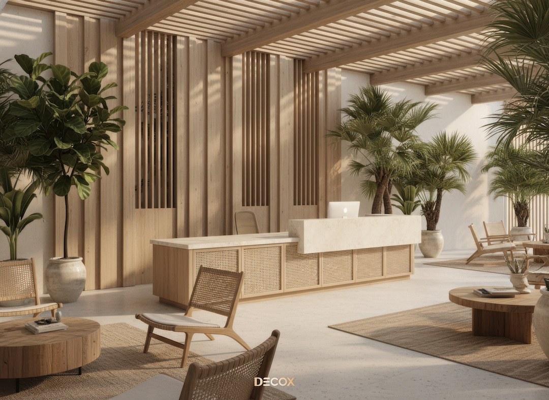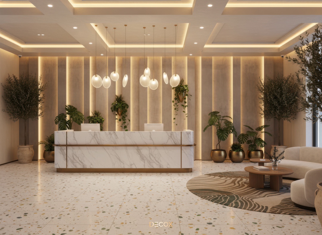 ⇒ Quầy lễ tân chỉ nên chiếm khoảng 20 - 30% chiều dài tường chính, phần viền bo cong hoặc vát góc 30 - 45° để tạo mặt tiếp cận chéo nhằm giữ sự cân bằng thị giác, tránh biến sảnh đón tiếp thành một “check-in hall” nặng tính hành chính.
