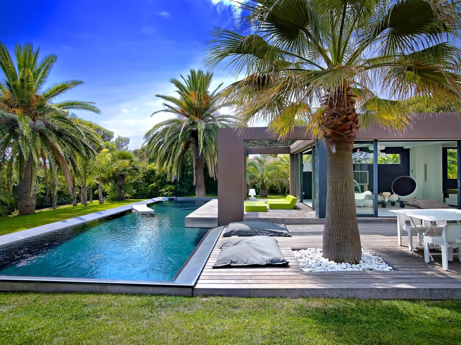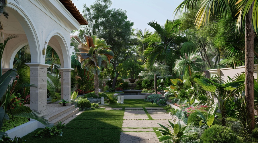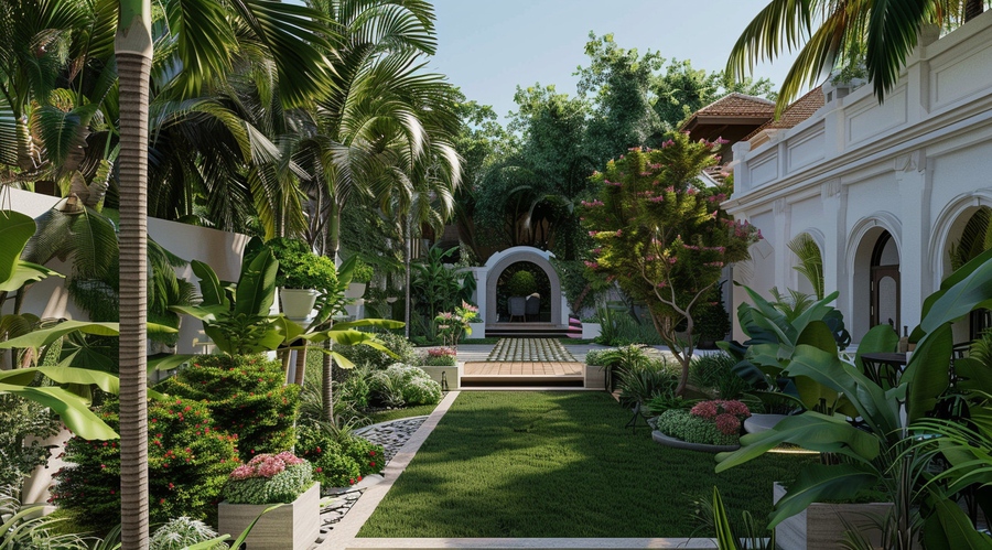 Một không gian sân vườn 1000m2 theo phong cách thiết kế nhiệt đới - Tropical sẽ là lựa chọn thích hợp cho những gia chủ mong muốn thiết kế không gian nghỉ dưỡng thơ mộng đúng chất Resort ngay tại gia. Một trong những đặc điểm không thể thiếu của phong cách sân vườn này chính là sự xuất hiện của những loại cây nhiệt đới như cây dừa, cây cau vua,... Cùng khu vực hồ bơi xanh biếc phản chiếu lóng lánh trên nền màu trung tính, tươi sáng chủ đạo.>> Tham khảo thêm: