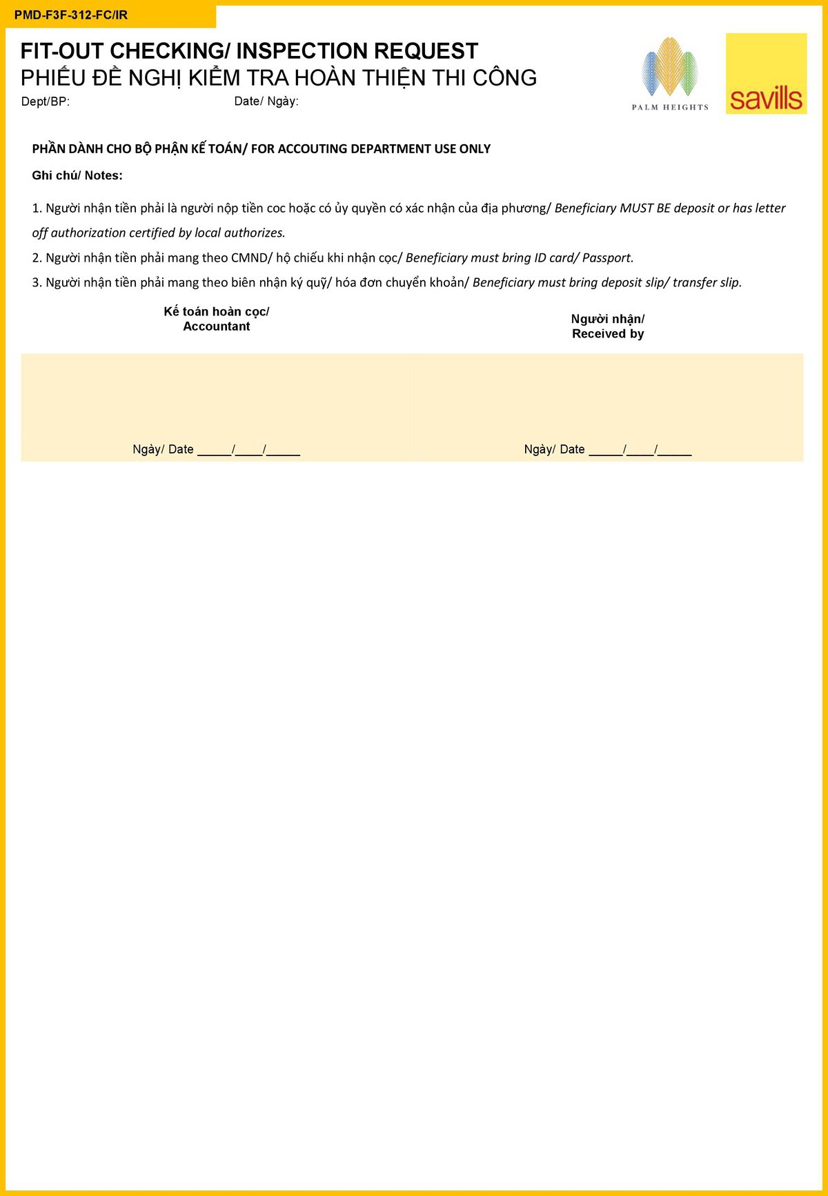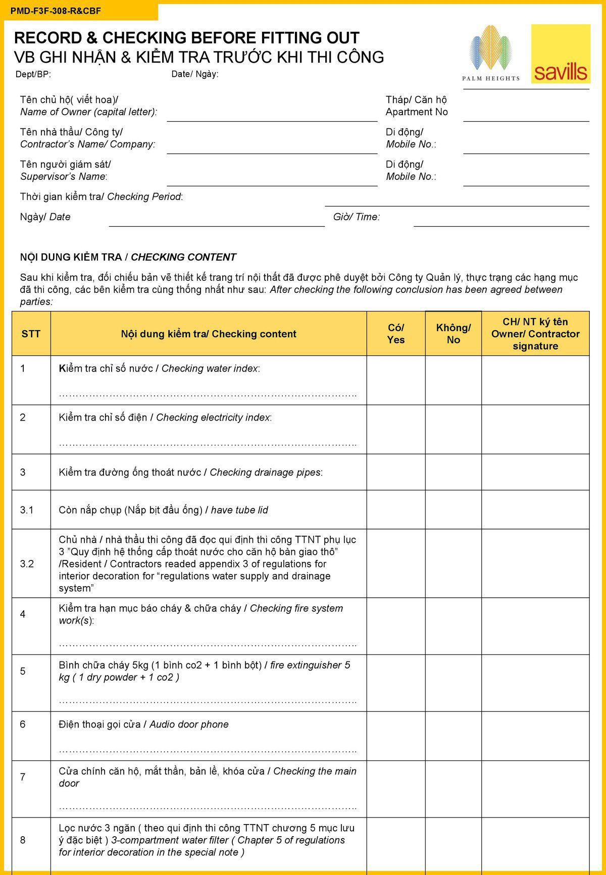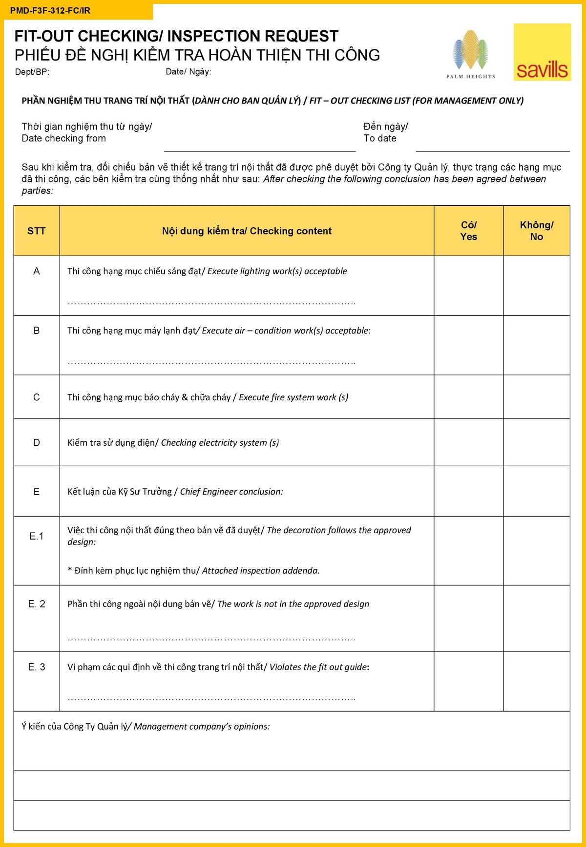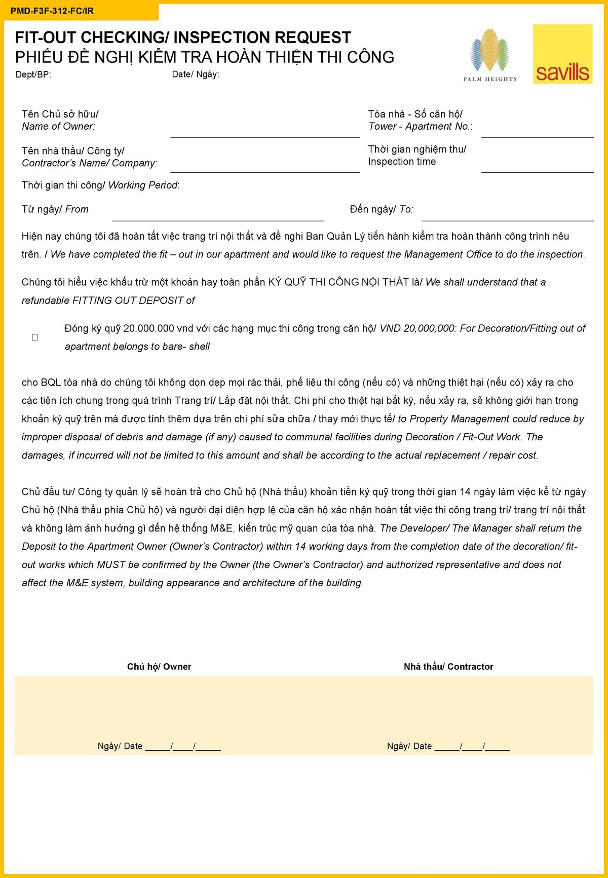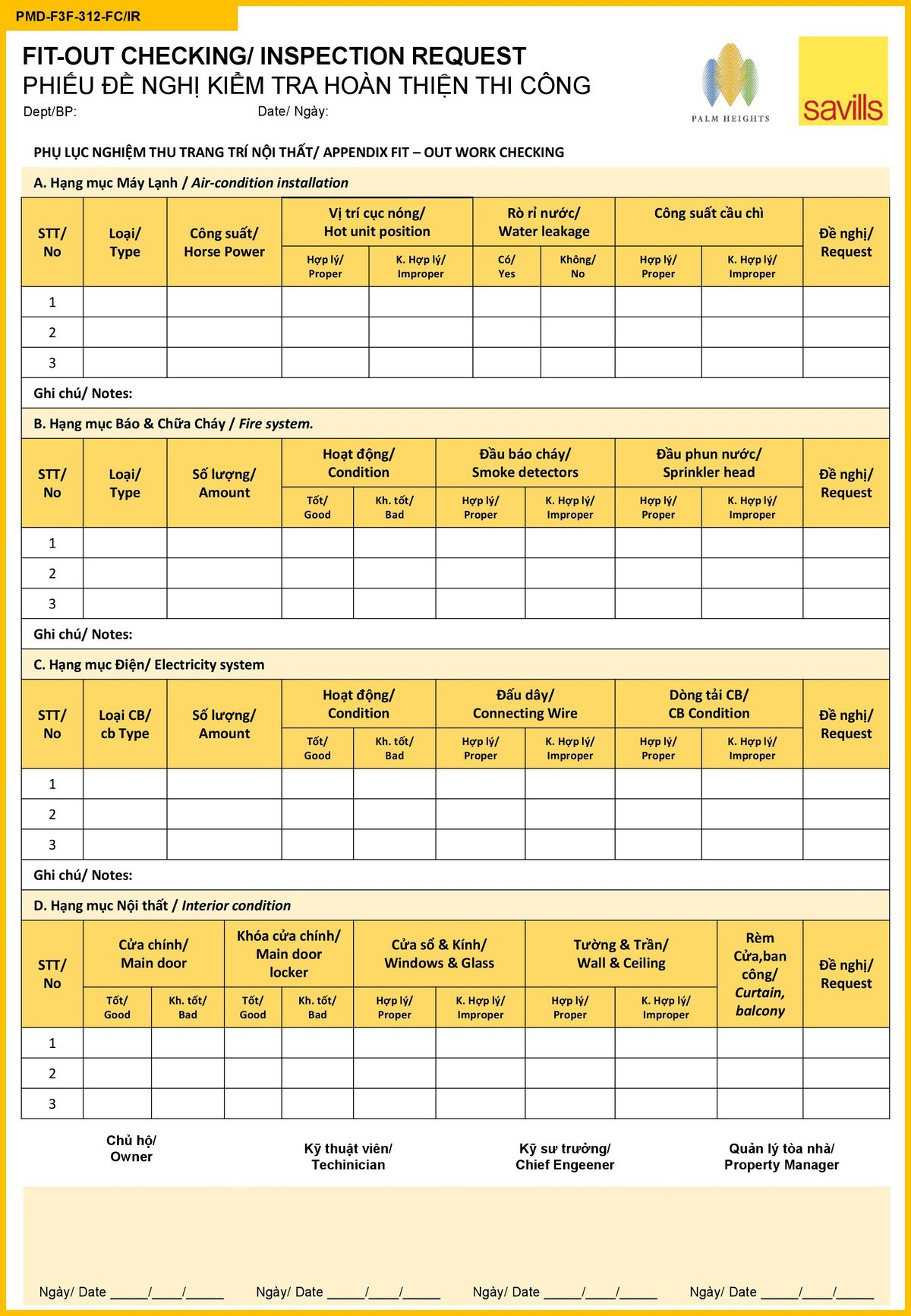 - Phiếu đề nghị kiểm tra hoàn thiện Căn Hộ.