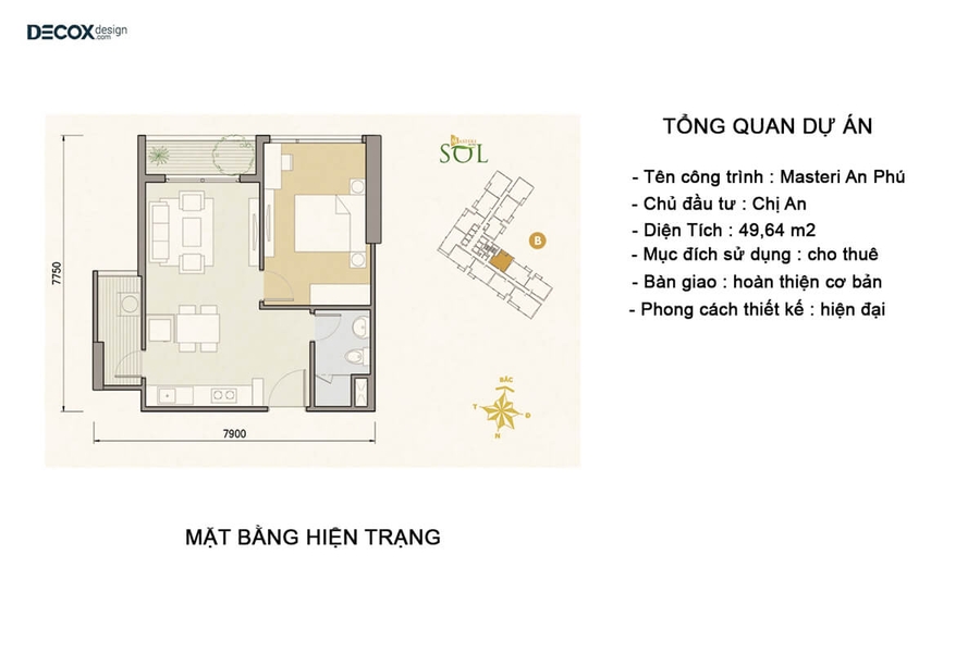 Với tổng diện tích đất tại khu dự án Masteri An Phú là 12,526.7m2 và có thời gian dự kiến hoàn thành vào quý 1 năm 2020. Tọa lạc ở đường Mai Chí Thọ trọng điểm, thuận lợi di chuyển và mang hơi thở của thành thị sôi động, cuộc sống xanh, thu hút được nguồn năng lượng ánh nắng mặt trời hạnh phúc. Chính vì những điều lý tưởng này, việc tư vấn thiết kế nội thất căn hộ chung cư Masteri An Phú diện tích 49,64m2 luôn cần thiết dựa trên mặt bằng điển hình.