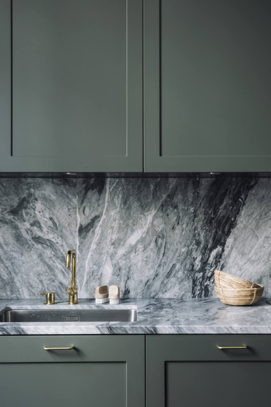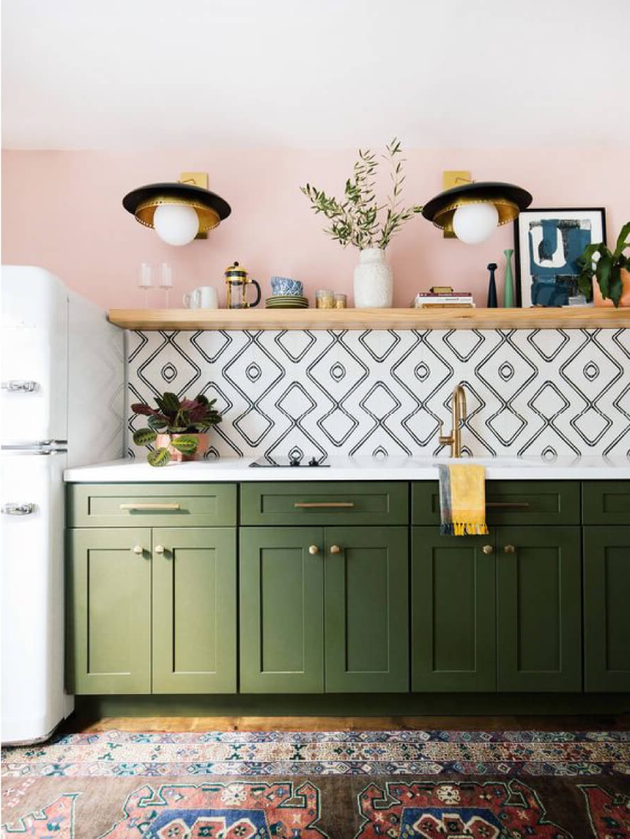 Phòng bếp hiện đại được bố trí gọn gàng nhưng vẫn đầy đủ công năng, được phủ lớp màu xanh lá pha thêm một chút hồng của sơn tường hoặc có thể thiết kế dàn tủ bếp phía trên để có không gian cất giữ đồ đạc.