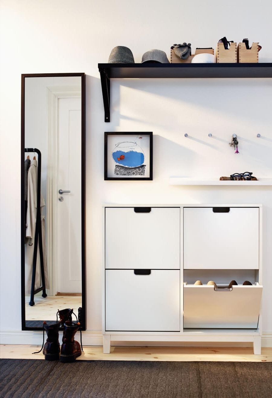 Ngay cửa ra vào là khu vực để giày, lắp đặt với tủ hình vuông có 4 ngăn và một gương soi hình chữ nhật. Chị An khá kỹ tính cho việc xem lại trang phục, phụ kiện trước khi ra ngoài.