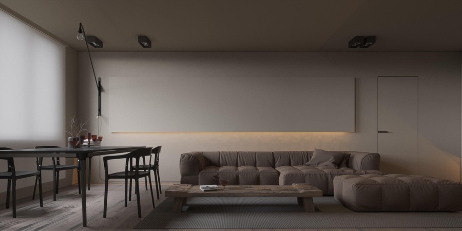 Nhà thiết kế của Decox Design chọn gam màu trắng, nâu, xám cho không gian tiếp khách và tạo điểm nhấn bằng màu sắc và tranh tường đơn giản. Cách bố trí ánh sáng bằng các loại đèn cũng rất hiệu quả trong việc tạo điểm nhấn trong thiết kế nội thất phòng khách.