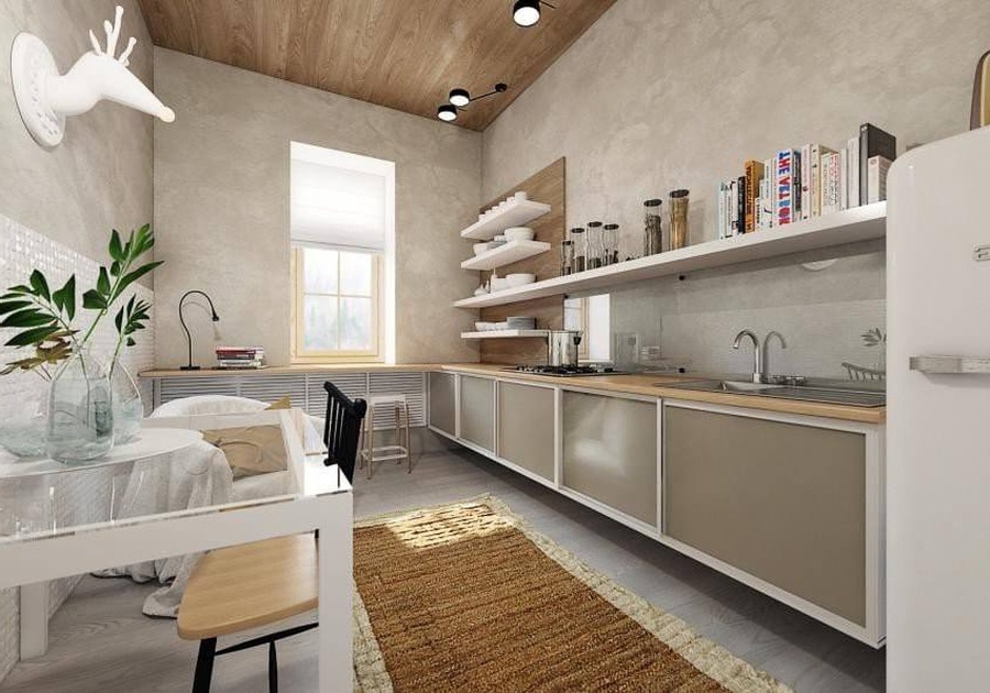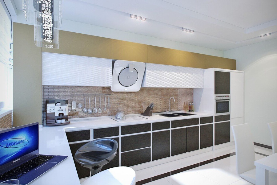 Để tạo sự hiện đại, trẻ trung cho không gian chính của ngôi nhà, gia chủ chọn cách thiết kế nội thất phòng bếp với quầy bar thay vì đảo bếp. Phương án thiết kế này mang tới sự sang trọng và tối đa công năng hơn cho khu vực phòng khách – bếp.