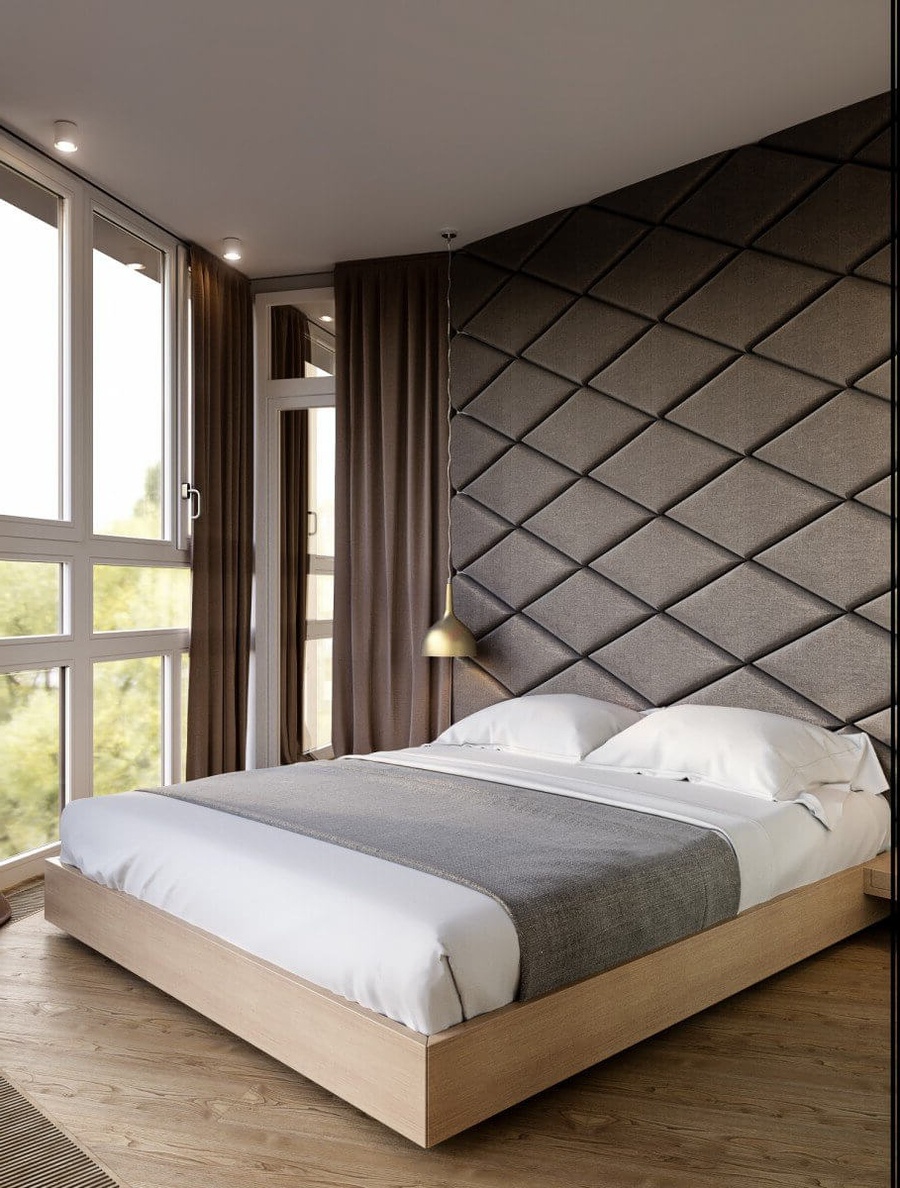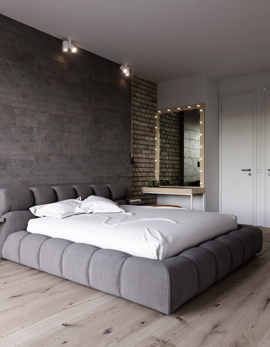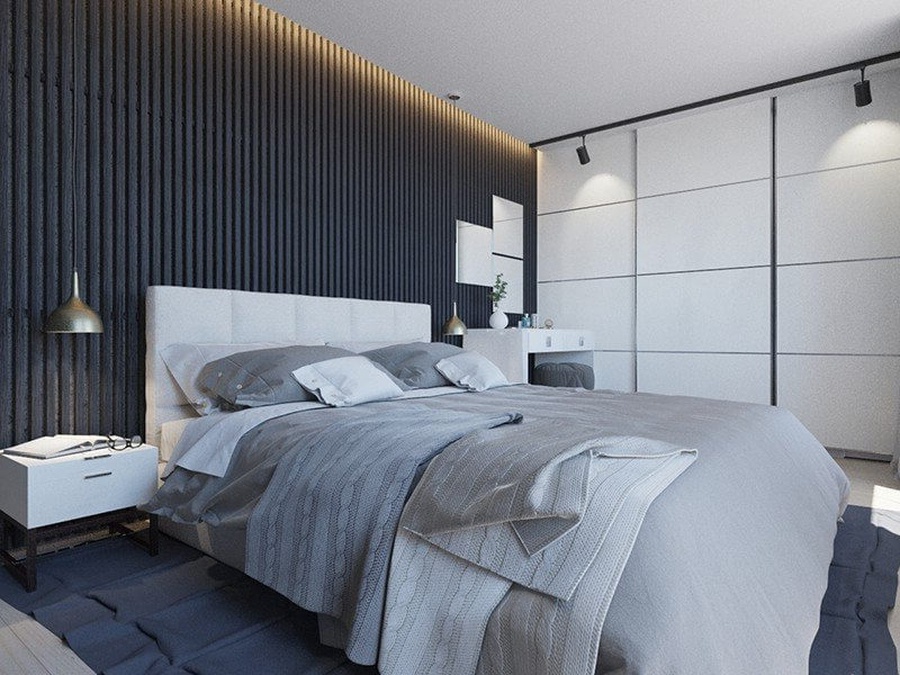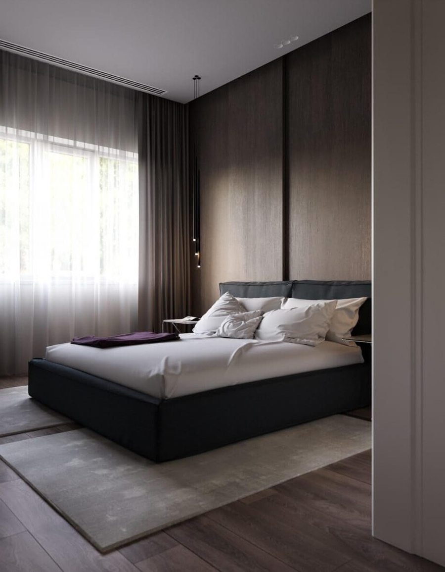 Phòng ngủ master theo phong cách Minimalist chọn vật liệu gỗ áp dụng cho sàn nhà và giường ngủ. Phương án giường phản khá thú vị cho không gian phòng ngủ. Nó vừa giúp không gian nhẹ nhàng so với giường ngủ truyền thống vừa mang nét trẻ trung, hiện đại. Để tạo điểm nhấn cho thiết kế nội thất phòng ngủ, có thể xử lý tab đầu giường bằng cách ốp vật liệu gỗ và chạy đèn down light để có hiệu ứng ánh sáng đẹp mắt hoặc sơn hiệu ứng, chạy chỉ tường…