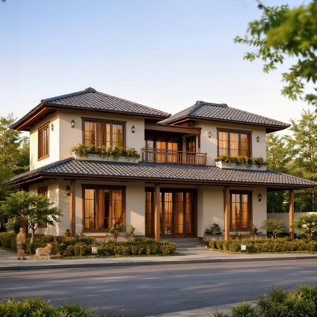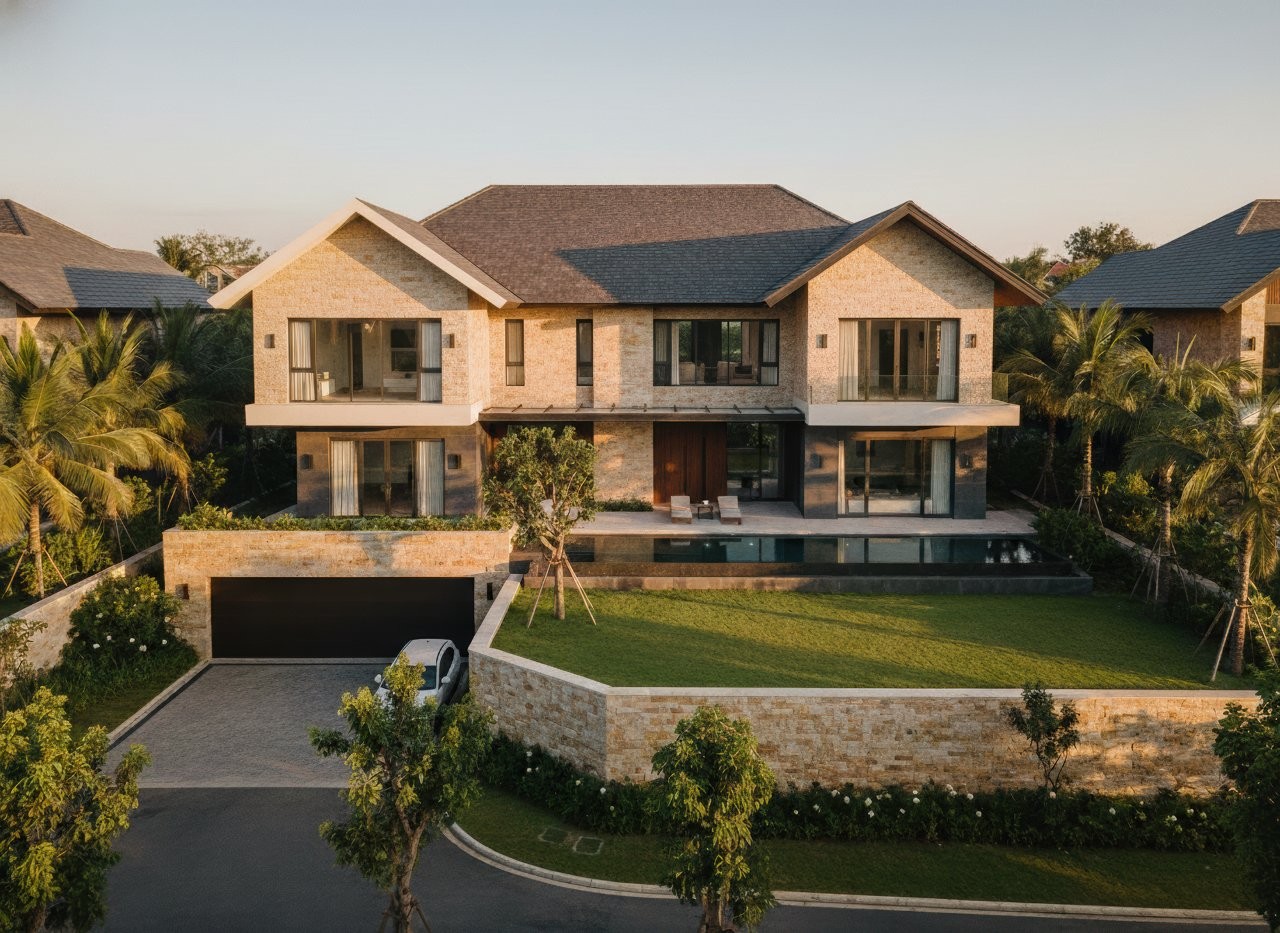 Mái Thái là lựa chọn phù hợp với khí hậu Việt Nam nhờ cấu trúc bốn mặt dốc hội tụ về đỉnh, độ dốc khoảng 25-35 độ giúp thoát nước tốt trong mùa mưa và tạo lớp đệm không khí hỗ trợ cách nhiệt cho không gian sống bên dưới. Về mặt thẩm mỹ, hệ mái này góp phần tôn lên vẻ thanh thoát, giúp công trình trông cao ráo và bề thế hơn. Các lớp ngói xếp chồng tạo nên một “nhịp điệu” kiến trúc riêng, nơi vẻ đẹp truyền thống Á Đông giao hòa tinh tế cùng hơi thở hiện đại.