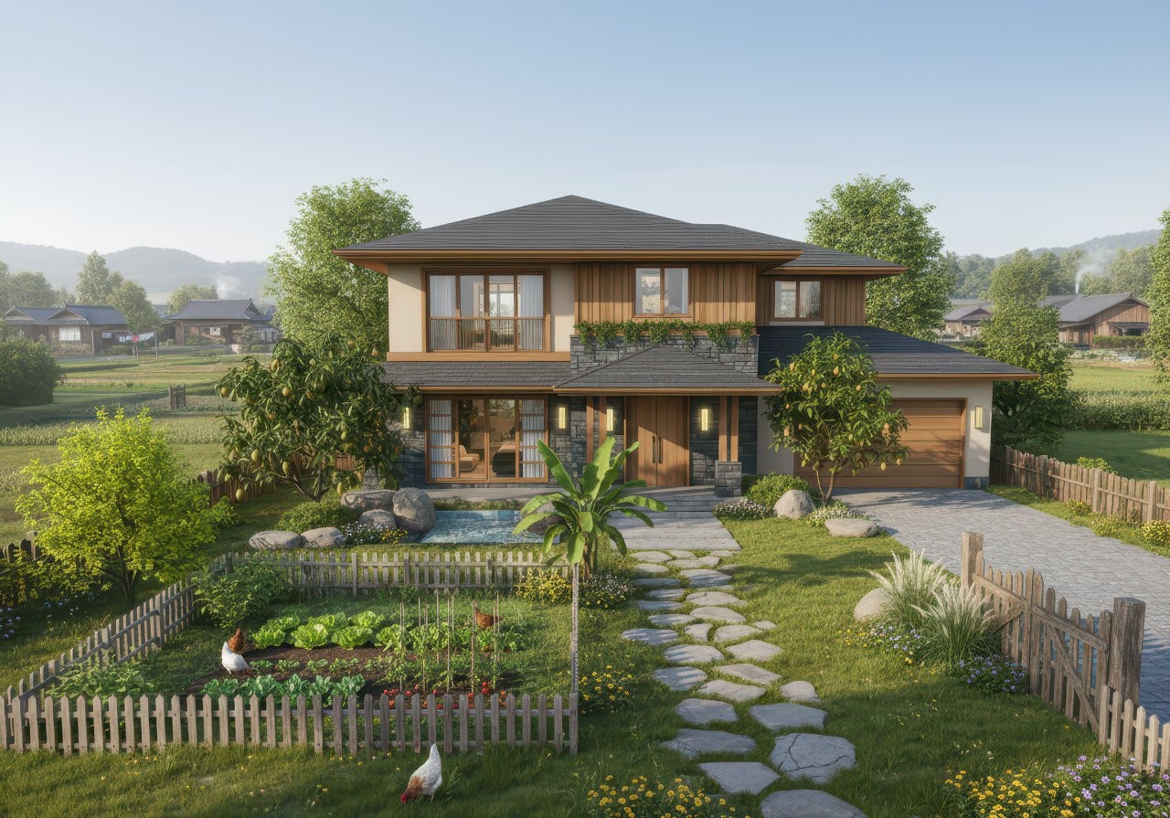 Biệt thự nhà vườn 2 tầng được ví như những resort thu nhỏ, phù hợp với những gia chủ mong muốn tìm về sự cân bằng với thiên nhiên. Tại đây, ranh giới bê tông cốt thép bị xóa bỏ, nhường chỗ cho tiếng chim hót và bầu không khí trong lành. Sân vườn được quy hoạch bài bản như một hệ sinh thái thu nhỏ. Từ những gốc cây ăn trái tỏa bóng mát, hồ cá Koi tĩnh tại cho đến khu vực BBQ ngoài trời... tất cả kiến tạo nên một không gian "chữa lành" đúng nghĩa, nơi gia chủ có thể tận hưởng cuộc sống điền viên thư thái ngay tại gia.