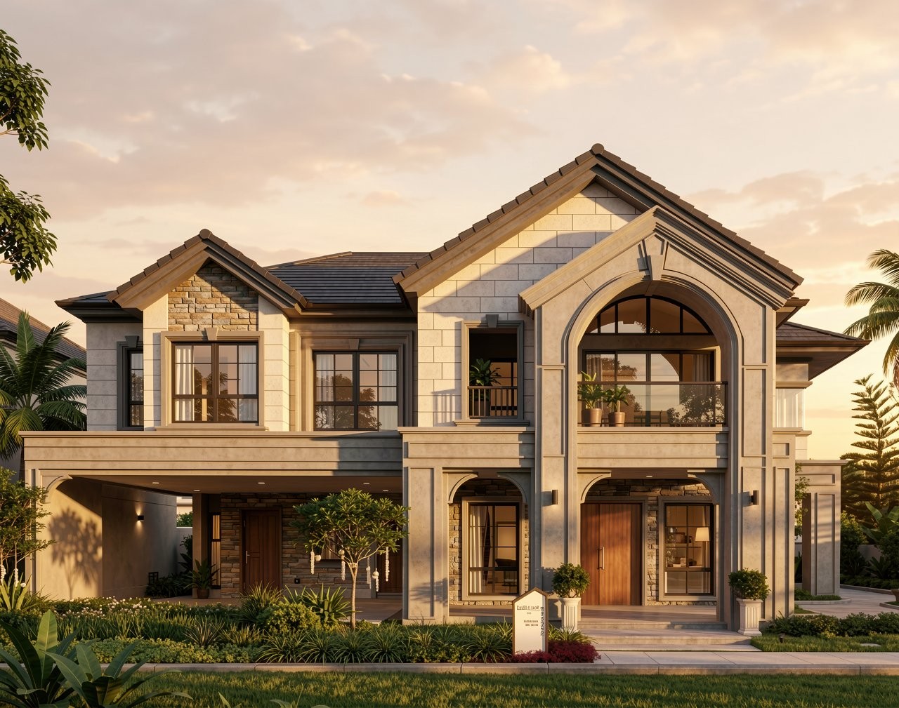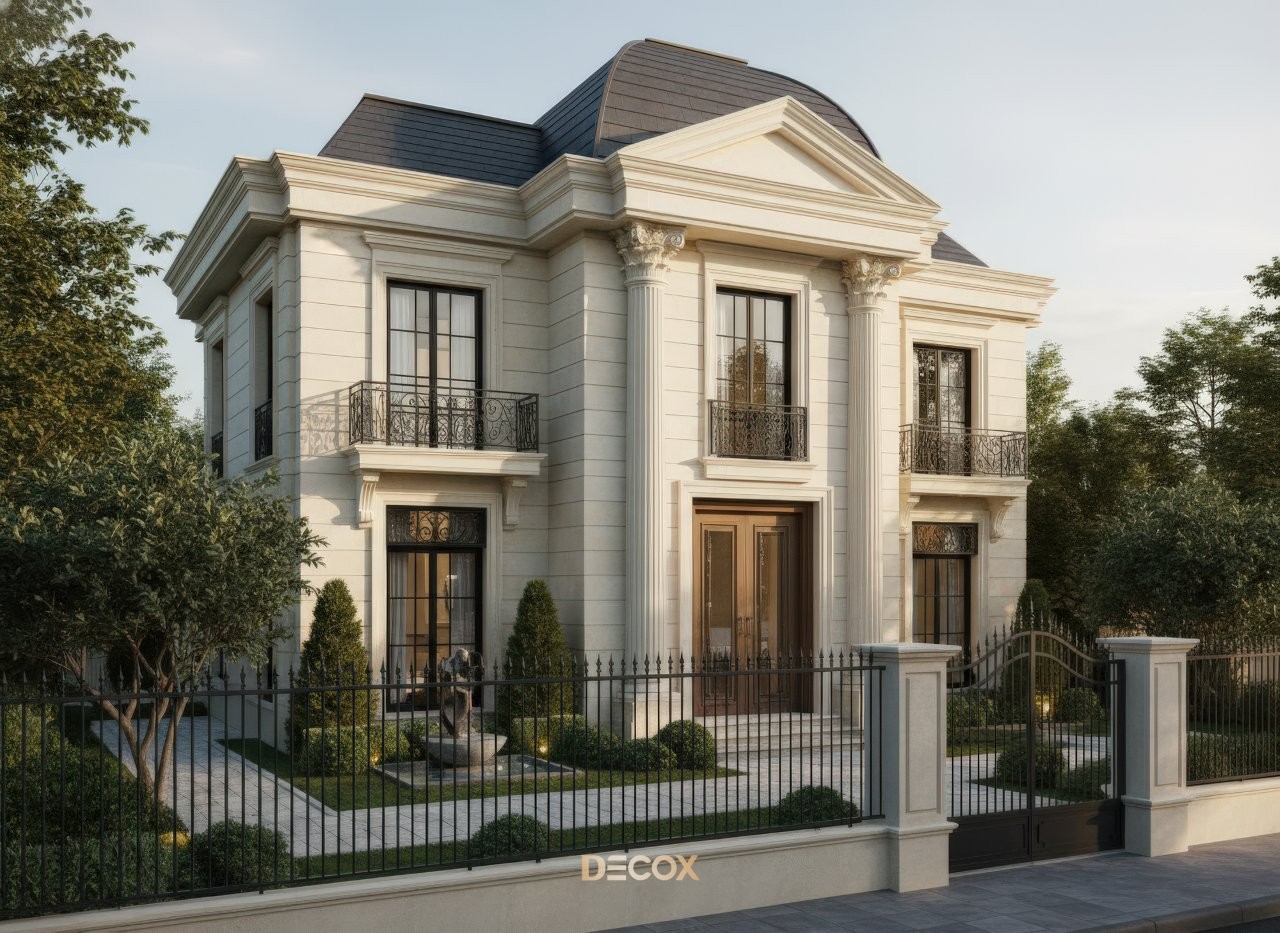 Đặc trưng cốt lõi của mẫu nhà biệt thự 2 tầng phong cách Tân cổ điển này nằm ở tính đối xứng tuyệt đối và "tỷ lệ vàng" trong hình khối. Mặt tiền thường gây ấn tượng mạnh mẽ bởi hệ thức cột Ionic hay Corinthian vững chãi tại sảnh chính kết hợp cùng lan can sắt mỹ thuật tạo nên vẻ đẹp sang trọng, bền bỉ với thời gian. Song hành cùng đó là những đường phào chỉ đắp nổi tinh tế chạy dọc tường và bao quanh khung cửa. Các chi tiết rườm rà được tiết chế, nhường chỗ cho vẻ đẹp thanh thoát của hệ mái Thái thanh thoát hoặc vẻ uy quyền của mái Mansard ốp đá phiến.