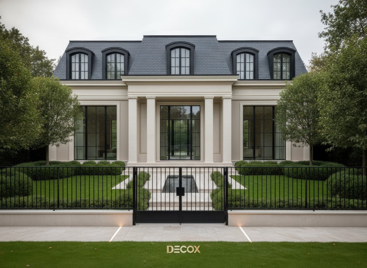 Hệ mái Mansard hình thang úp ngược phủ đá phiến màu sẫm mang đến vẻ đẹp vương giả, uy quyền tựa như những tòa lâu đài Pháp tráng lệ. Không chỉ dừng lại ở giá trị thẩm mỹ, mái Mansard còn là giải pháp kiến trúc thông minh giúp gia chủ khéo léo mở rộng thêm một tầng công năng (tầng tum/áp mái) để bố trí thêm phòng ngủ, phòng thờ hay không gian giải trí riêng tư. Đây là cách tuyệt vời để gia tăng tiện ích sử dụng cho gia đình đông thành viên mà vẫn giữ được tỷ lệ hình khối cân đối, hài hòa của một căn biệt thự 2 tầng.