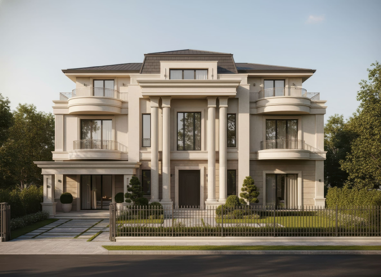 Sự phối hợp giữa kiến trúc cổ điển, vật liệu cao cấp và nhịp điệu hai mặt tiền giúp biệt thự Tân cổ điển trở thành biểu tượng của phong cách sống đẳng cấp