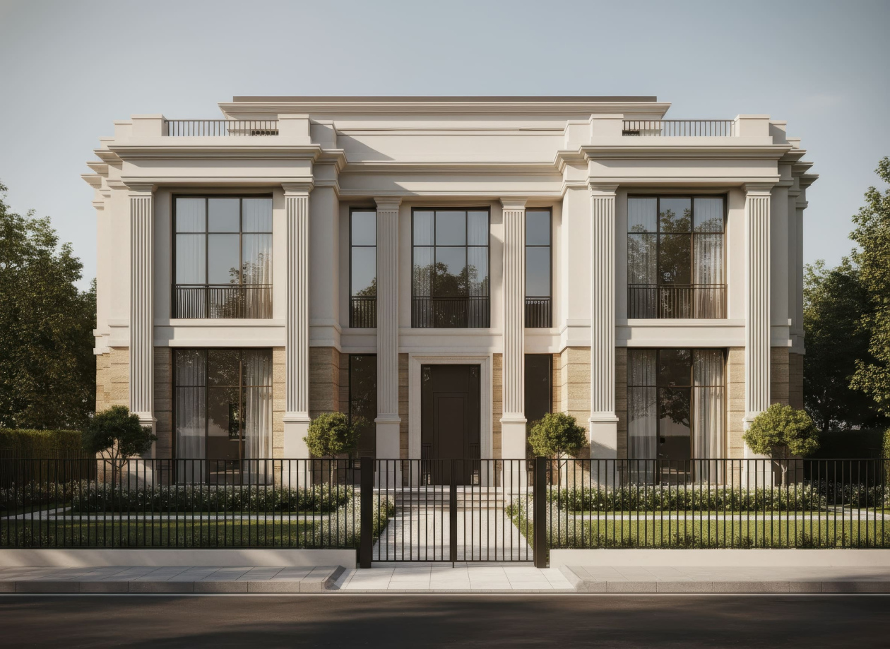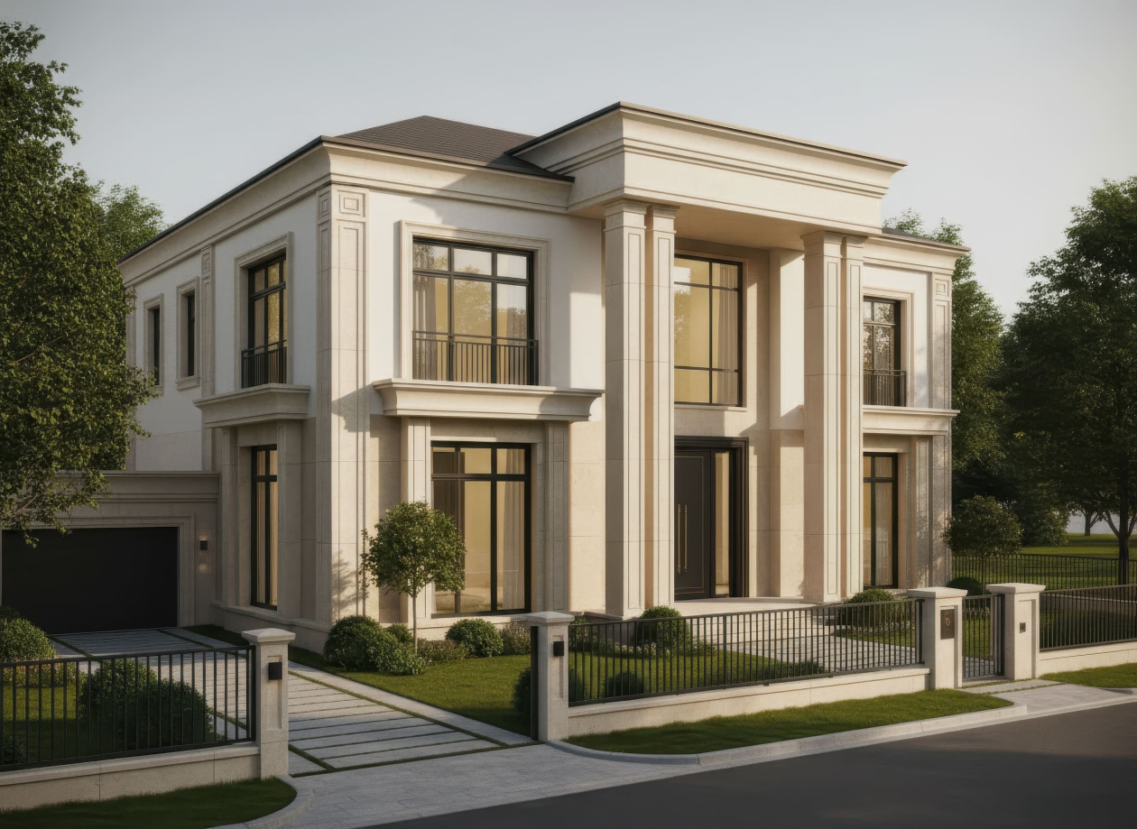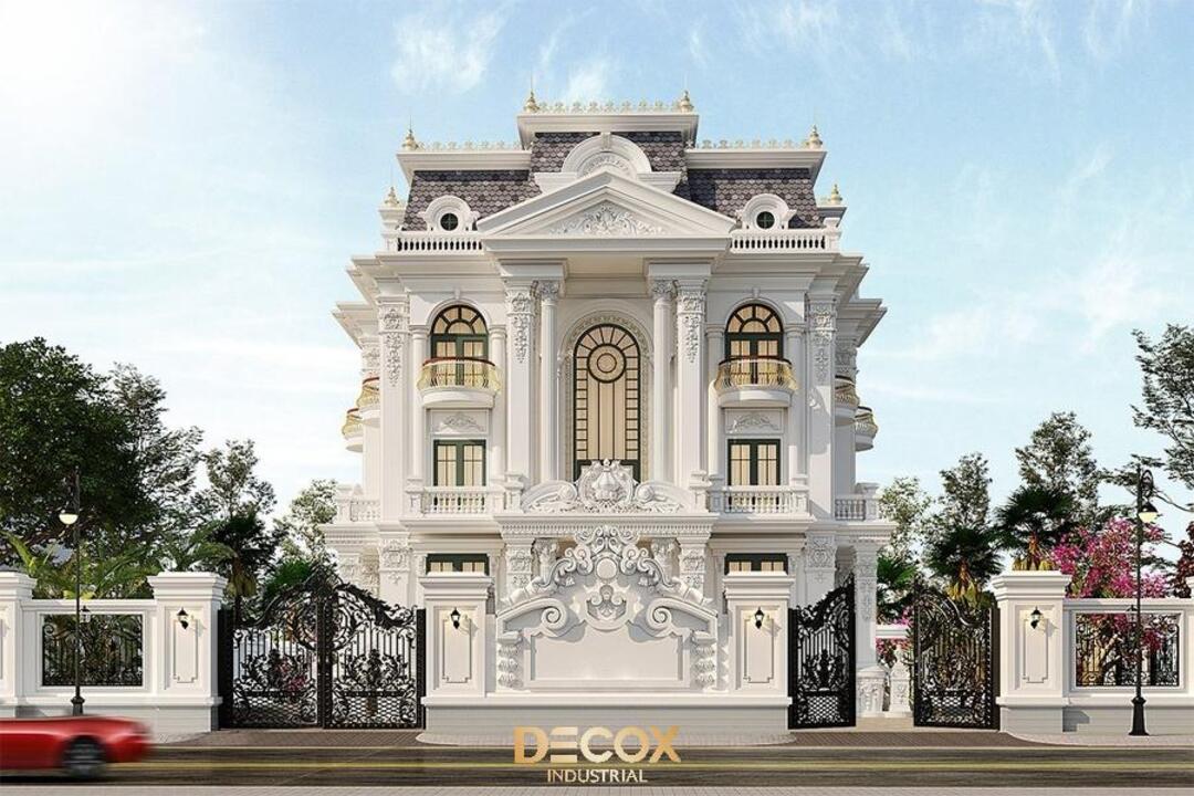 Biệt thự Tân cổ điển kiểu Pháp nổi bật với mặt tiền đăng đối, cân bằng hoàn hảo và các chi tiết trang trí cầu kỳ nhưng tinh tế. Điểm nhấn đặc trưng là mái mansard, các cột trụ Corinthian hoặc Ionic, phào chỉ, phù điêu và lan can hoa văn sắt uốn cong tinh xảo, tạo vẻ đẹp thanh lịch và quý phái. Cửa sổ cao, đối xứng, thường kết hợp mái vòm hoặc khung kính lớn, giúp không gian nội thất luôn tràn ngập ánh sáng tự nhiên.