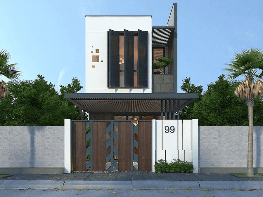 Với nhà ống 2 tầng, mặt tiền chỉ nên chọn 1-2 điểm nhấn chủ đạo như ban công tầng 2, một mảng tường nhấn hoặc hệ lam che nắng nhẹ, bố trí đúng chỗ để tôn dáng công trình thay vì dàn trải nhiều chi tiết gây rối mắt. Các chi tiết trang trí cần được tiết chế, ưu tiên đường nét gọn gàng và những hạng mục vừa đẹp vừa có công năng như lan can thanh mảnh, lam đứng – lam ngang hay bồn cây nhỏ. Ngược lại, phào chỉ dày, vật liệu cầu kỳ hoặc trang trí lan man trên toàn bộ mặt đứng nên được hạn chế vì dễ làm ngôi nhà trông thấp, nặng và nhanh lỗi thời.