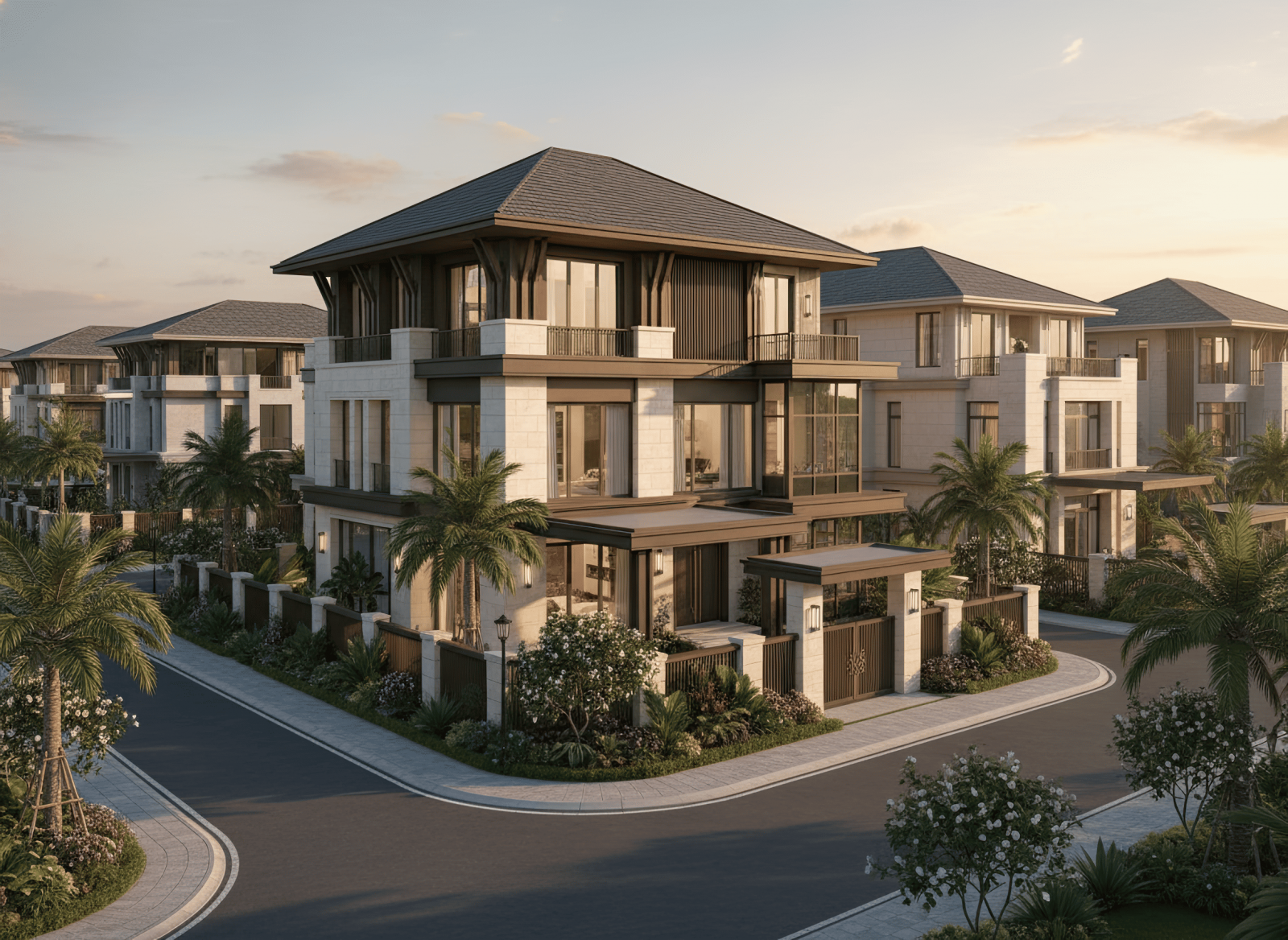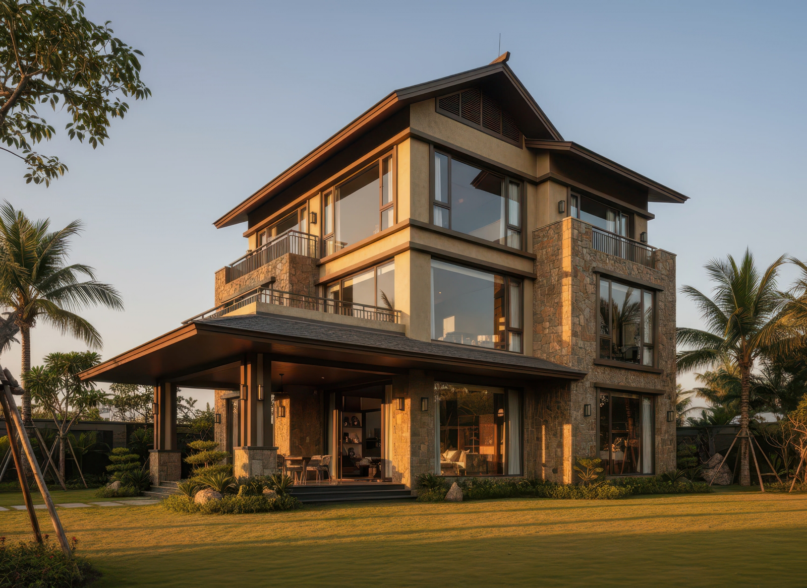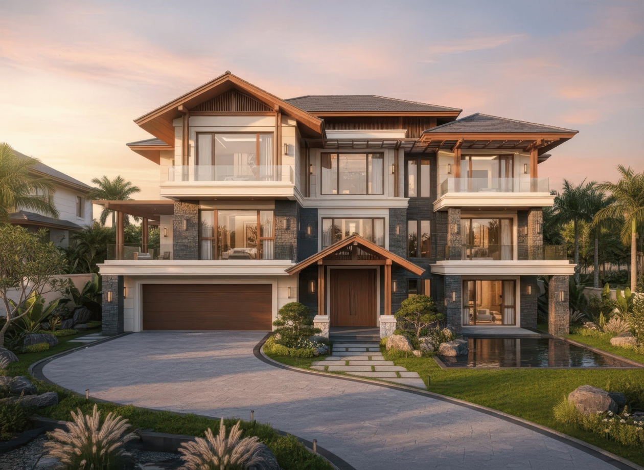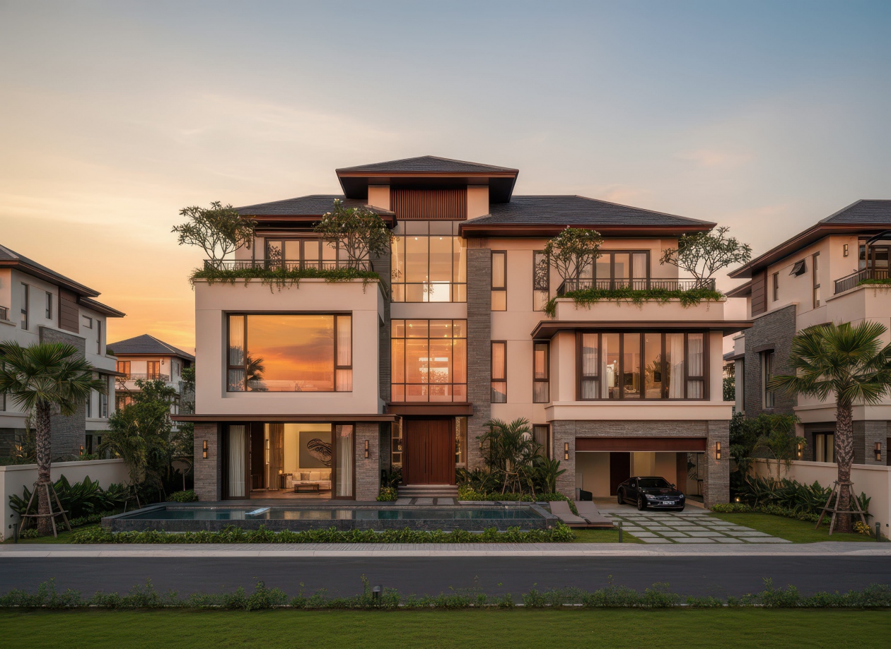 Nhà 3 tầng mái Nhật tân cổ điển nổi bật với mái dốc thấp kết hợp phào chỉ, cột trụ và chi tiết hoa văn tinh xảo, tạo nên vẻ sang trọng và thanh lịch đặc trưng của tân cổ điển. Kiến trúc chú trọng tỷ lệ cân đối giữa các tầng, hệ thống cửa sổ, ban công và mặt tiền, mang đến sự hài hòa và cân bằng thẩm mỹ. Màu sắc thường là tông trung tính kết hợp điểm nhấn vàng, trắng hoặc kem, cùng vật liệu cao cấp như đá, gạch và kính, giúp biệt thự vừa giữ được nét cổ điển tinh tế, vừa hiện đại và tiện nghi.
