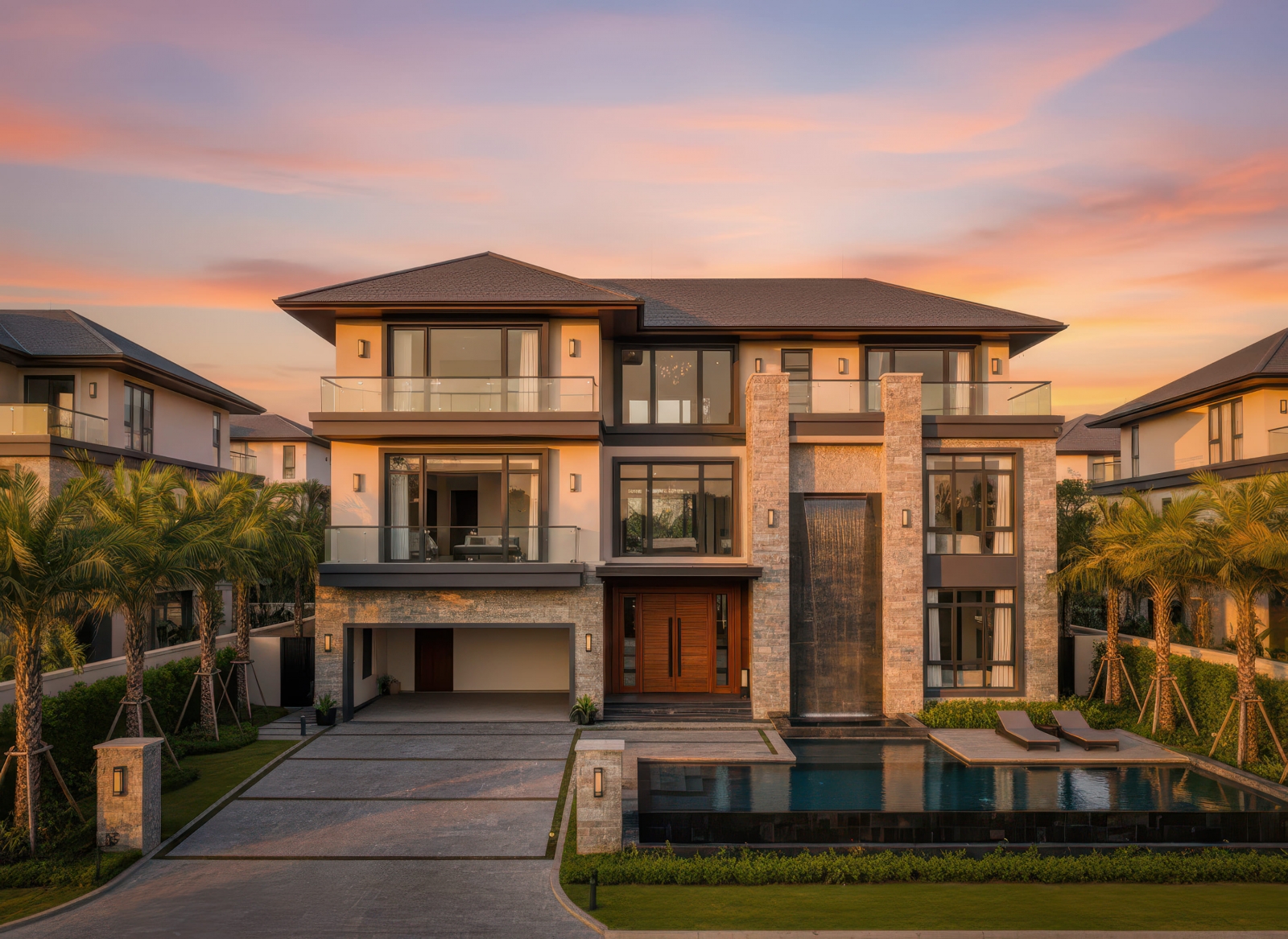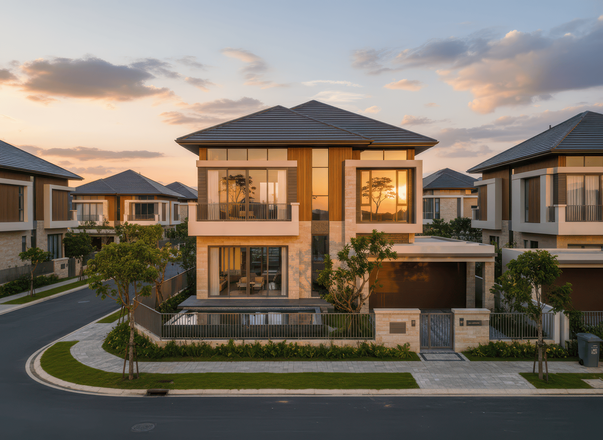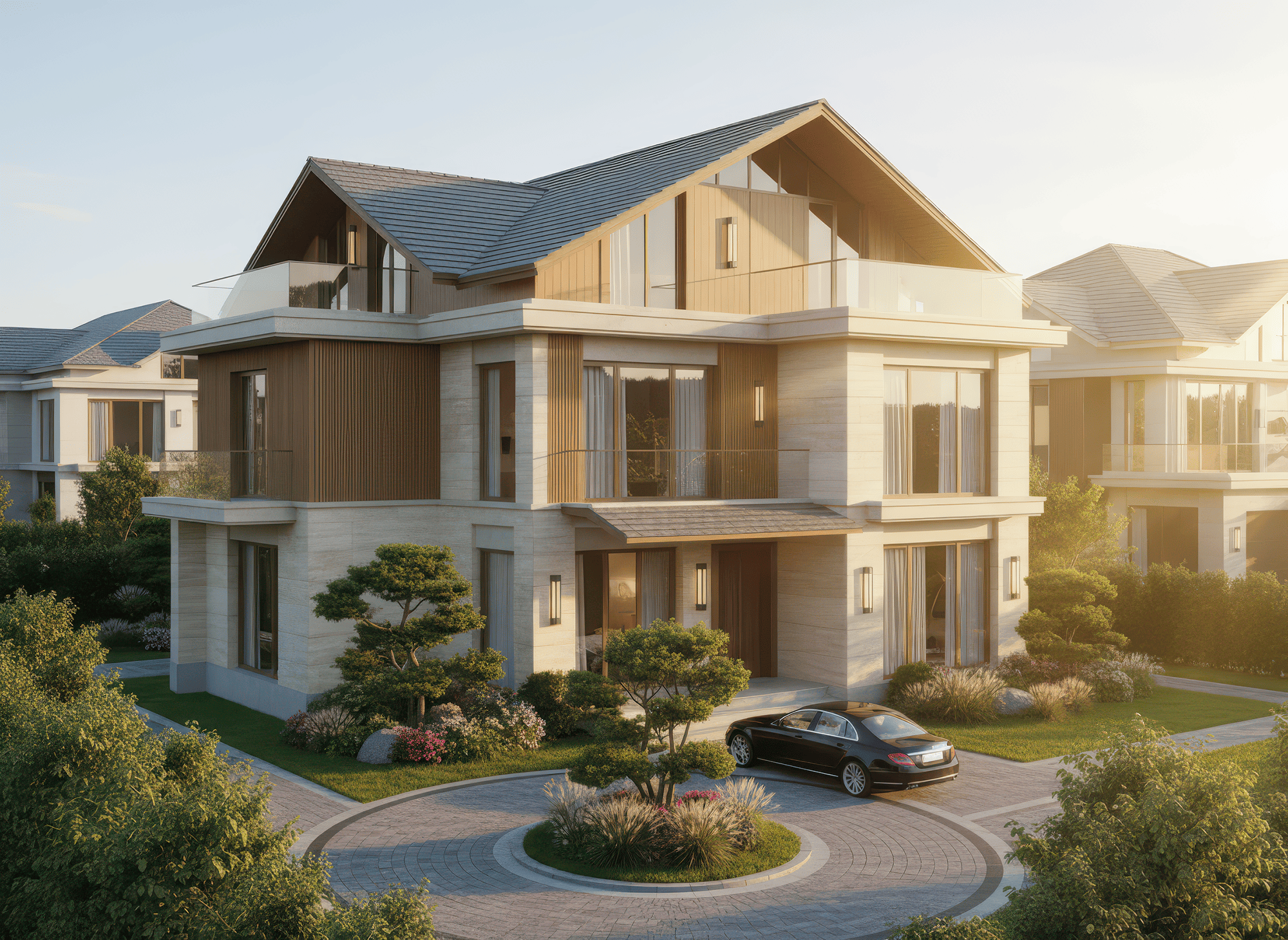 Nhà 3 tầng mái Nhật tân cổ điển nổi bật với mái dốc thấp kết hợp phào chỉ, cột trụ và chi tiết hoa văn tinh xảo, tạo nên vẻ sang trọng và thanh lịch đặc trưng của tân cổ điển. Kiến trúc chú trọng tỷ lệ cân đối giữa các tầng, hệ thống cửa sổ, ban công và mặt tiền, mang đến sự hài hòa và cân bằng thẩm mỹ. Màu sắc thường là tông trung tính kết hợp điểm nhấn vàng, trắng hoặc kem, cùng vật liệu cao cấp như đá, gạch và kính, giúp biệt thự vừa giữ được nét cổ điển tinh tế, vừa hiện đại và tiện nghi.