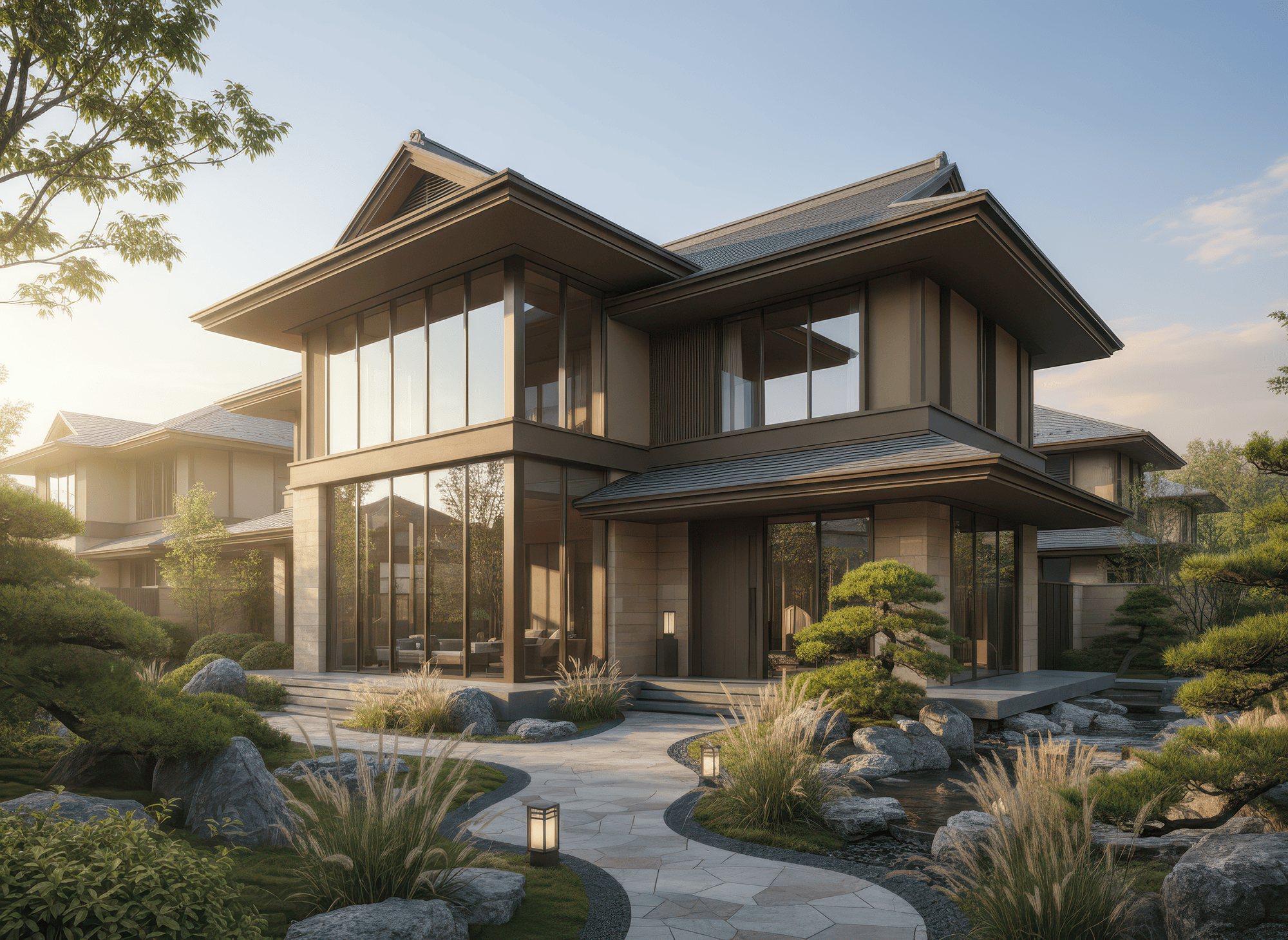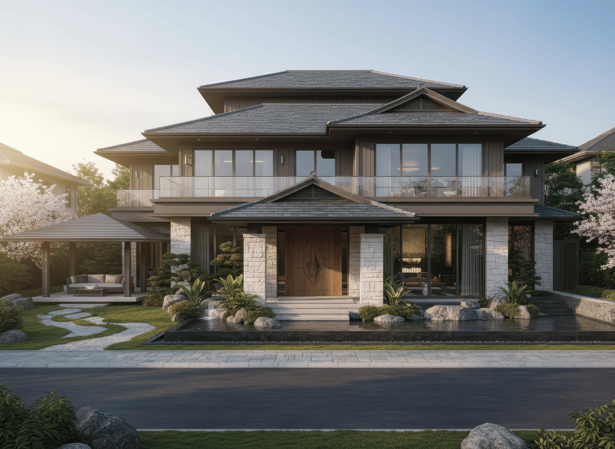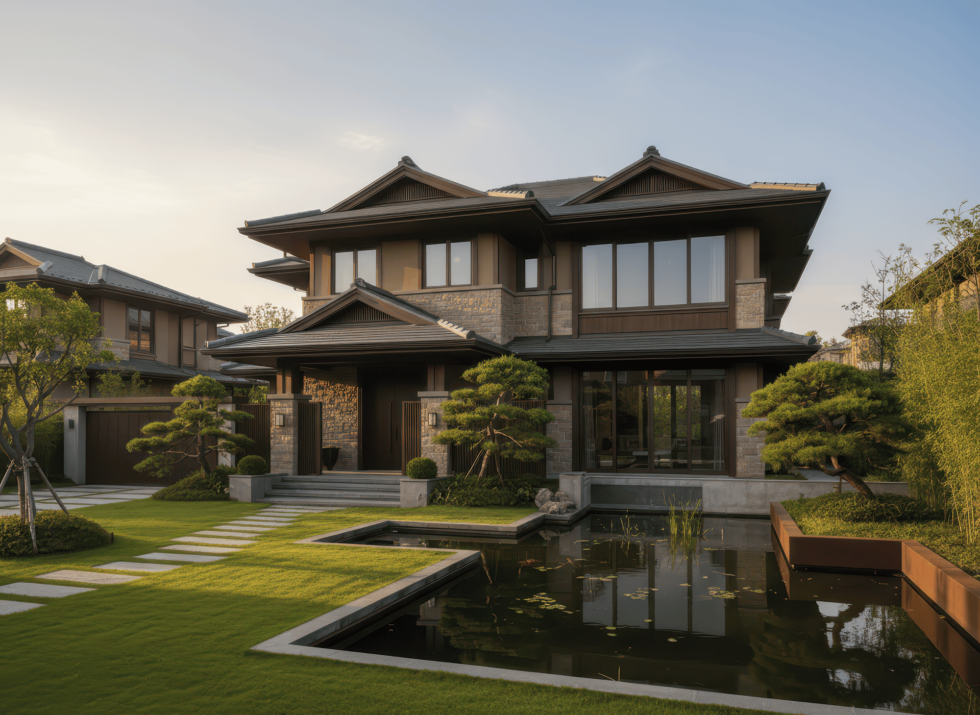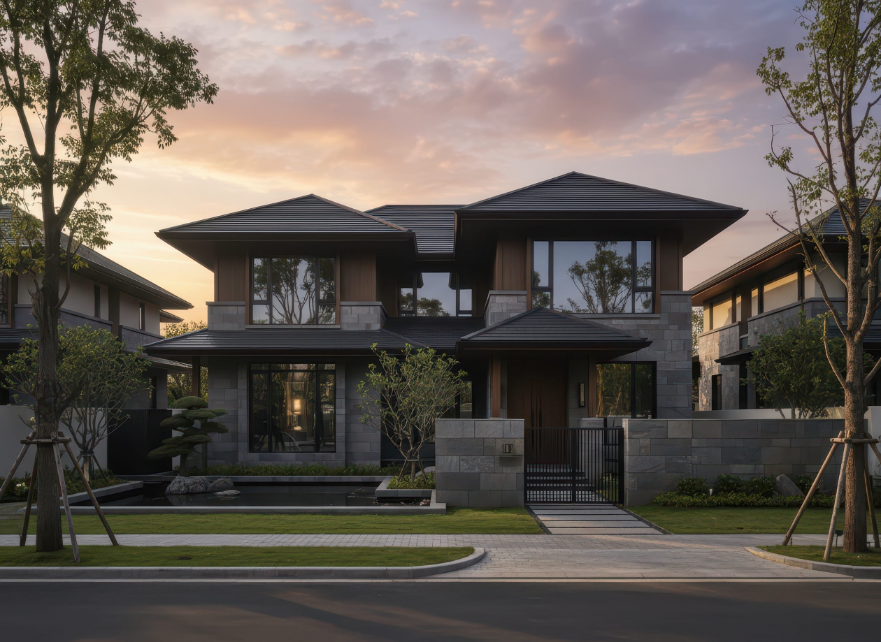 Mái Nhật là mái dốc thấp, nhiều lớp, đường nét gọn gàng đặc trưng phong cách Nhật Bản, giúp thoát nước tốt và tạo vẻ thanh thoát cho nhà.