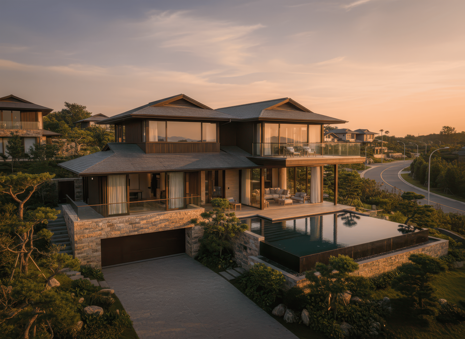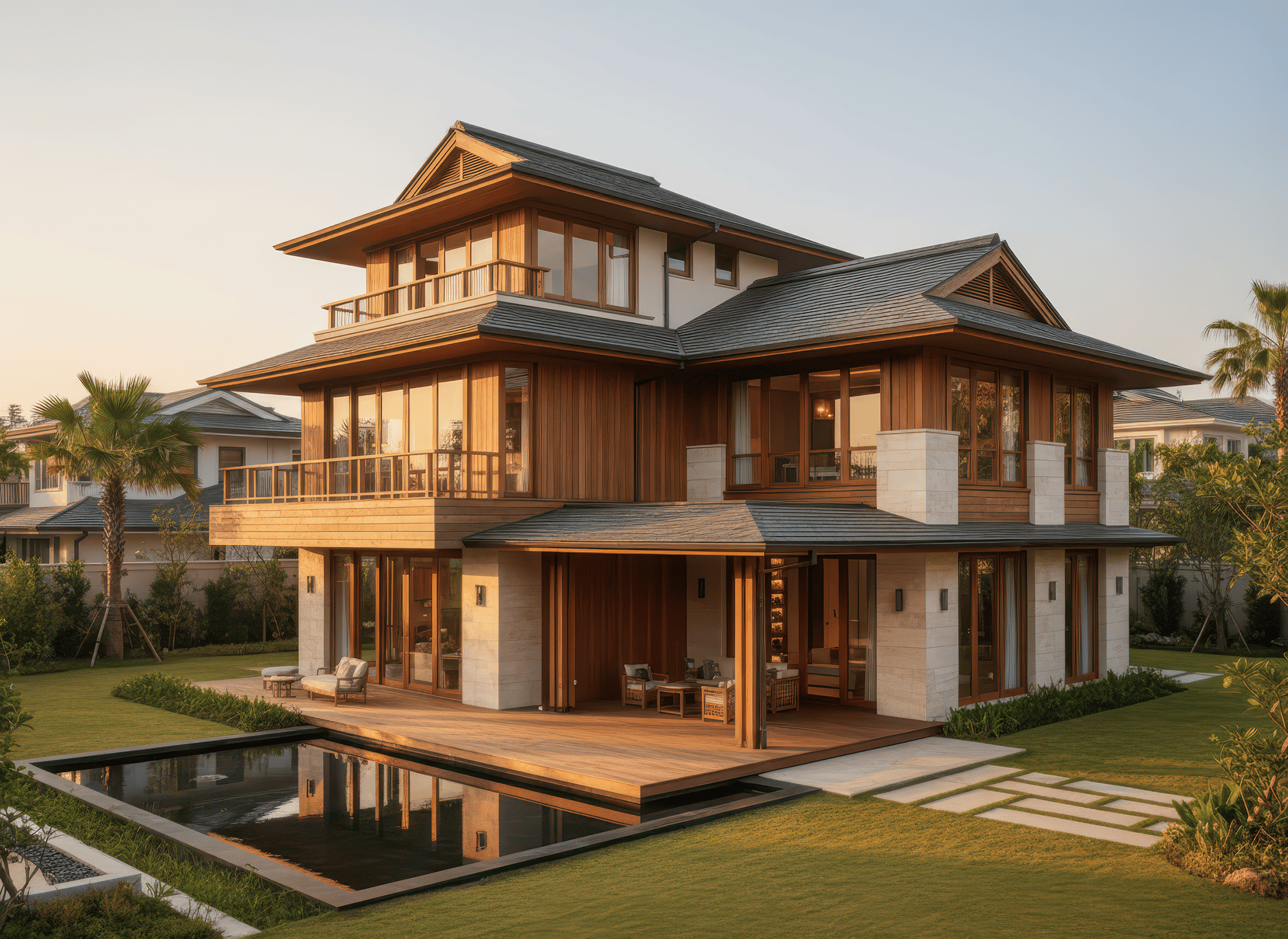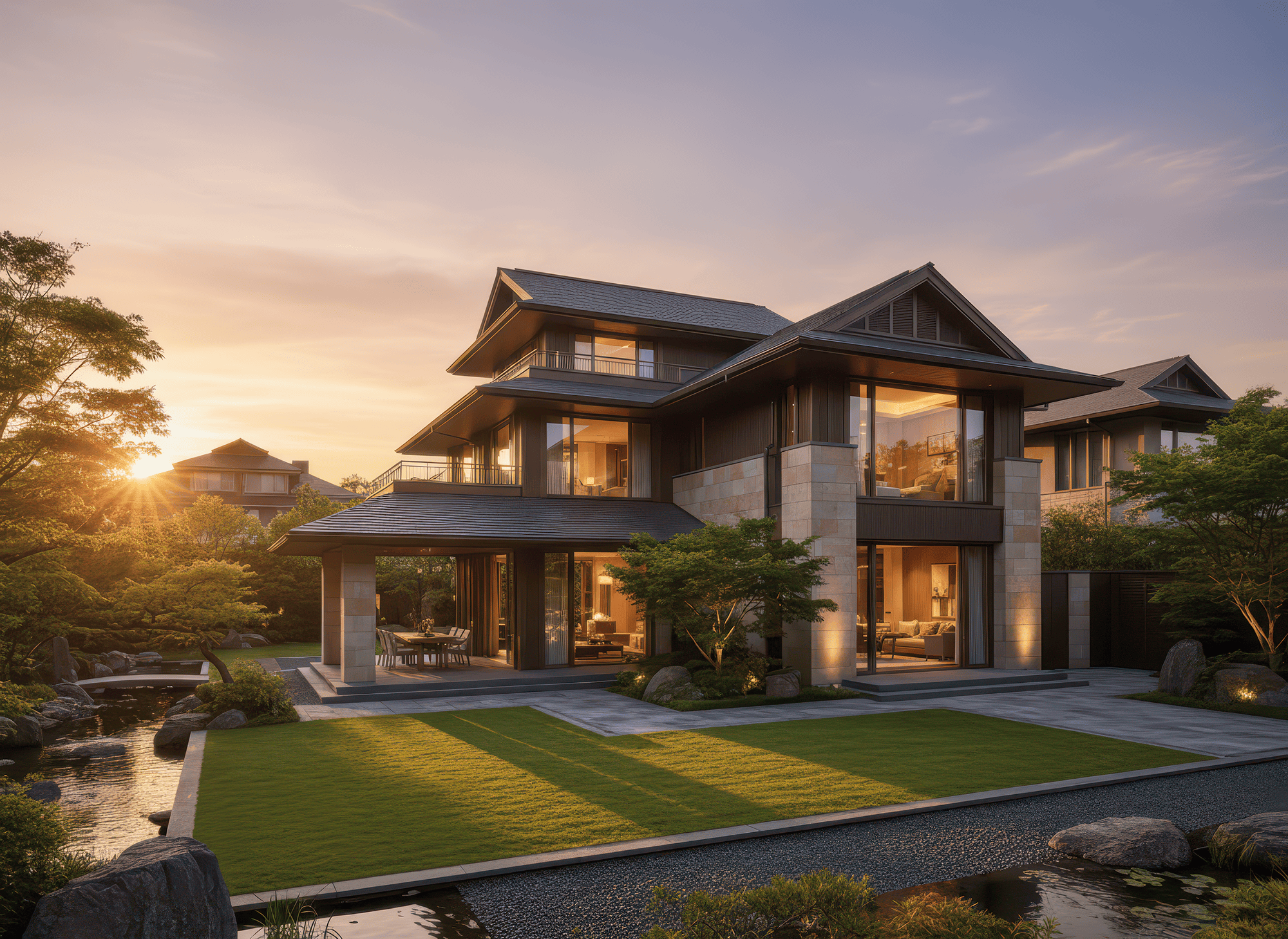 Mái Nhật là mái dốc thấp, nhiều lớp, đường nét gọn gàng đặc trưng phong cách Nhật Bản, giúp thoát nước tốt và tạo vẻ thanh thoát cho nhà.