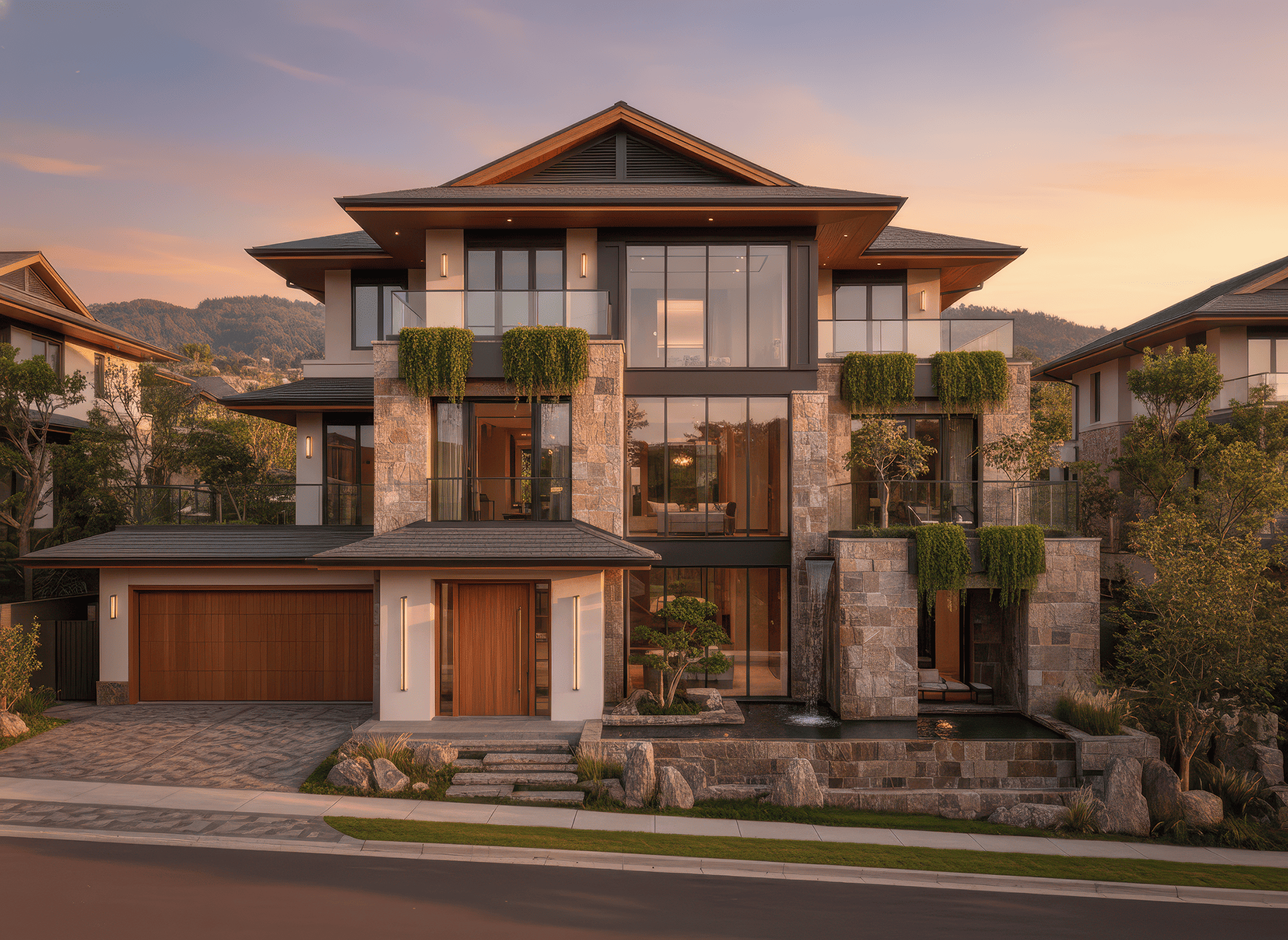 Thiết kế nhà 3 tầng mái Nhật có mặt tiền đẹp tận dụng vật liệu như kính, gỗ và đá trang trí để tôn lên vẻ sang trọng nhưng vẫn gần gũi tự nhiên