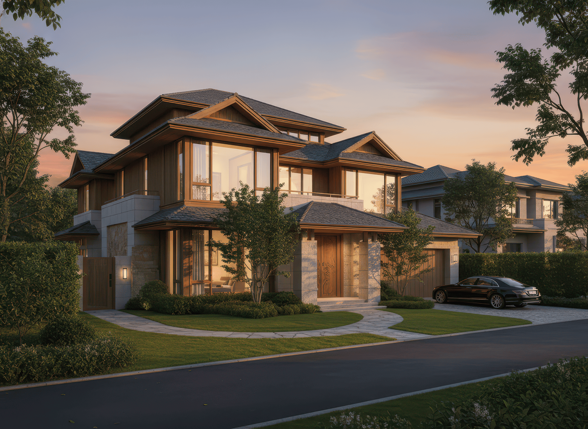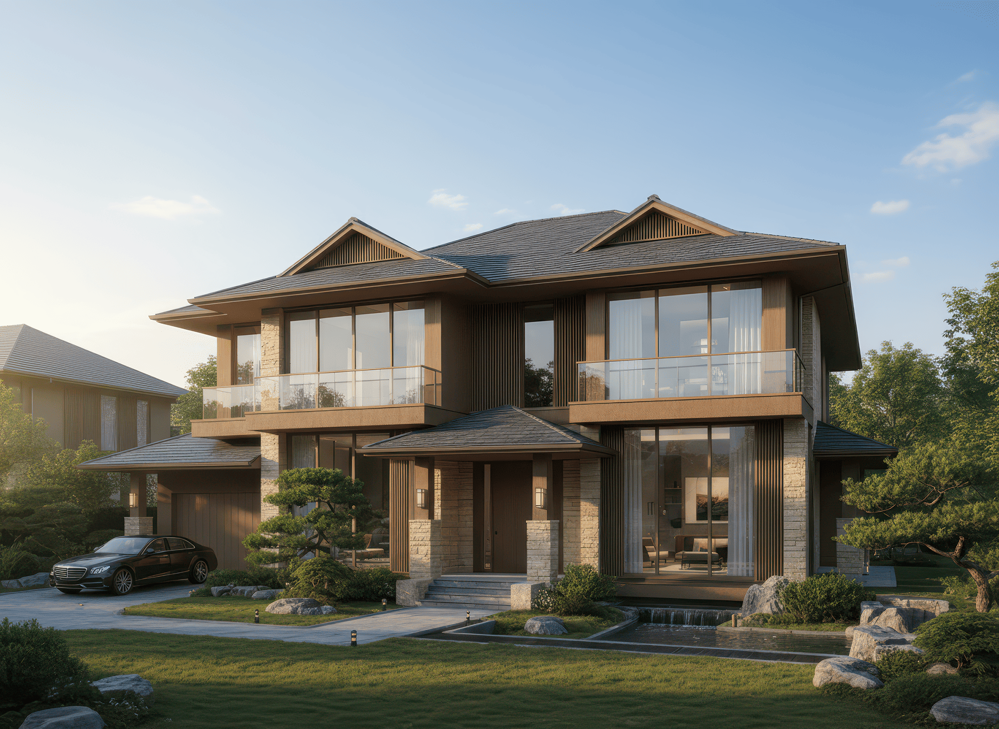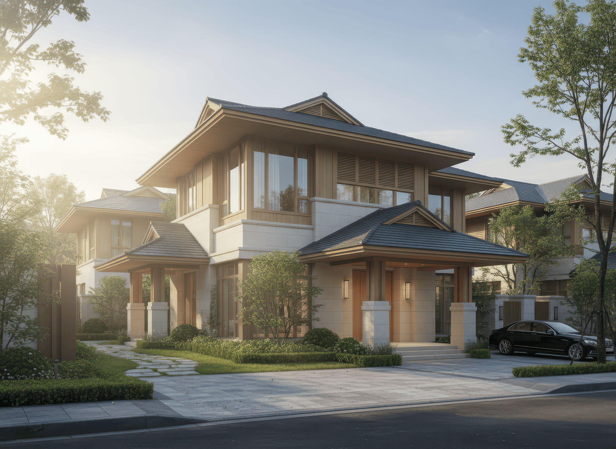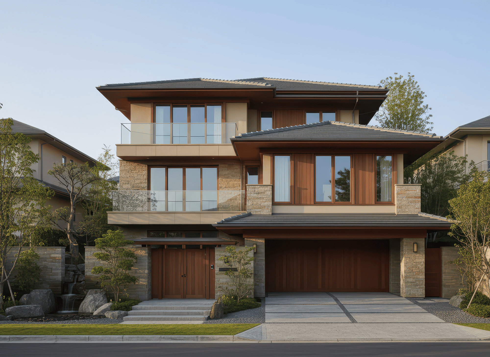 Thiết kế mái Nhật nhiều lớp giúp tăng chiều sâu mặt tiền, mang đến vẻ mềm mại nhưng vẫn hiện đại