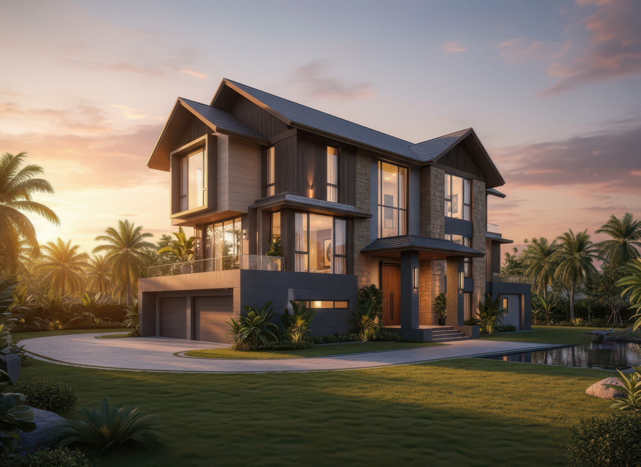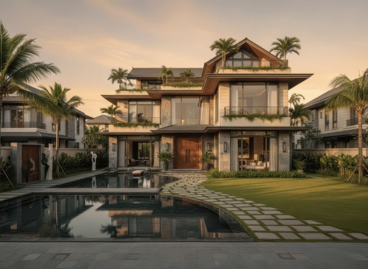BST Những mẫu thiết kế biệt thự Camille Villa phong cách Indochine do Decox thực hiện bằng công cụ AI có không gian sân vườn đậm chất nghỉ dưỡng, xem chi tiết.