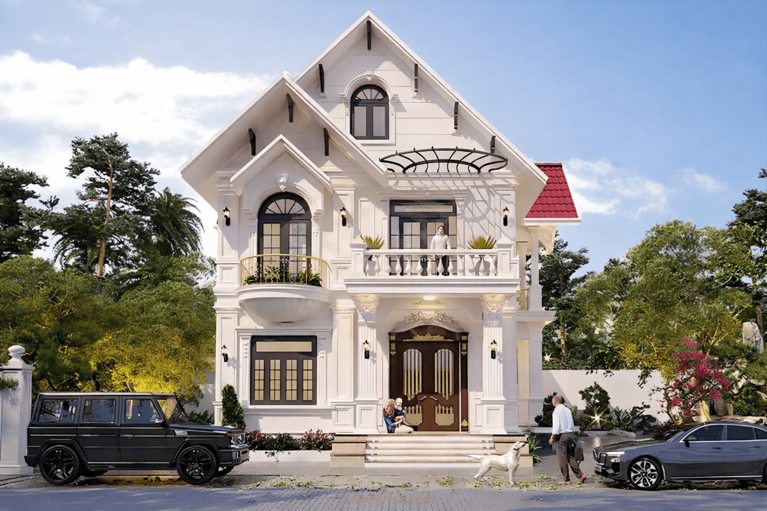 Mẫu nhà phố 2 tầng tân cổ điển phù hợp nhất với những lô đất rộng có mặt tiền từ 5-6m trở lên, chiều sâu 15-20 m hoặc hơn, nơi bề ngang đủ thoáng để kiến trúc sư có thể “phô diễn” trọn vẹn các giá trị đặc trưng của phong cách này. Kiến trúc công trình tập trung vào sự cân xứng của hình khối, mặt tiền được nhấn mạnh bằng các chi tiết trang trí tinh tế và hệ cửa bố trí đối xứng, mang đậm tinh thần cổ điển châu Âu. Bên trong, công năng được tổ chức chặt chẽ với sự phân cấp không gian rõ ràng: tầng trệt dành cho sinh hoạt chung với phòng khách lớn và sảnh đệm trang trọng; tầng trên bố trí các phòng ngủ rộng rãi, có thể kết hợp thêm phòng sinh hoạt chung hoặc phòng thờ riêng, đảm bảo sự tiện nghi và riêng tư trong quá trình sử dụng lâu dài.