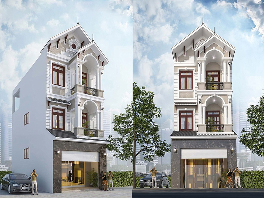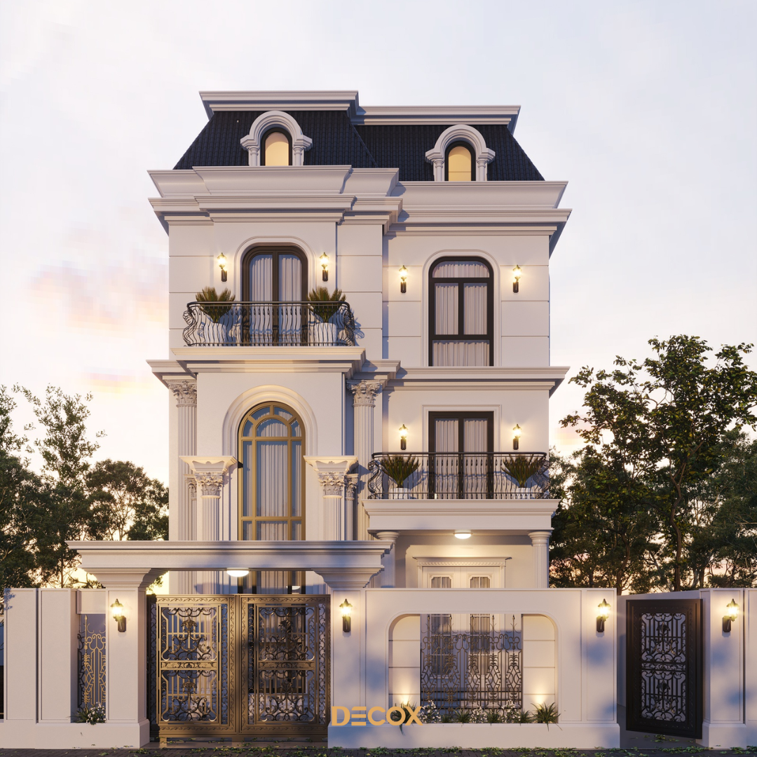 Nhà ống 3 tầng phong cách tân cổ điển được tổ chức mặt tiền theo bố cục đối xứng và trật tự hình học rõ ràng, mang lại cảm giác bề thế và trang nhã. Các tầng được phân lớp mạch lạc thông qua hệ phào chỉ, cột giả và ban công sắt mỹ thuật, tạo chiều sâu thị giác và những điểm nhấn trang trí đặc trưng của ngôn ngữ cổ điển. Bảng màu sáng như trắng, kem hoặc vàng nhạt góp phần tôn lên vẻ sang trọng, đồng thời làm dịu tỷ lệ cao của nhà phố trong bối cảnh mặt tiền hẹp. Tổng thể công trình mang cảm giác vững chãi và giàu chiều sâu hình thức, phù hợp với gia chủ yêu thích giá trị cổ điển và một mặt tiền nổi bật, có dấu ấn giữa dãy phố đô thị.