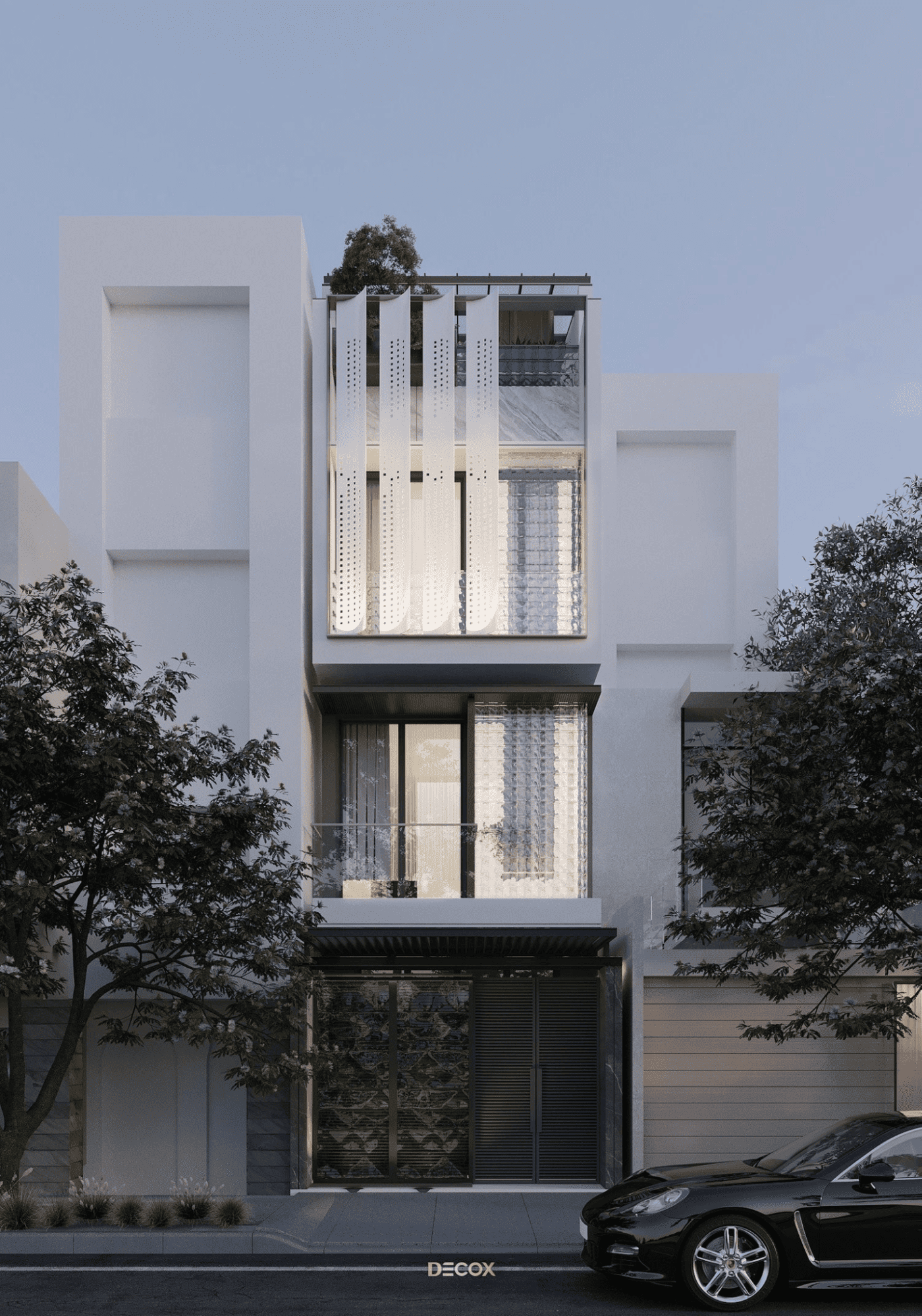 Với mặt tiền 5m và chiều sâu 20m, công trình có điều kiện cân bằng giữa trục đứng và trục ngang, tạo tỷ lệ tổng thể ổn định và dễ hình thành nhịp kiến trúc. Mặt tiền vì thế có thể chia thành hai nhịp hoặc tạo mảng nhấn rõ ràng, trong khi ban công được mở rộng hơn, kết hợp bồn cây hoặc lam che nắng để tăng chiều sâu và lớp lang.