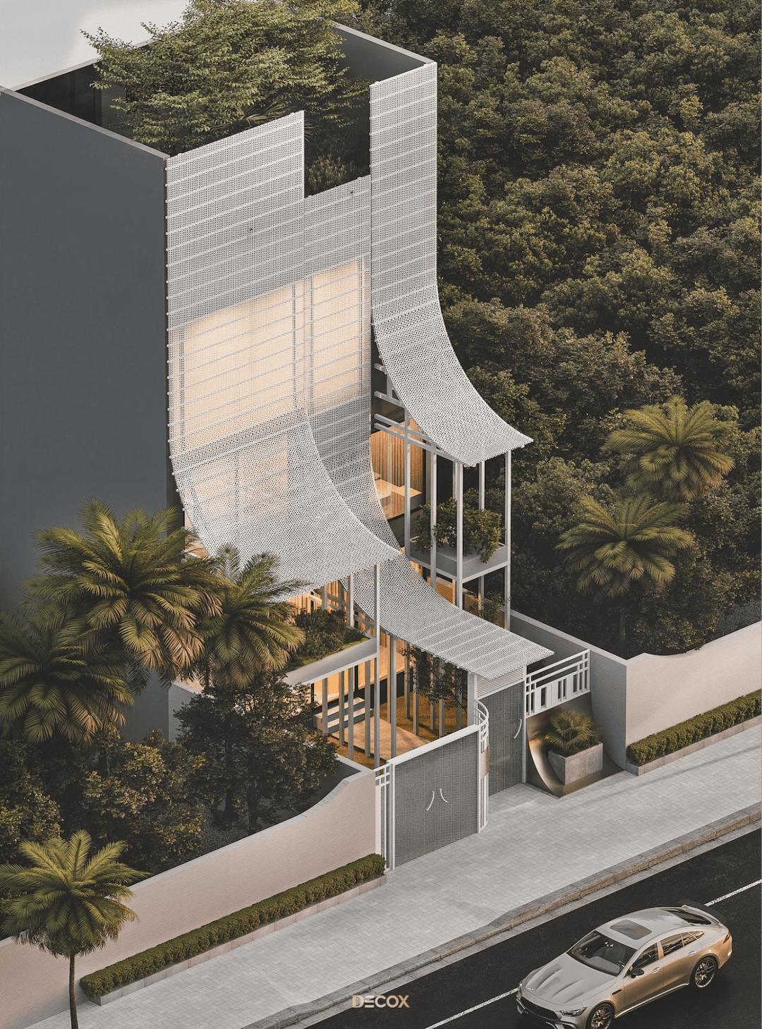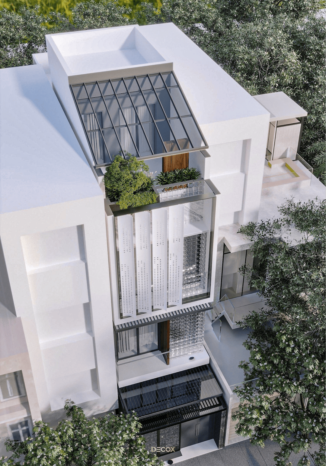 Thiết kế nhà 4 tầng dạng ống trên lô đất mặt tiền từ 4-6m có đặc thù nhà cao và sâu, là giải pháp kiến trúc tối ưu để khai thác triệt để giá trị sử dụng theo chiều cao, đặc biệt phù hợp cho các gia đình đa thế hệ hoặc mô hình kết hợp ở và kinh doanh. Diện mạo mặt tiền với ngôn ngữ hình khối đứng dứt khoát, kết hợp cùng hệ ban công kính, lam chắn nắng và mảng xanh nghệ thuật, giúp 'ăn gian' chiều ngang.
